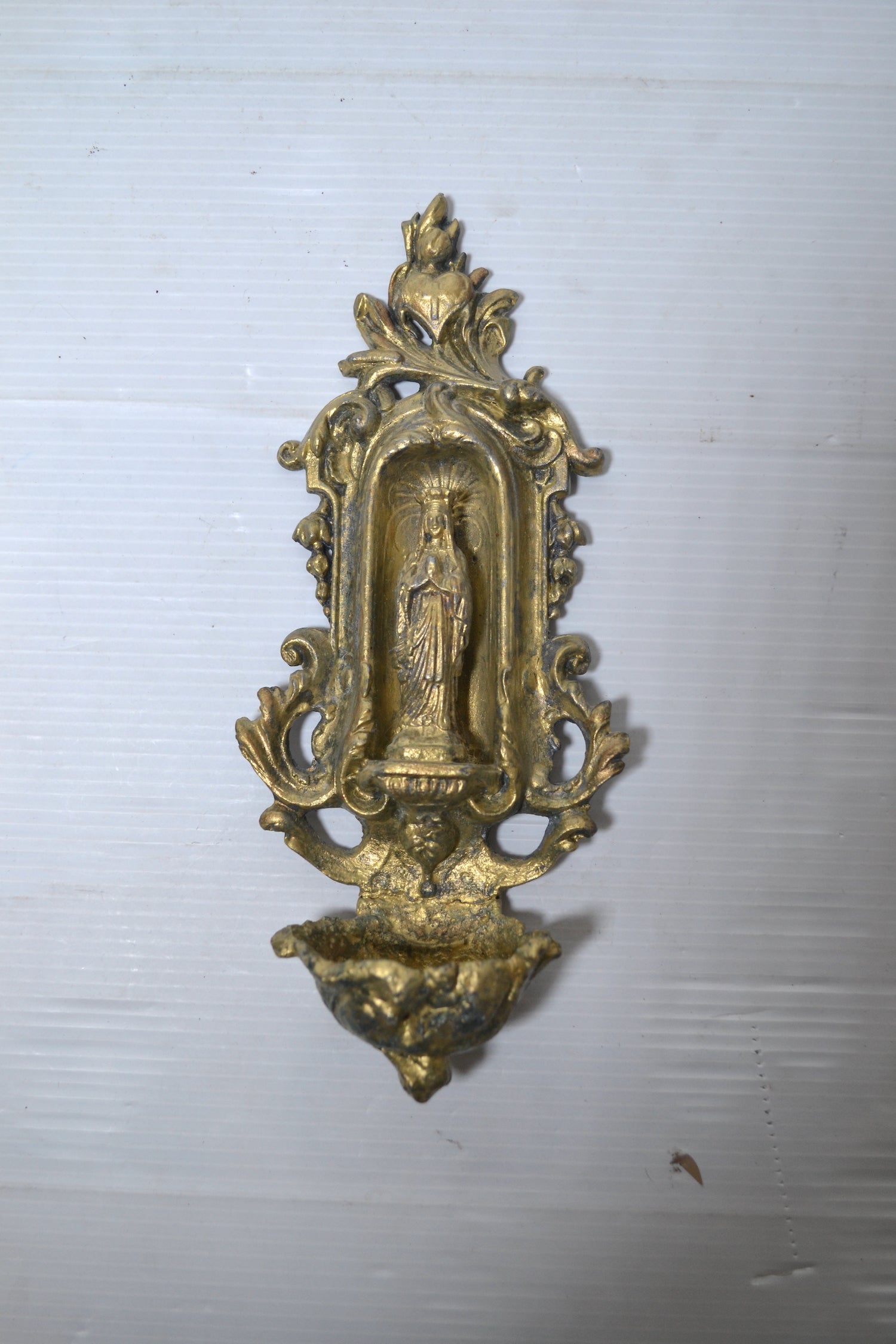Ce superbe bénitier mural en métal doré se démarque par la grande richesse de ses détails d'esprit baroque.