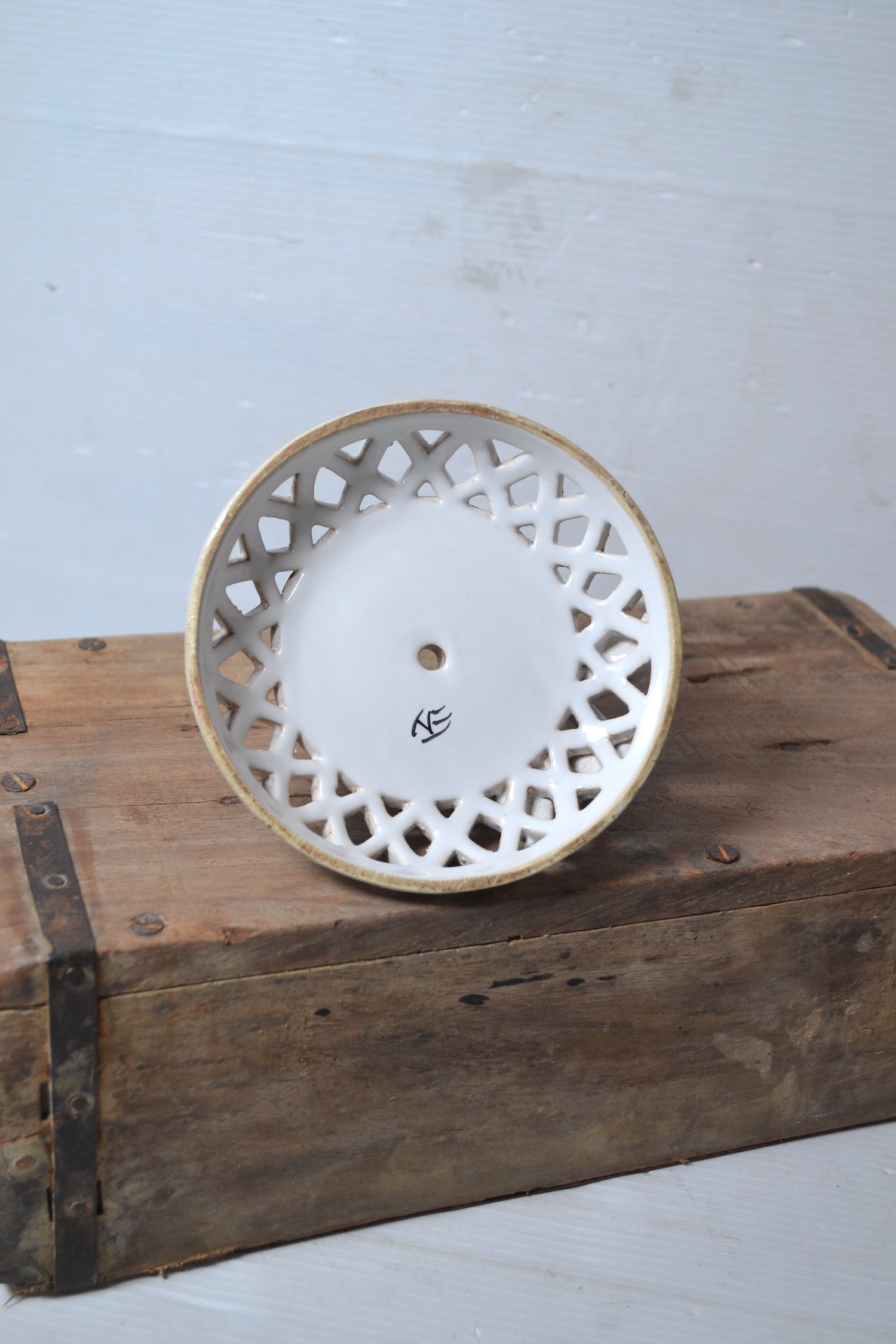 Ce très joli bougeoir rat de cave vintage en céramique se distingue tout naturellement par son côté très graphique et poétique. Il se compose en effet d'une base circulaire ajourée et géométrique et d'une anse en barbotine faite d'une branche et de feuilles. Un bougeoir particulièrement original qui se positionnera aussi bien sur une table de chevet qu'en accumulation avec d'autres bougeoirs et chandeliers sur une table basse, au centre d'une table en bois ou sur un ancien buffet parisien.