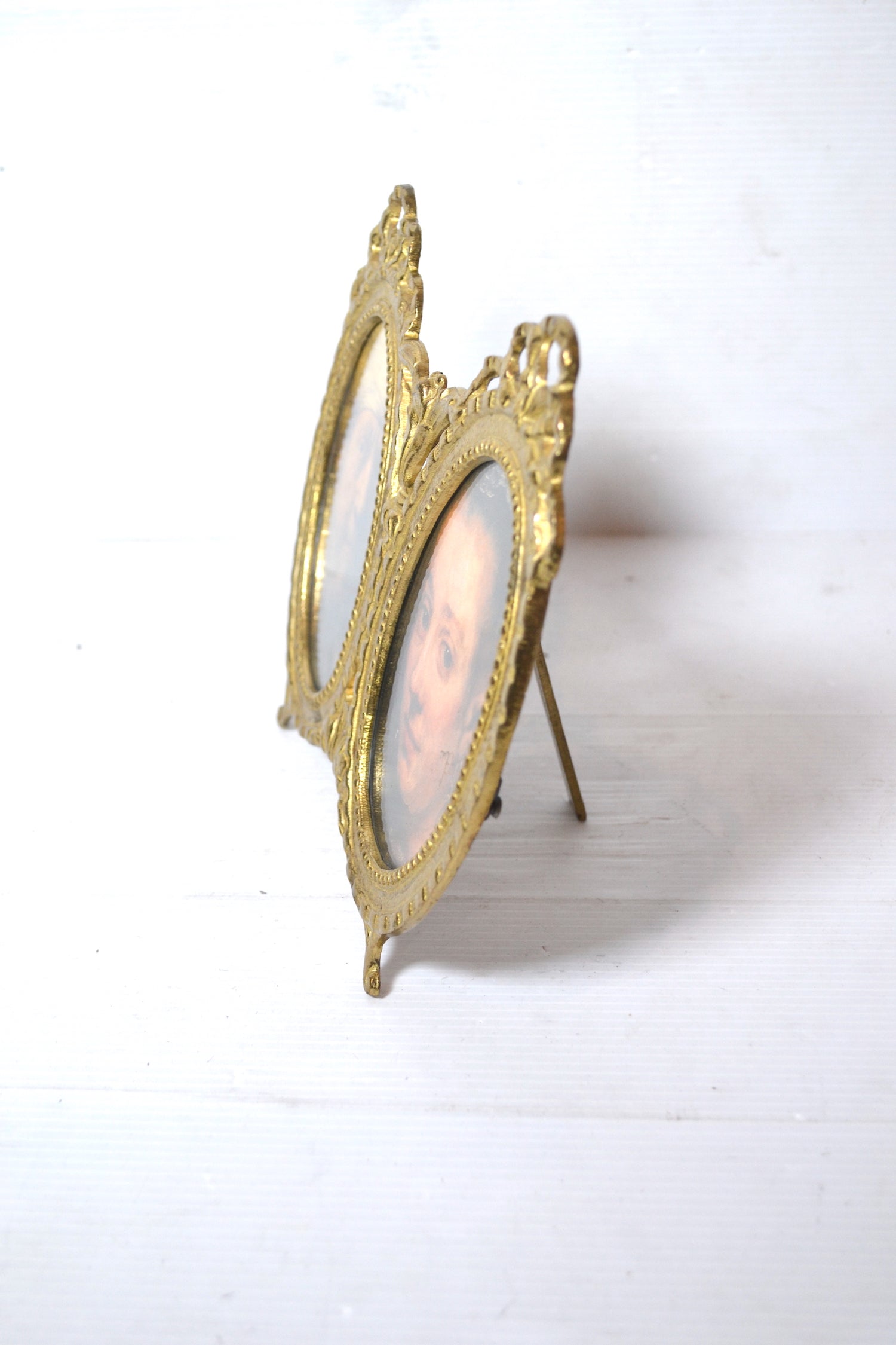 Sublimez une photo ou la peinture d'un portrait grâce à cet incroyable cadre jumeaux vintage en laiton doré à poser. Un cadre double plein de charme qui se démarque tout naturellement par ses somptueux décors en forme de nœuds.