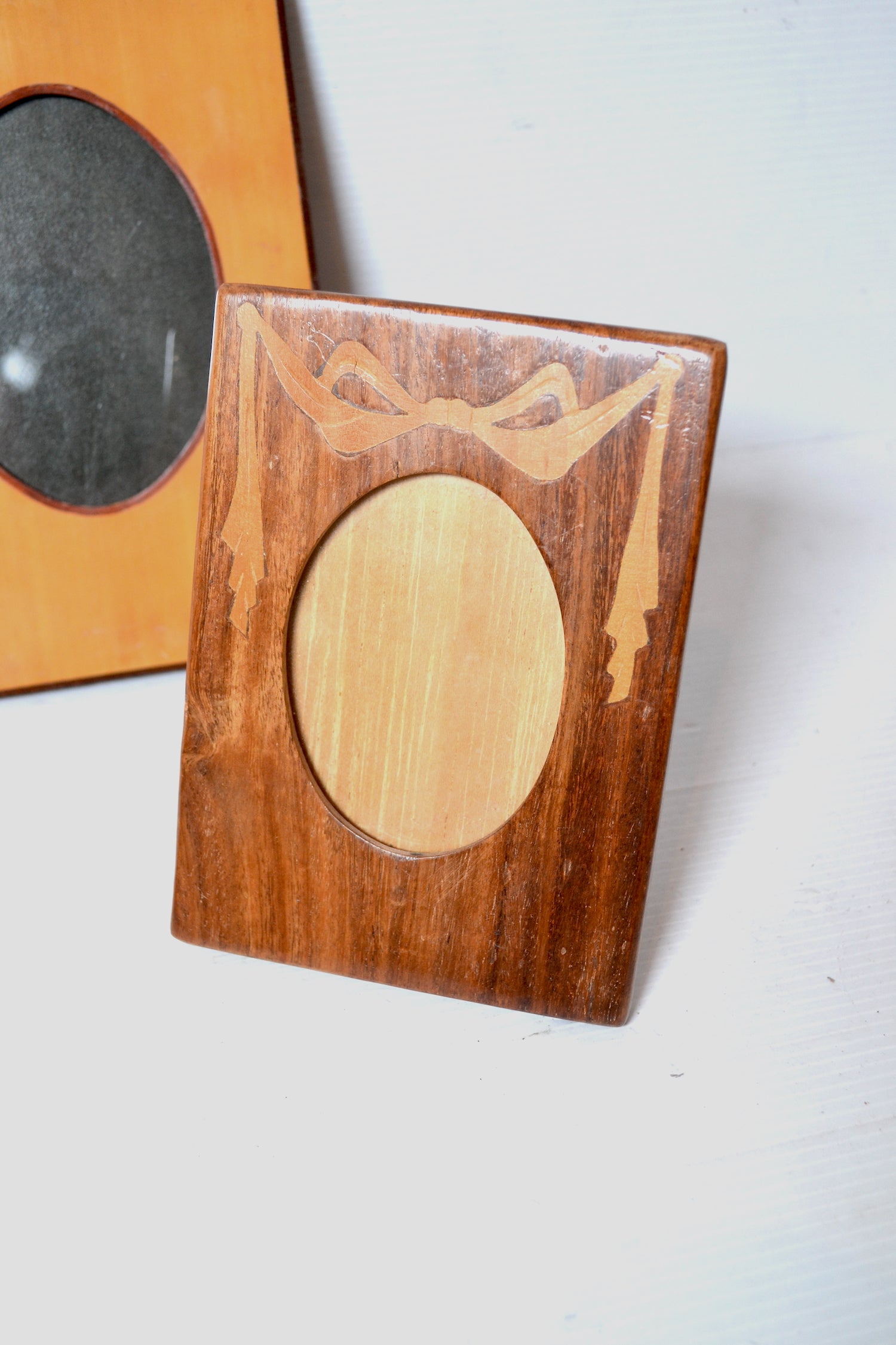 Cet ancien cadre à poser ou à suspendre se distingue aussi bien par sa belle matière qualitative et chaleureuse qu'est le bois que par son médaillon de forme ovale ou son très élégant décor en forme de nœud ruban.