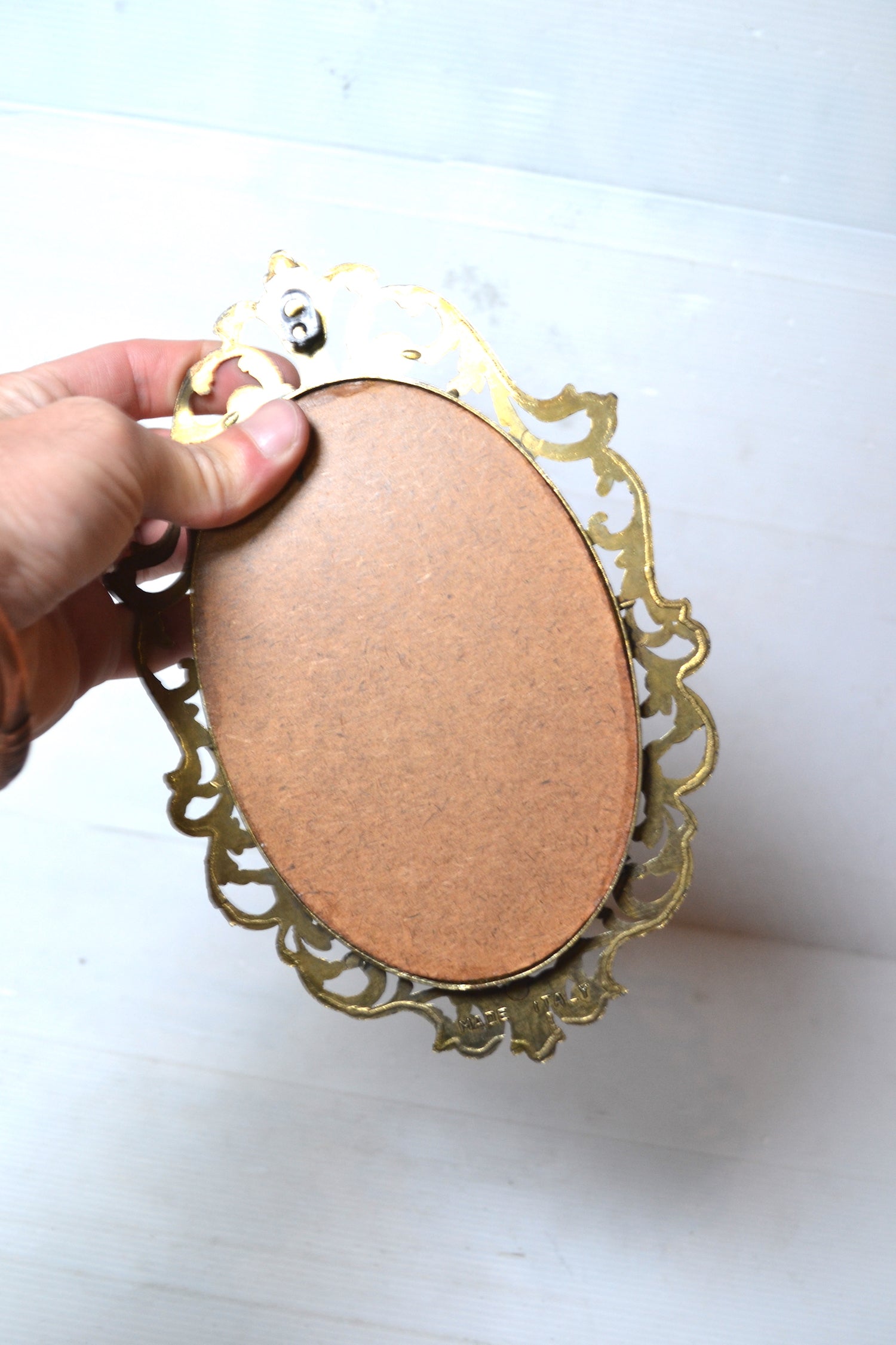 Ce joli cadre se suspendra en isolé dans une chambre tout comme il pourrait rejoindre une accumulation murale de cadres et de miroirs anciens.