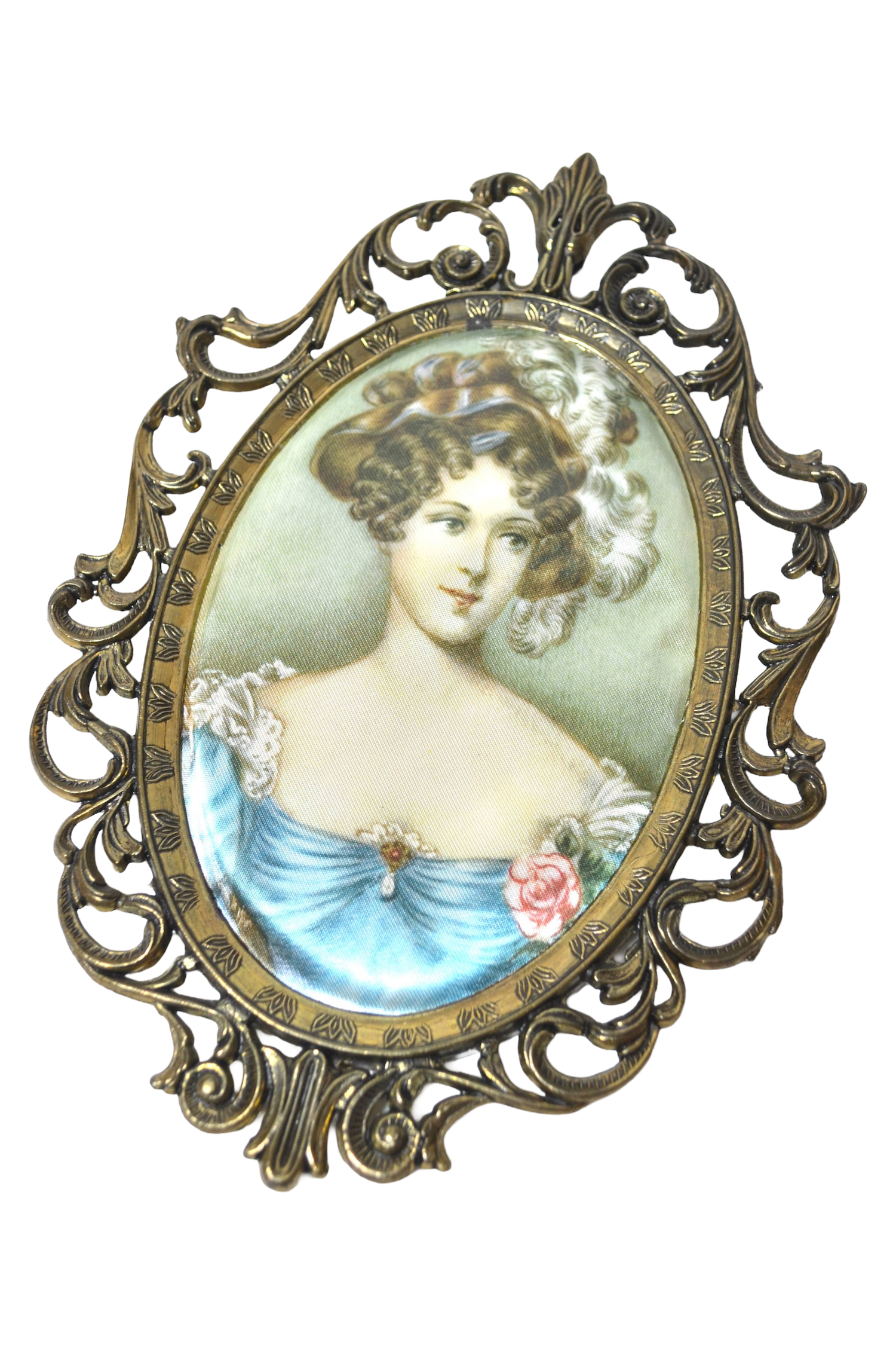 Ce joli cadre ancien en métal de style baroque renferme une belle peinture sur soie vintage. Il se distingue tout particulièrement par son cadre richement décoré orné de superbes motifs baroques. Un cadre qualitatif et particulièrement travaillé plein de poésie et de raffinement.