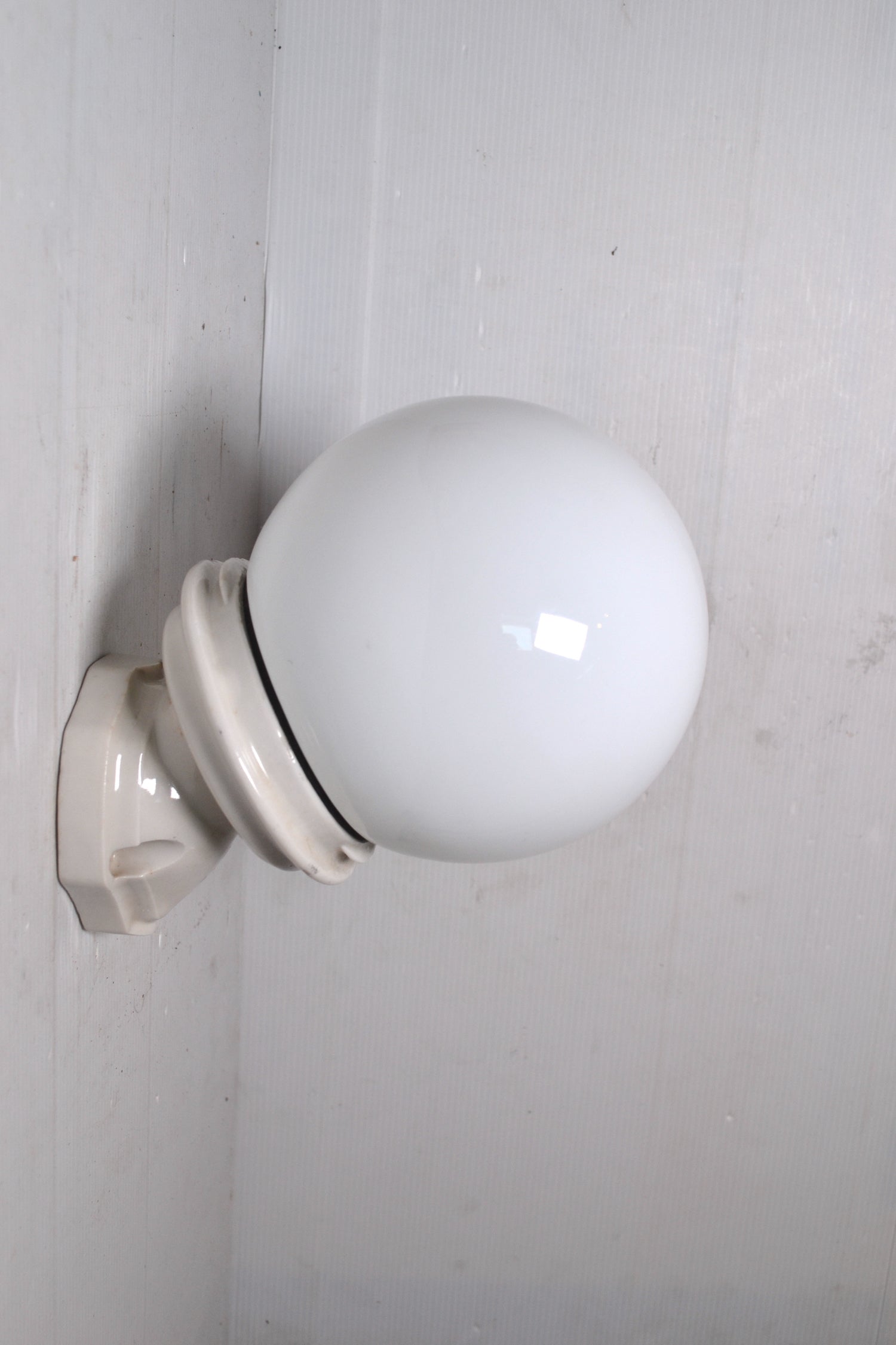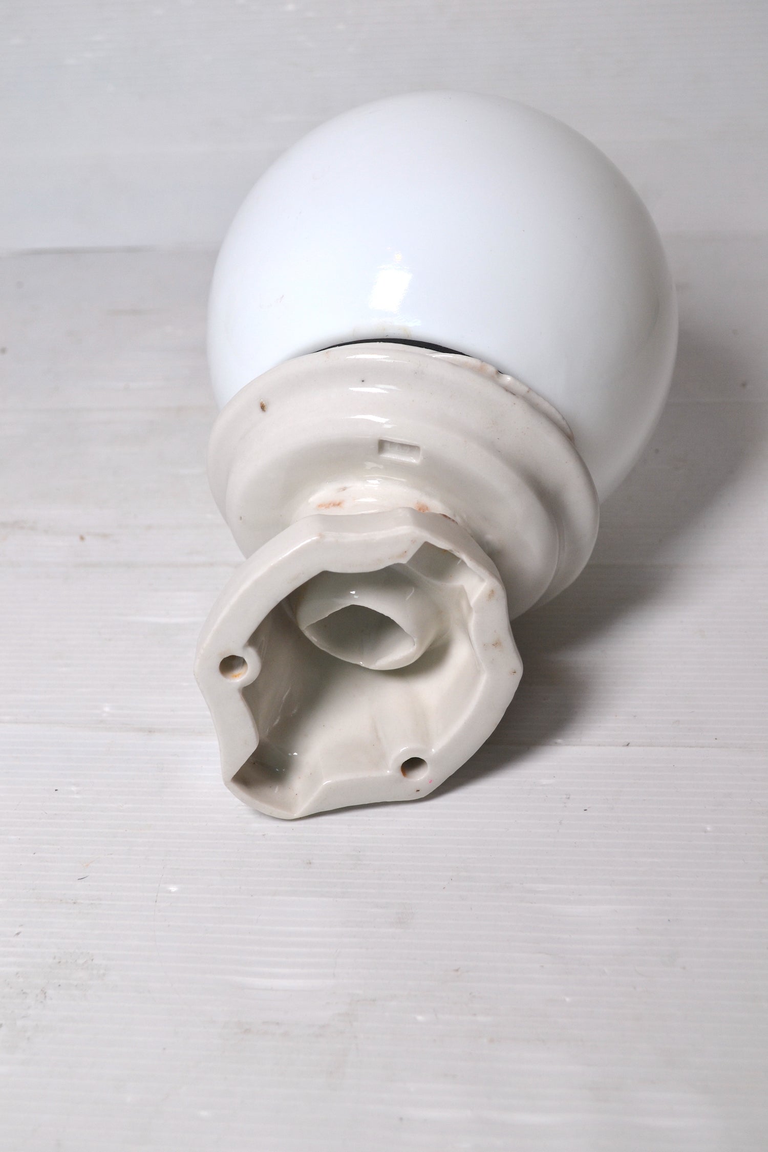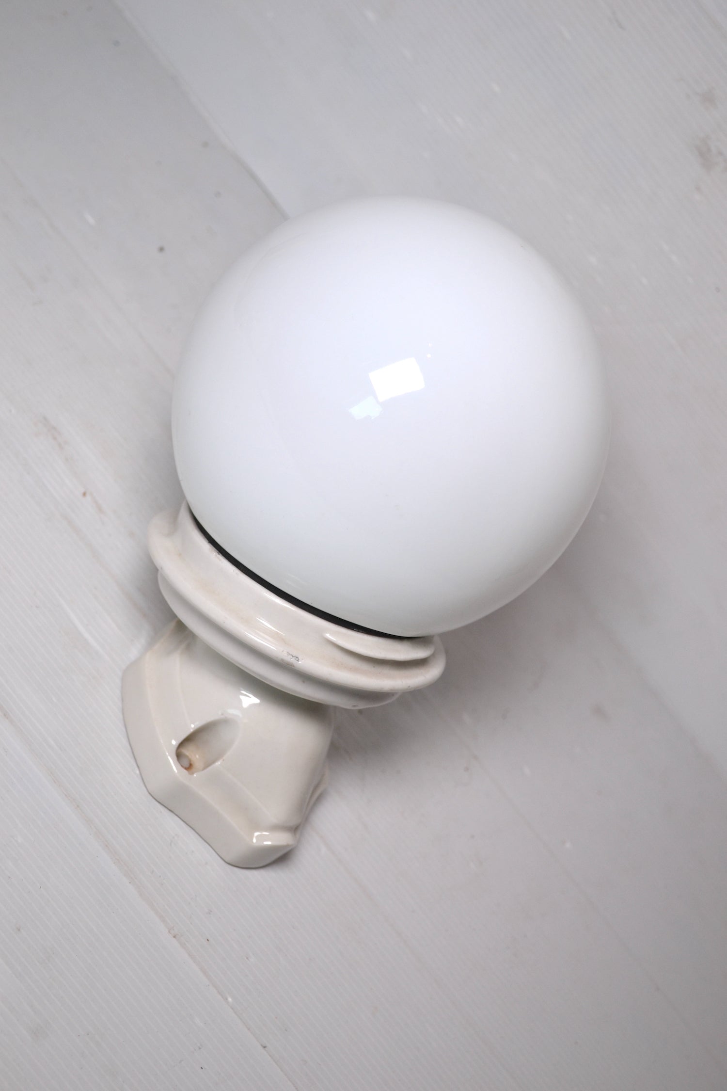 Superbe applique murale vintage de style Art Déco composée d'une base géométrique en porcelaine et d'un globe en verre laiteux.