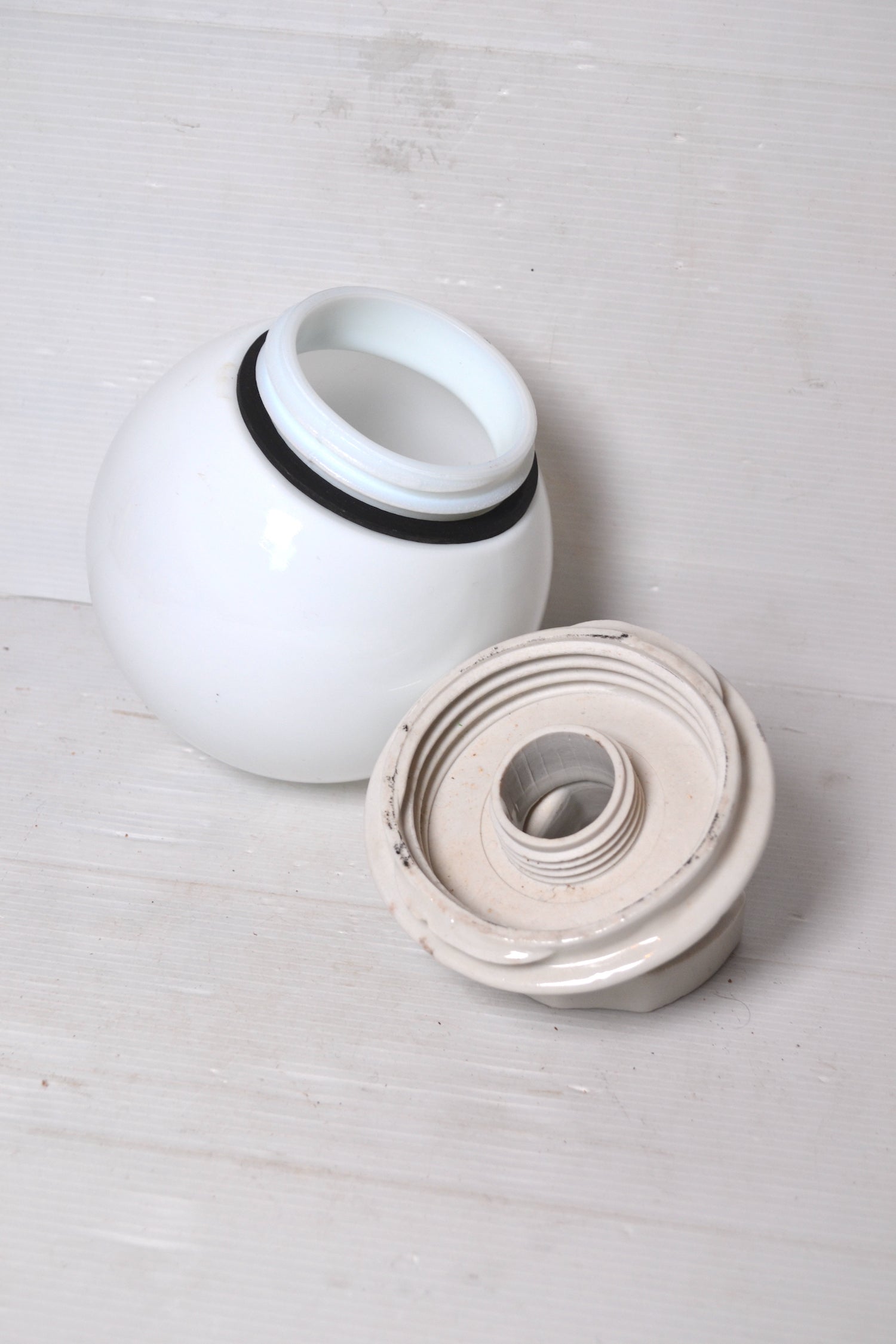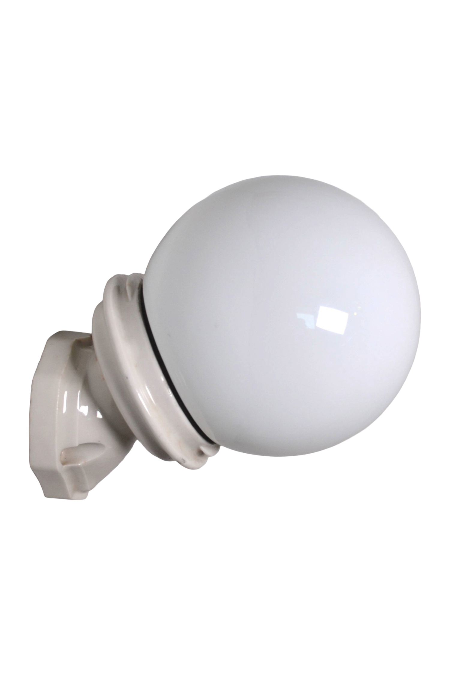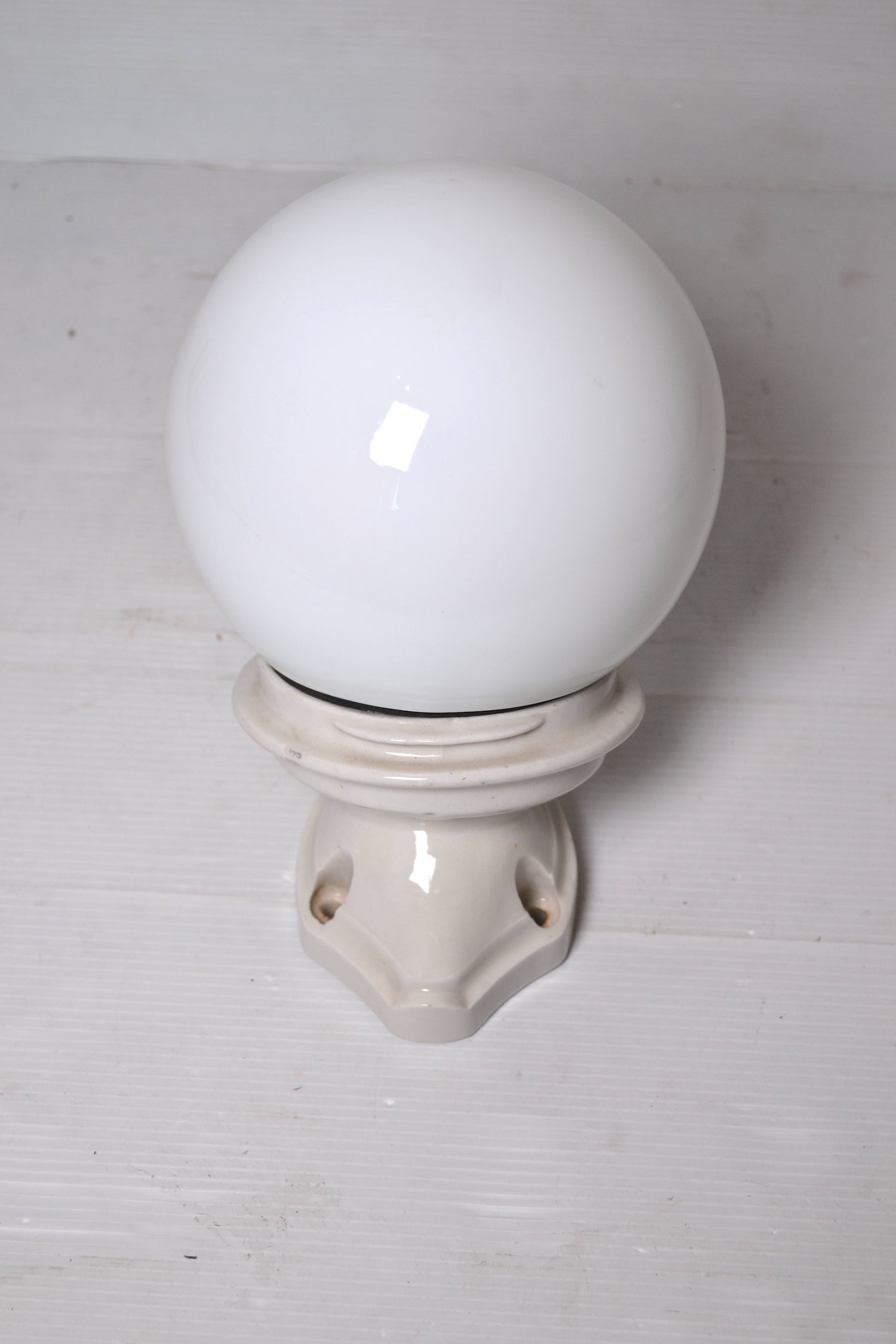 Cette superbe applique murale vintage se compose d'une base octogonale géométrique en porcelaine percée de deux trous pour pouvoir être vissée dans un mur. Un globe en verre dépoli accompagné d'un caoutchouc vient se visser sur le base.