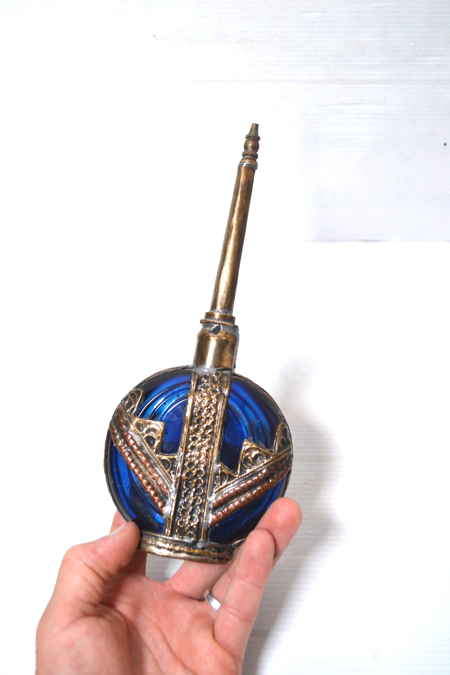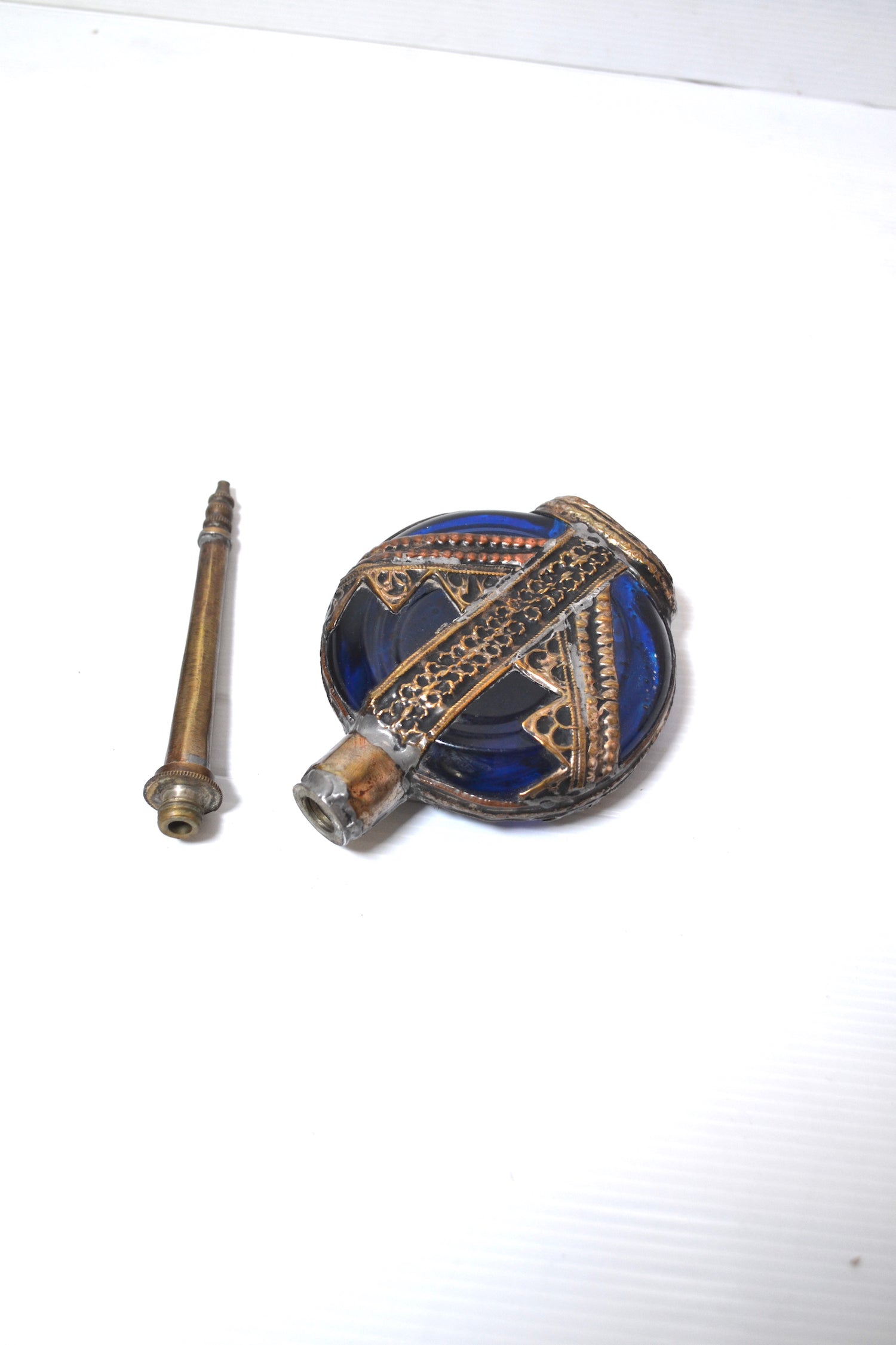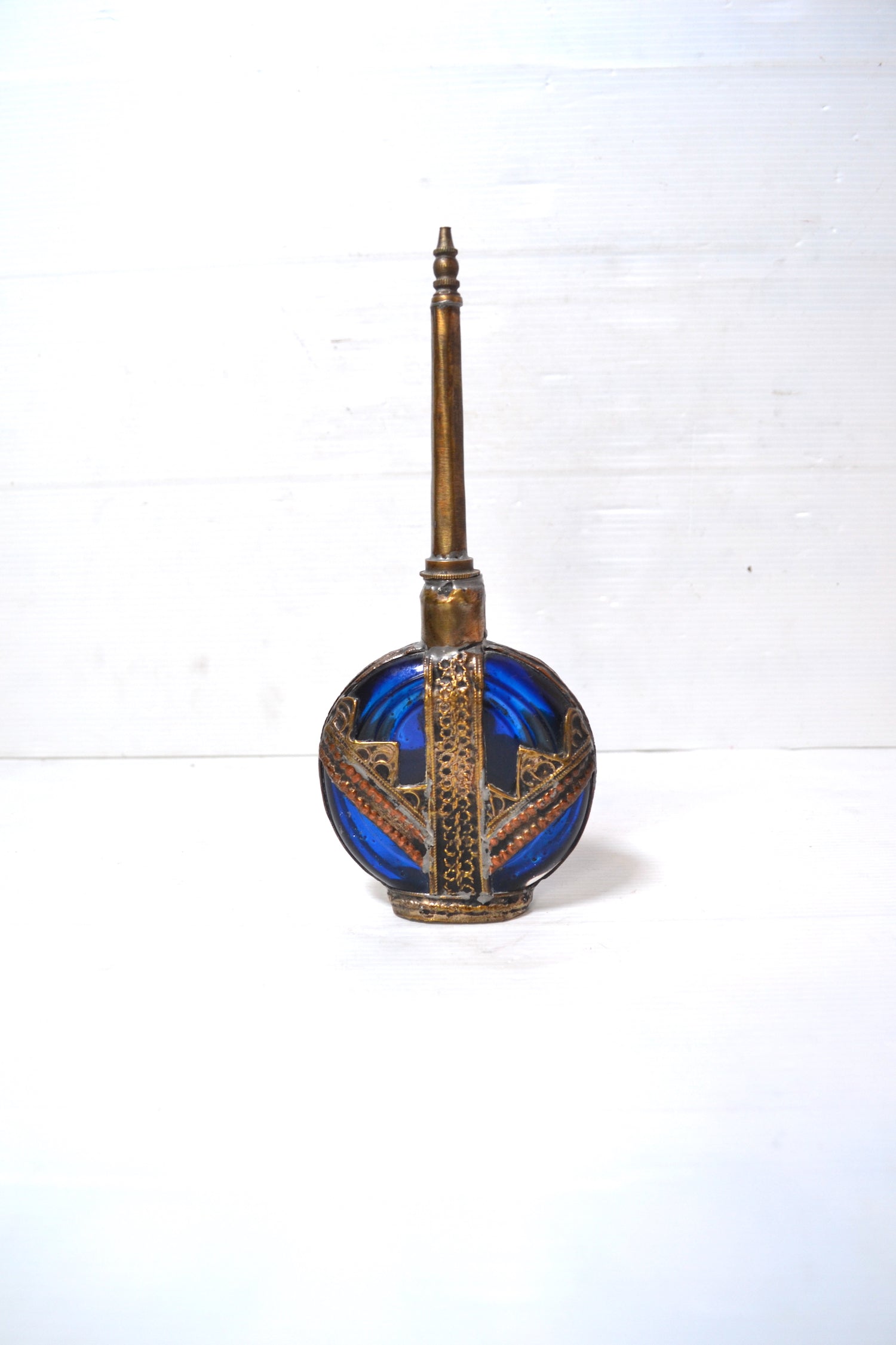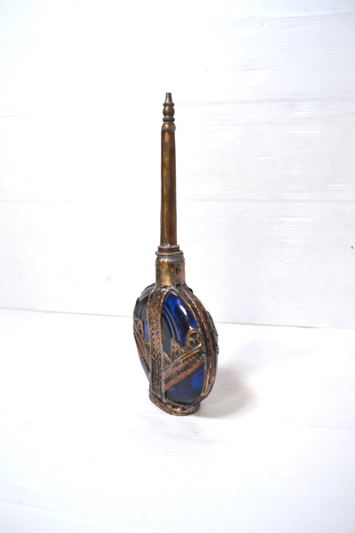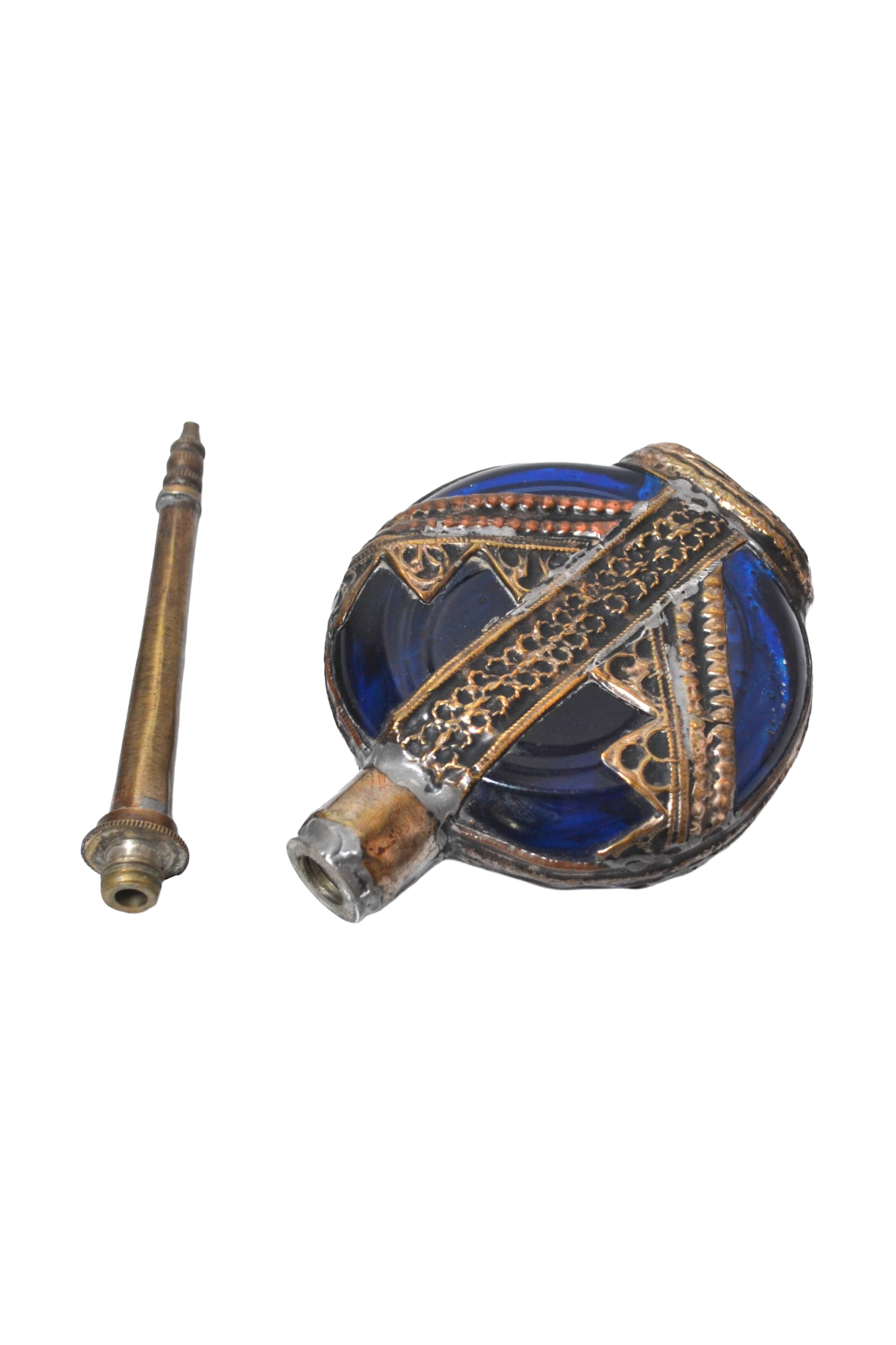 Ce superbe et très élégant objet est un ancien aspersoir ou lance-parfum oriental. Il se constitue de deux parties : la partie inférieure est une fiole en verre de couleur bleue ornée de métal argenté finement ouvragé et destinée à contenir du liquide alors que la partie supérieur se dévisse et est percée d'un trou à l'extrémité pour pouvoir asperger le parfum. Cet ancien flacon servait notamment à mélanger de la fleur d'oranger et de l'eau afin de s'asperger les mains de ce mélange parfumé.