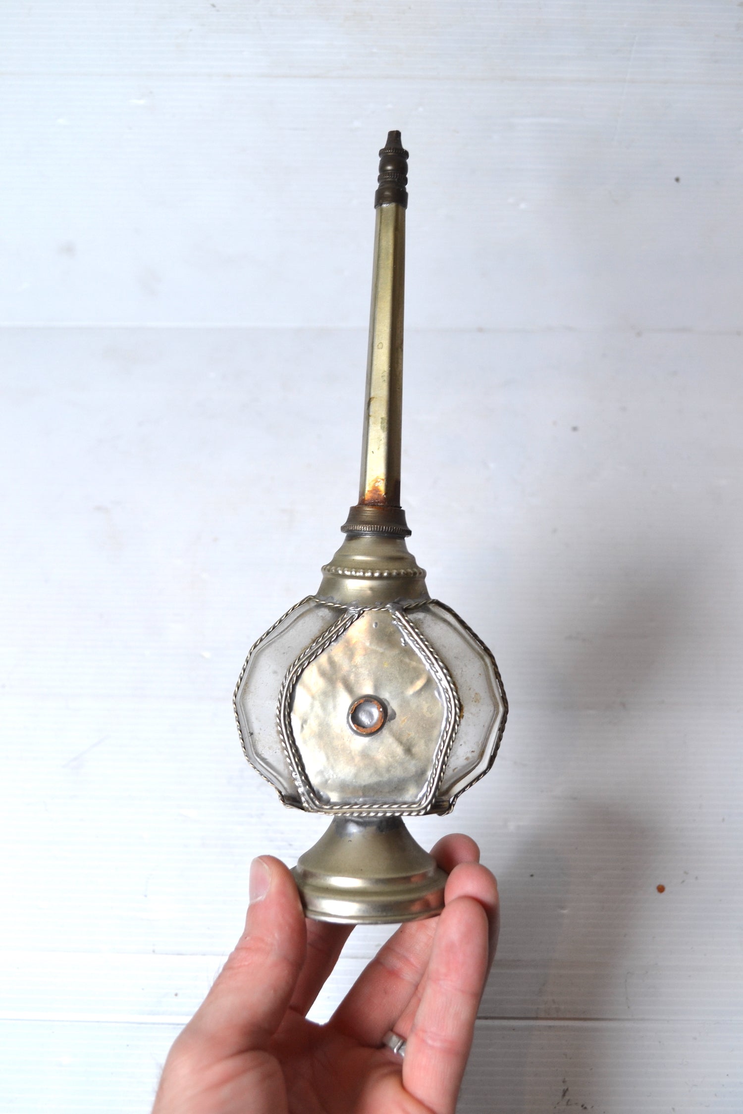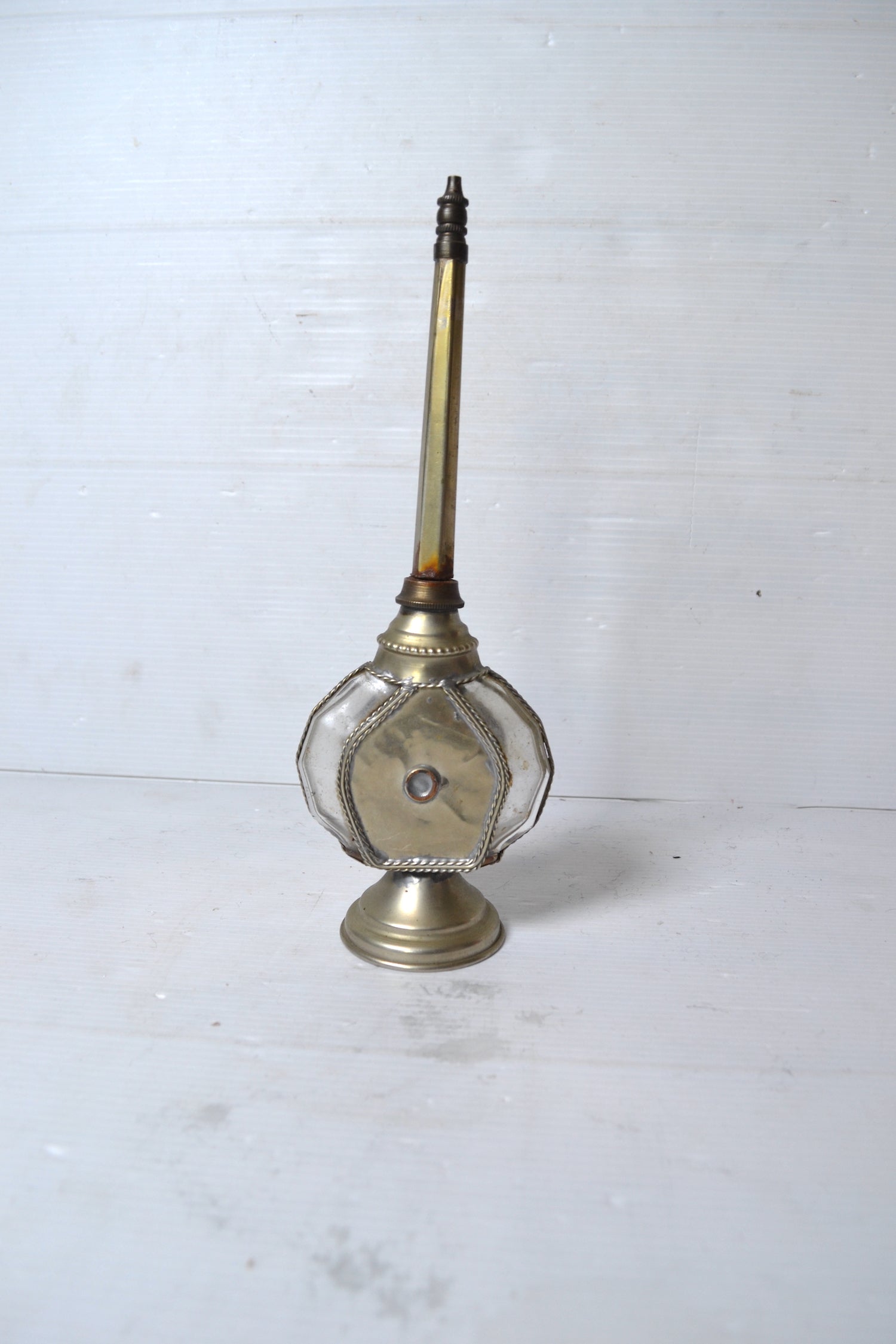 Ce superbe et très élégant objet est un ancien aspersoir ou lance-parfum oriental. Il se constitue de deux parties : la partie inférieure est une fiole en verre transparent ornée de métal argenté finement ouvragé et destinée à contenir du liquide alors que la partie supérieur se dévisse et est percée d'un trou à l'extrémité pour pouvoir asperger le parfum. Cet ancien flacon servait notamment à mélanger de la fleur d'oranger et de l'eau afin de s'asperger les mains de ce mélange parfumé.