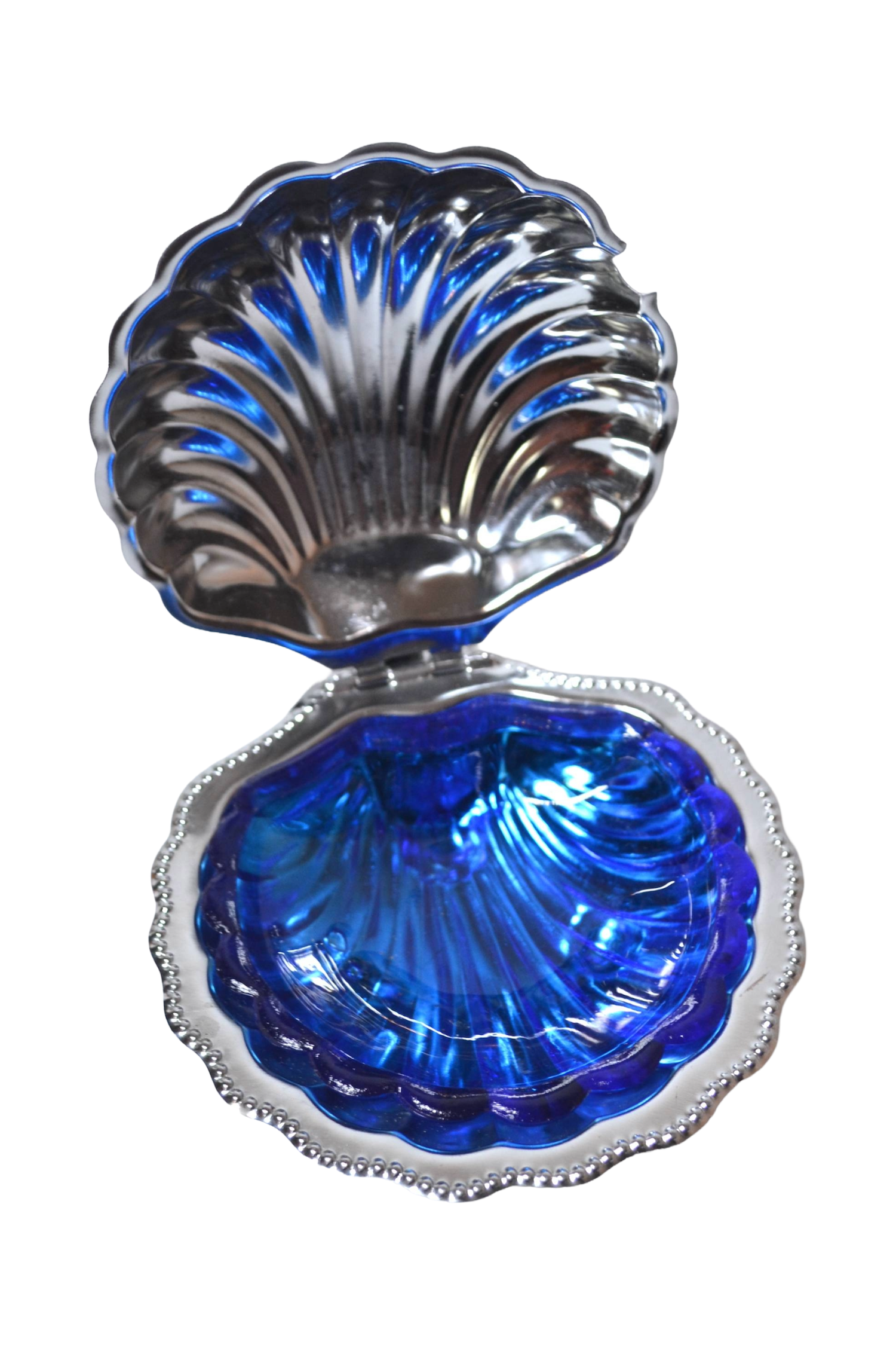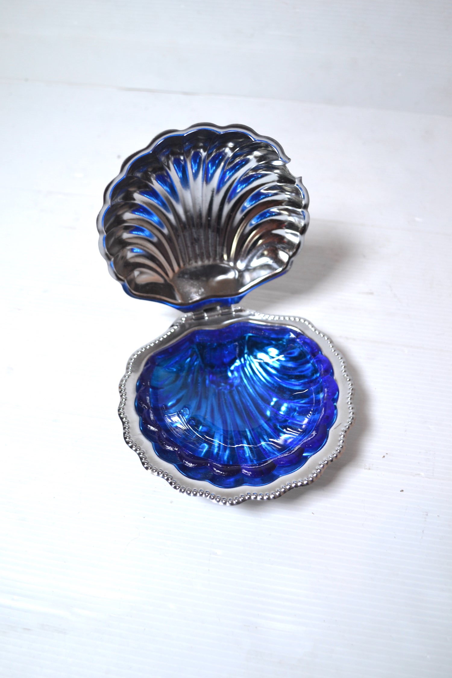 Très joli beurrier vintage en forme de coquille Saint-Jacques avec sa coupelle en verre bleue