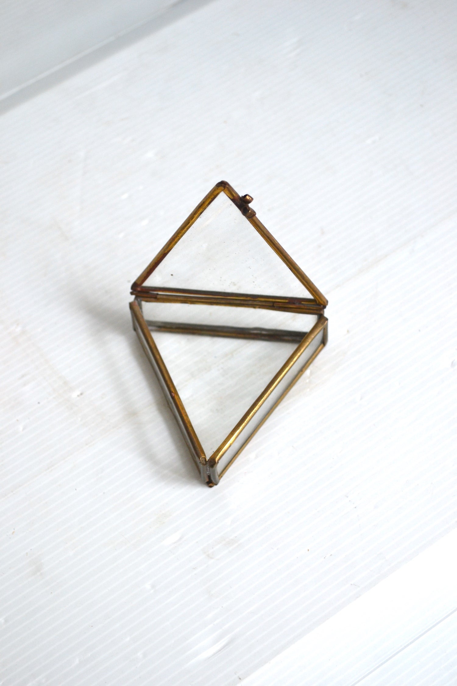 Très jolie boîte à bijoux vintage en verre et laiton de forme triangulaire