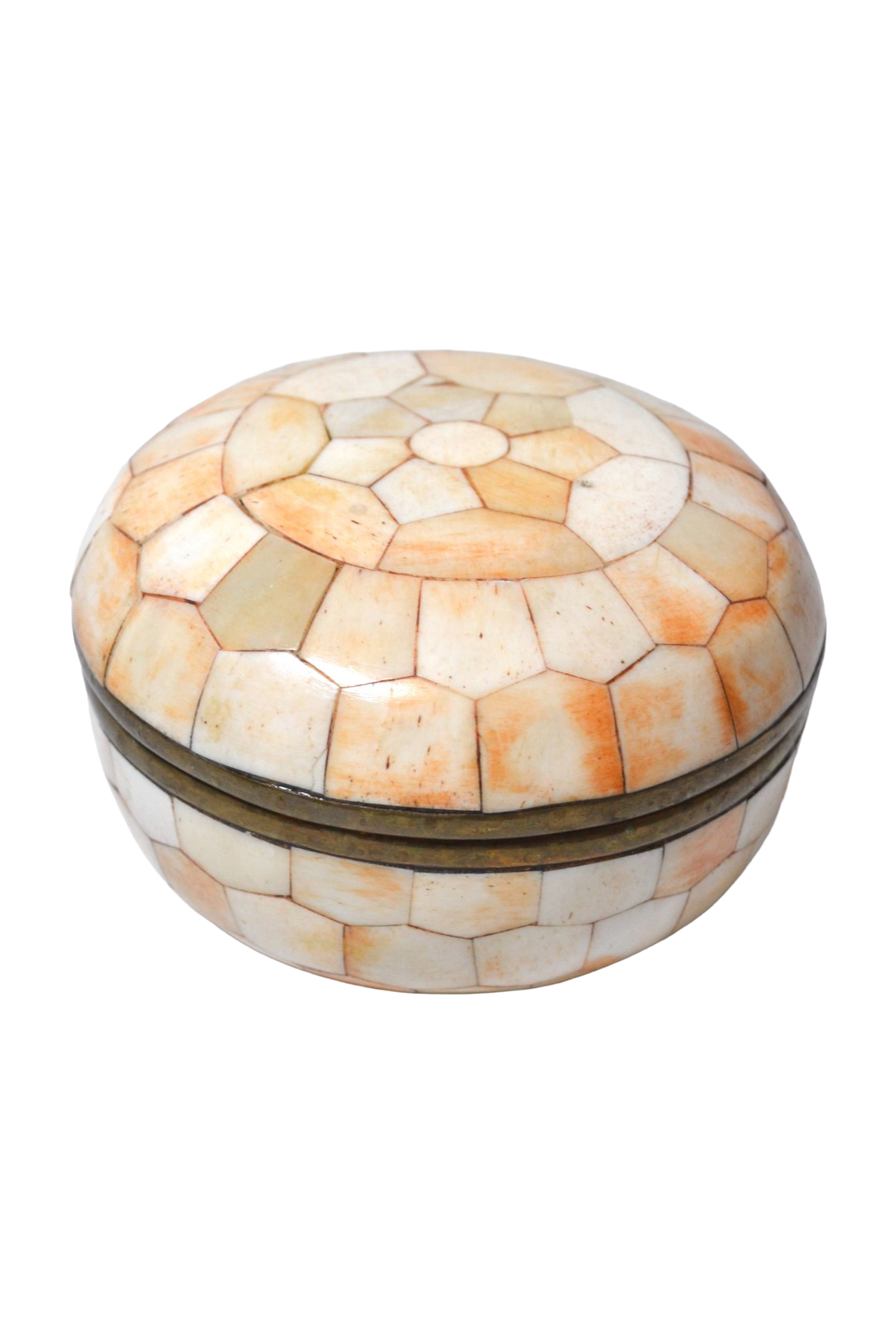 Cette surprenante boîte à bijoux orientale se distingue aussi bien par sa forme que par ses matériaux : os et laiton.