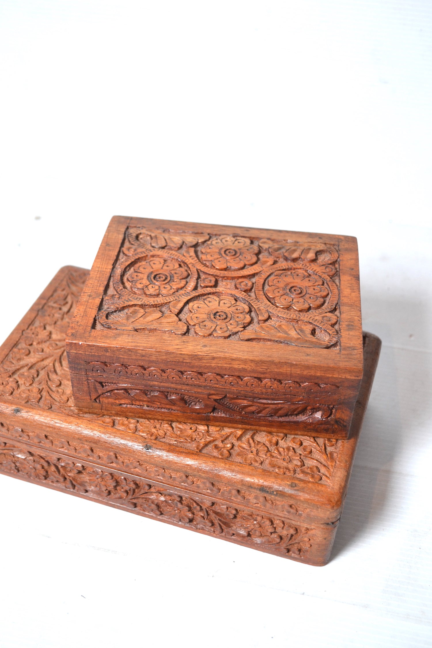 Très jolie boîte rectangulaire en bois sculpté élégamment ornée de motifs fleuris et géométriques sculptés en relief. Une jolie boîte artisanale destinée à ranger un paquet de cartes à jouer mais qu'on pourra également utiliser comme boîte à bijoux ou pour conserver de petits objets !