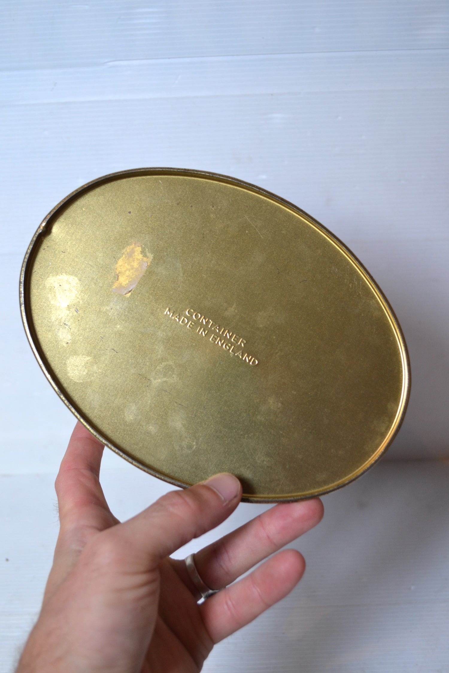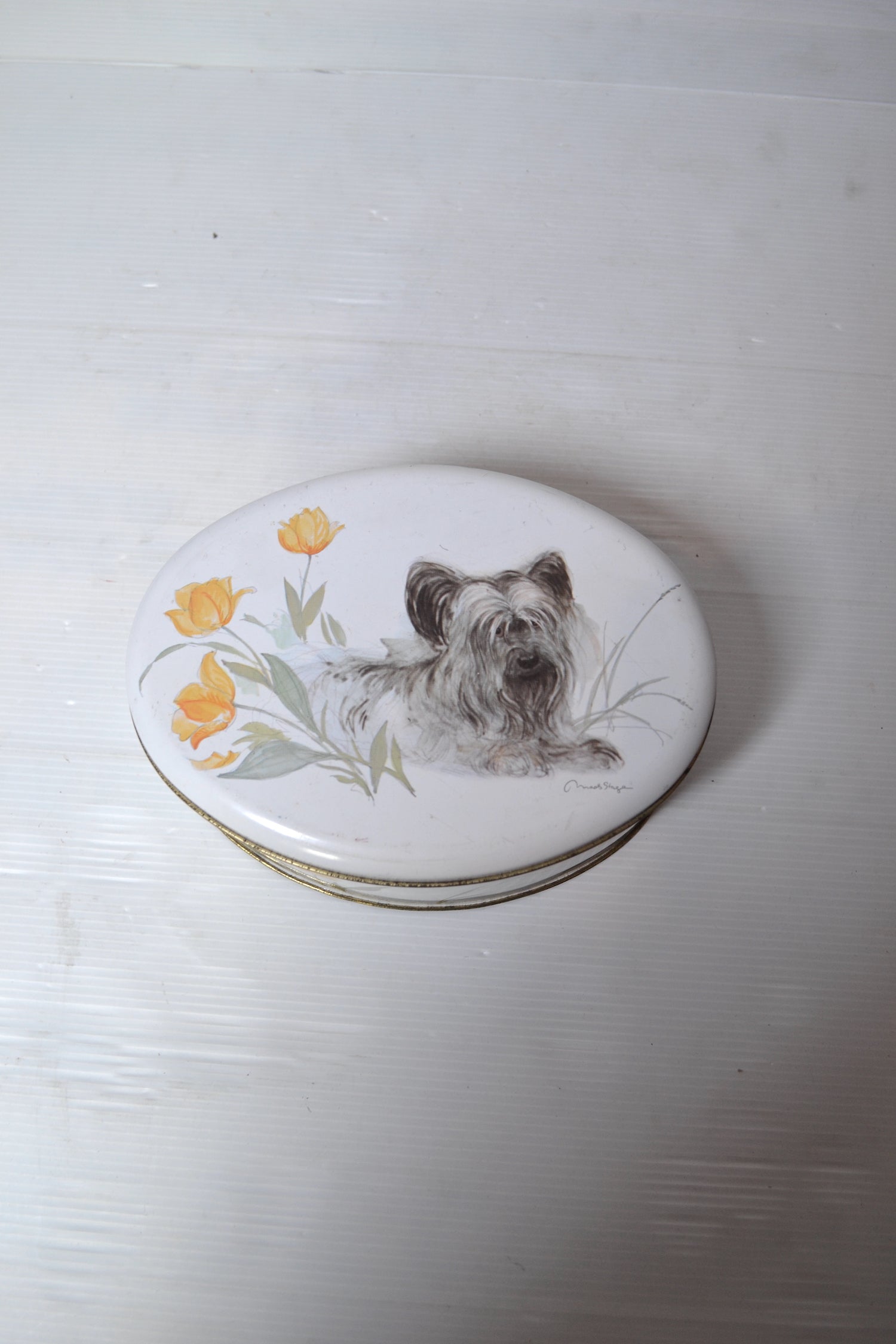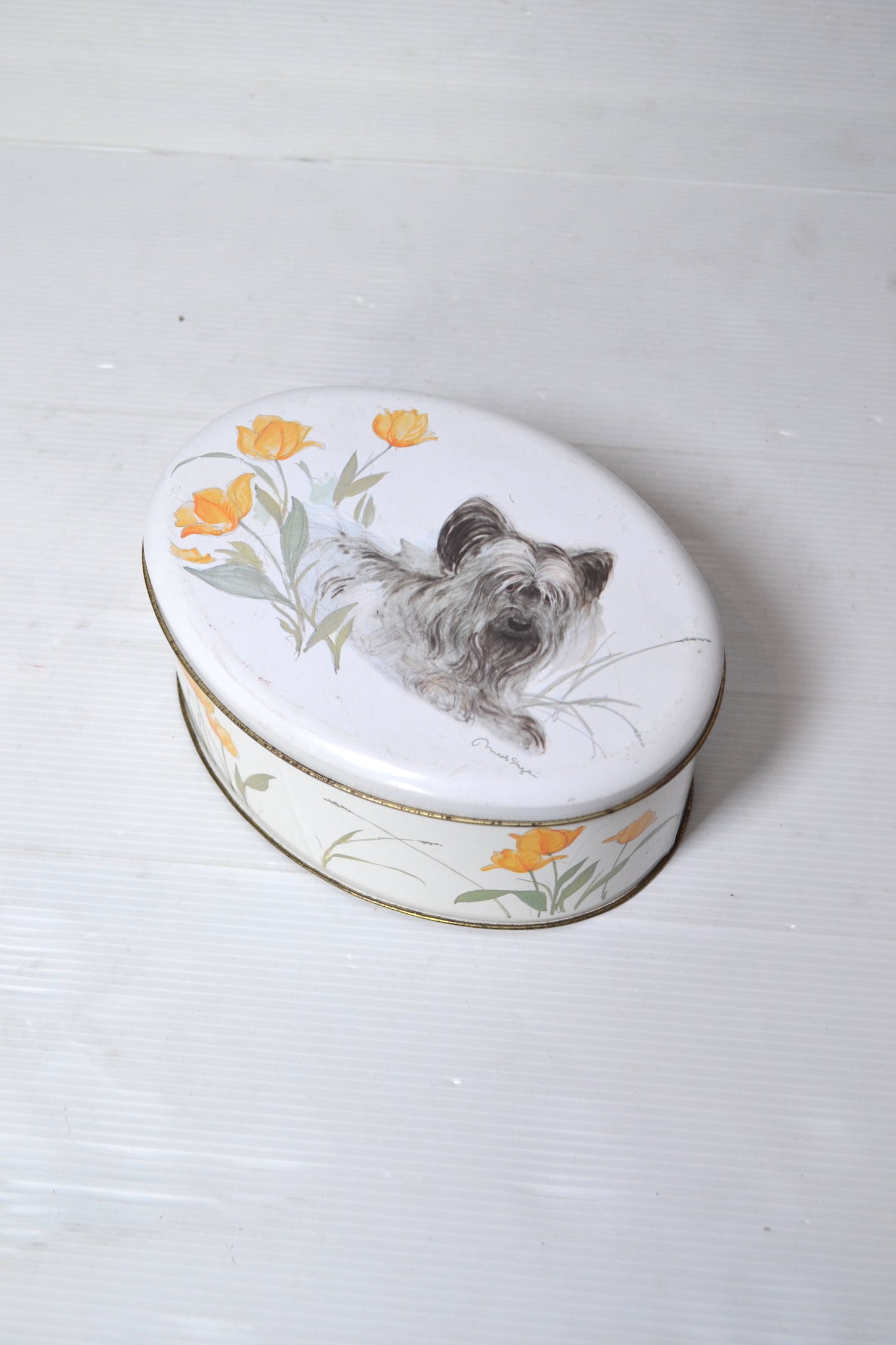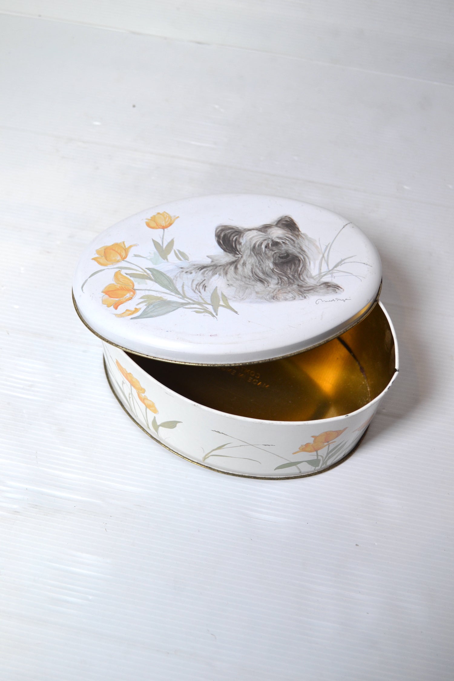 Très jolie boîte vintage en fer fabriquée en Angleterre ornée de fleurs et d'un chien au centre