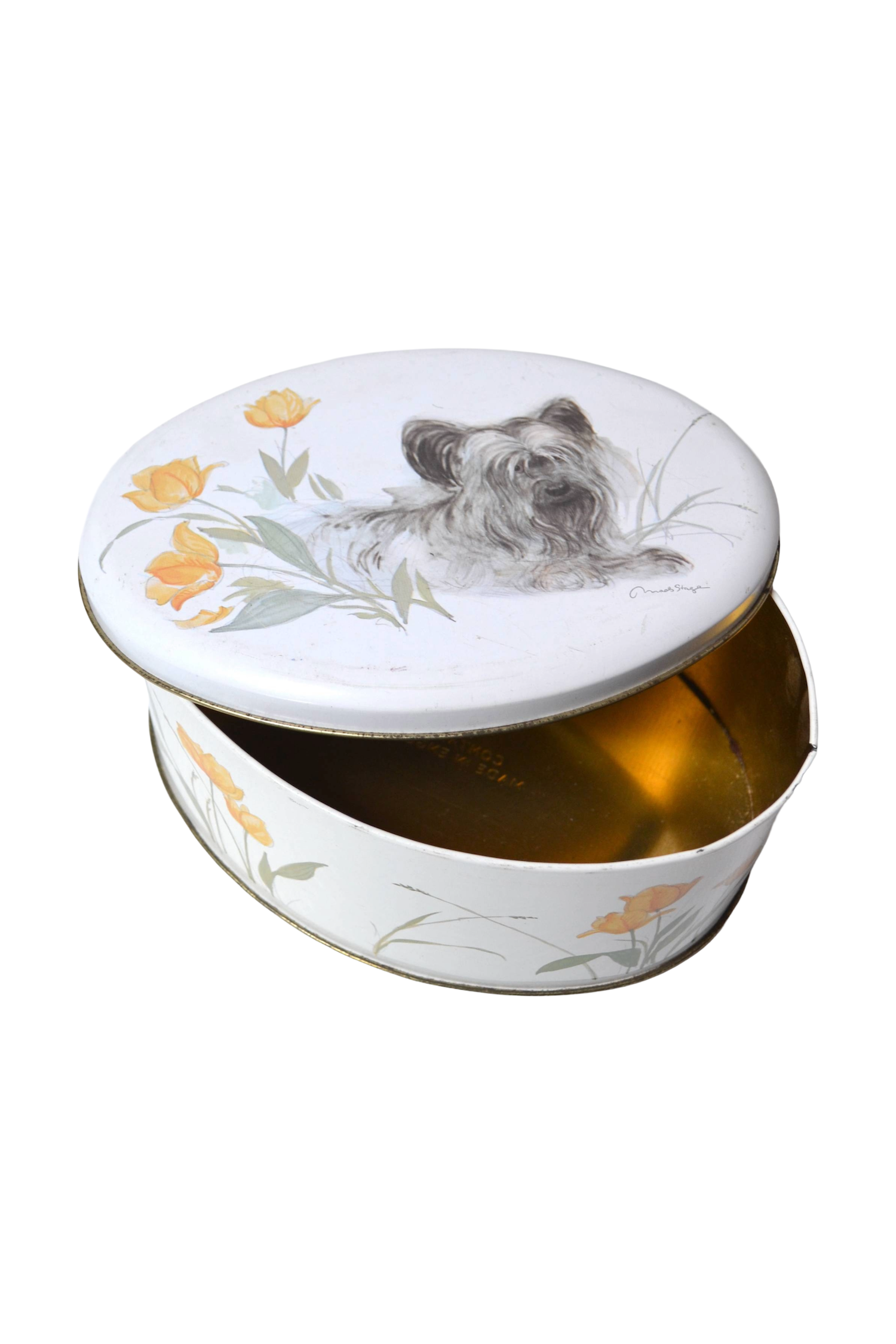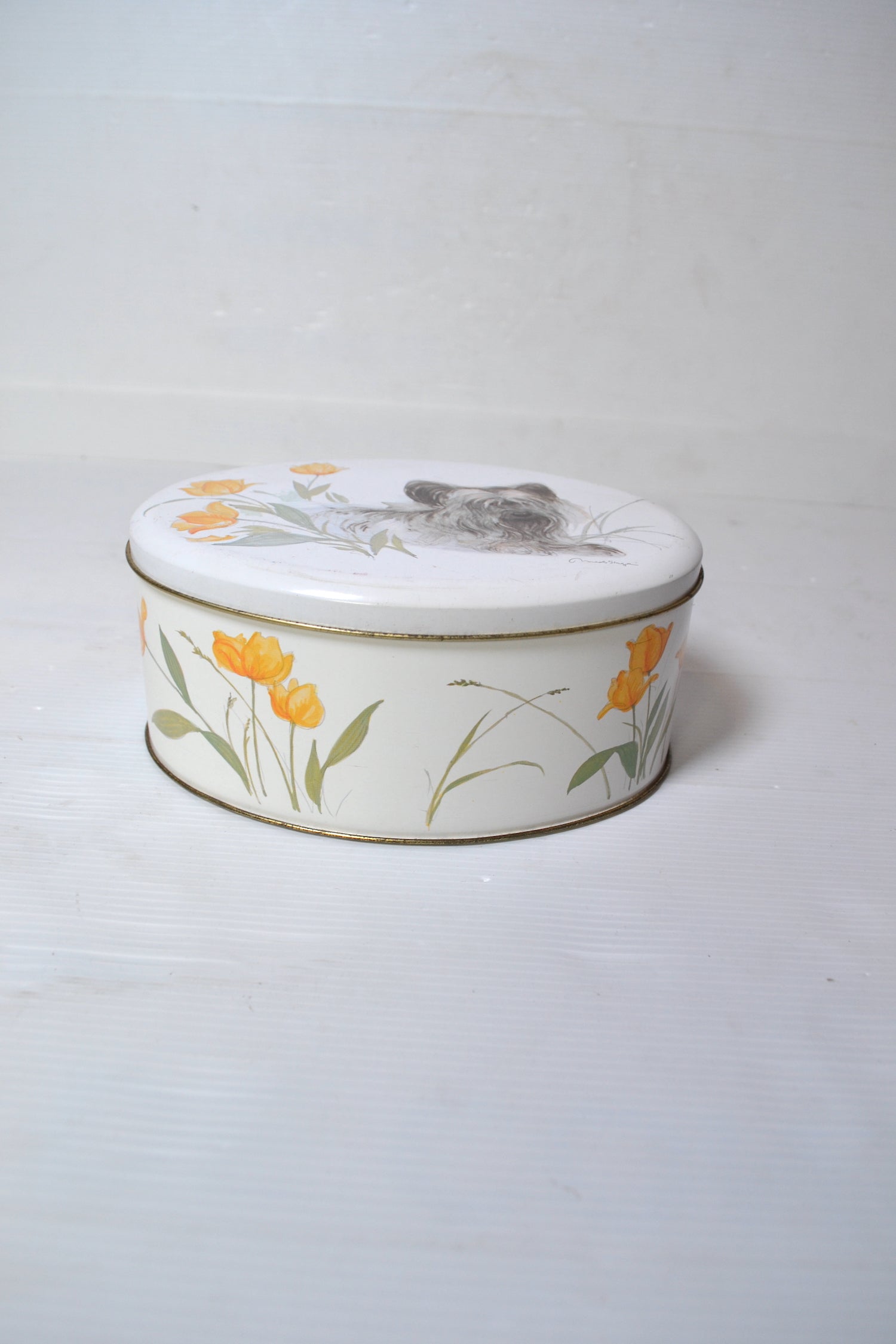 Cette jolie petite boîte vintage en fer est un accessoire de rangement élégant se démarquant par ses élégants motifs en forme de fleurs sur la boite et de chien sur le couvercle. On l'utilisera dans une cuisine à l'atmosphère rustique où on s'en servira pour ranger du café, des sachets de thé ou des biscuits.