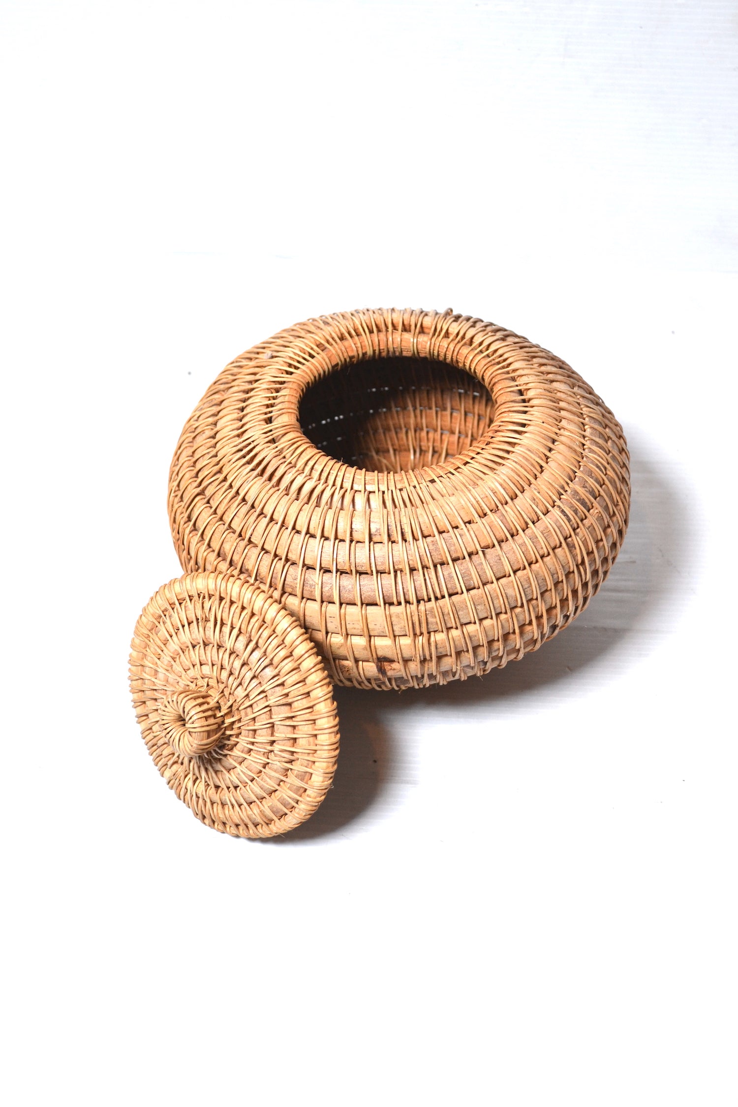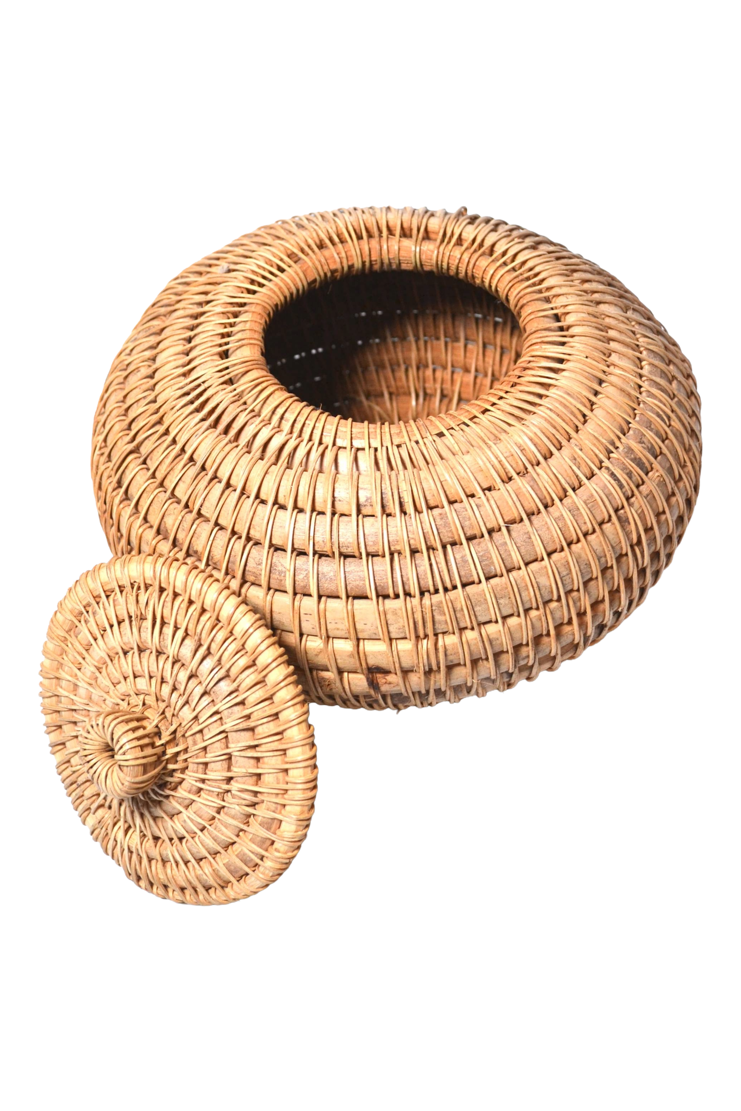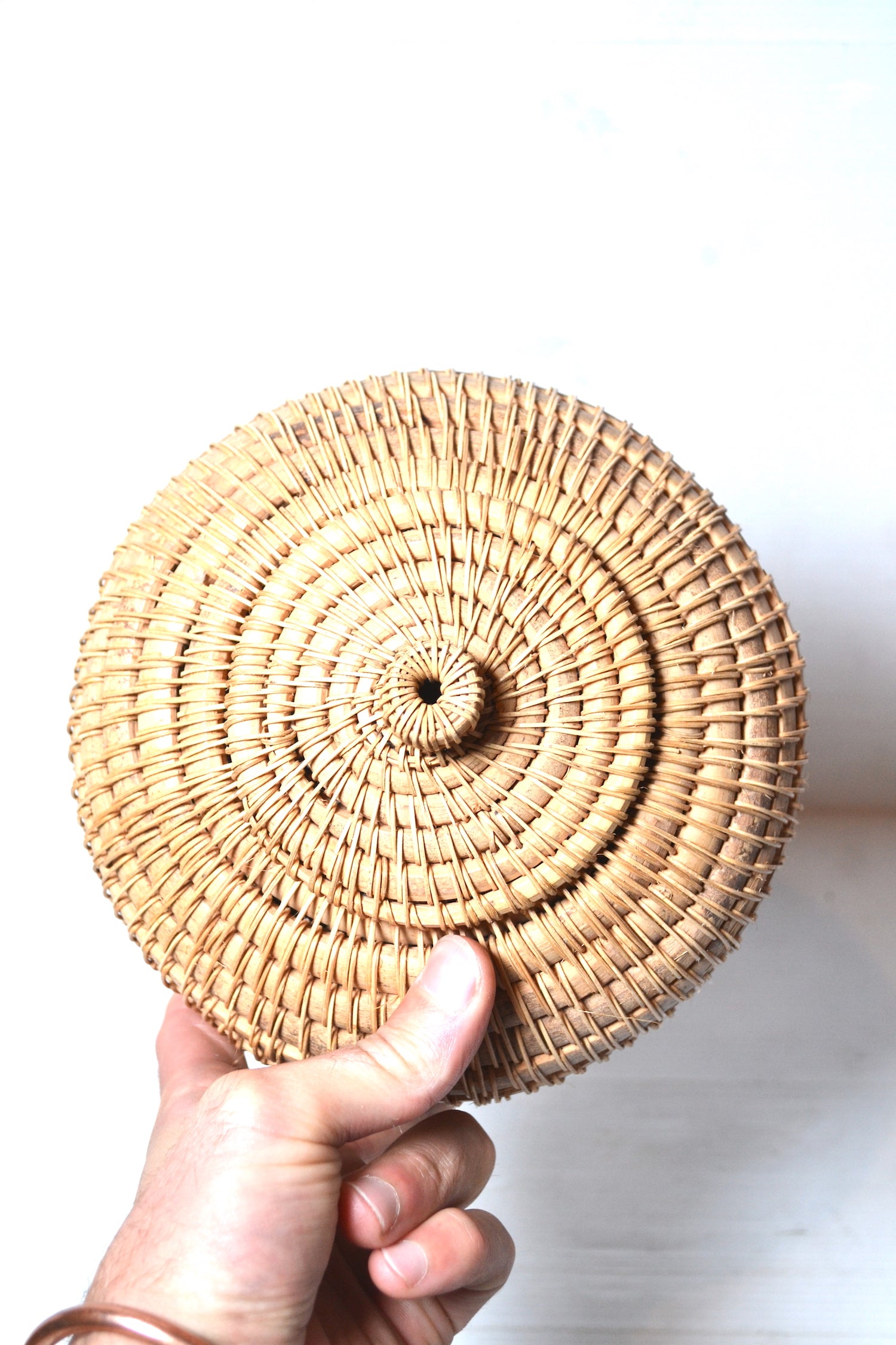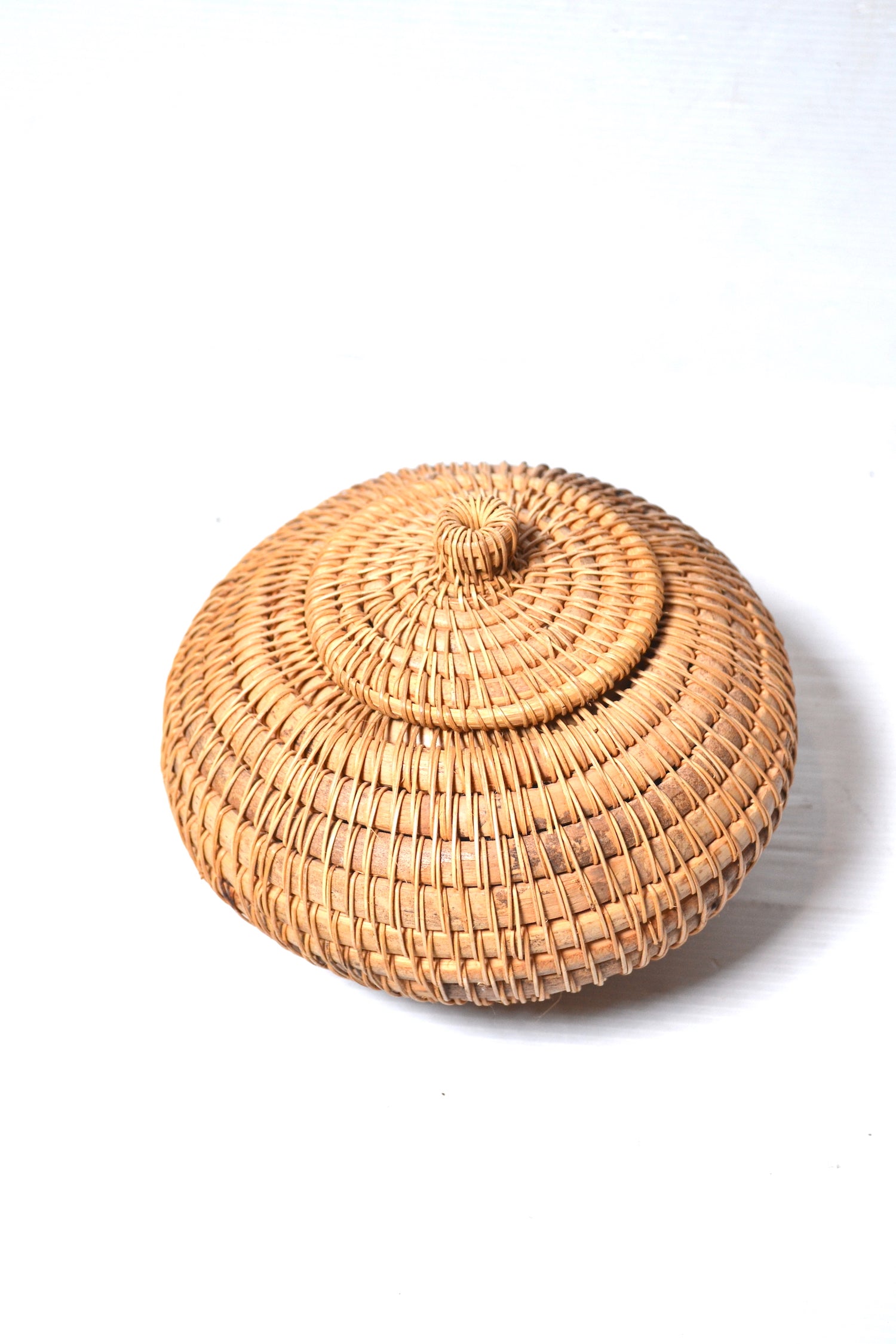 Jolie boite de rangement de forme ronde en osier tressé. Une boîte de rangement d'esprit bohème toute trouvée pour conserver de petits objets mais qui pourra aussi s'utiliser comme accessoire décoratif dans une vitrine en association avec des coffres et des valises en osier et en rotin !