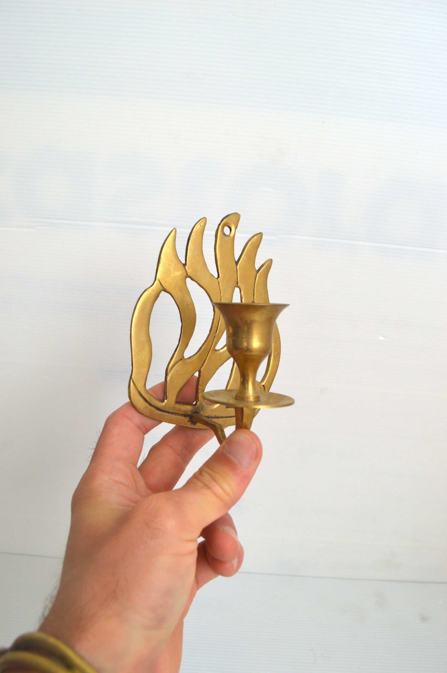 Ce très joli bougeoir ancien se compose d'une plaque décorative en forme de flamme percée pour pouvoir être accrochée et d'un réceptacle à bougie. Un bougeoir décoratif vintage en laiton dont la matière qualitative lui donne un aspect doré et lumineux !