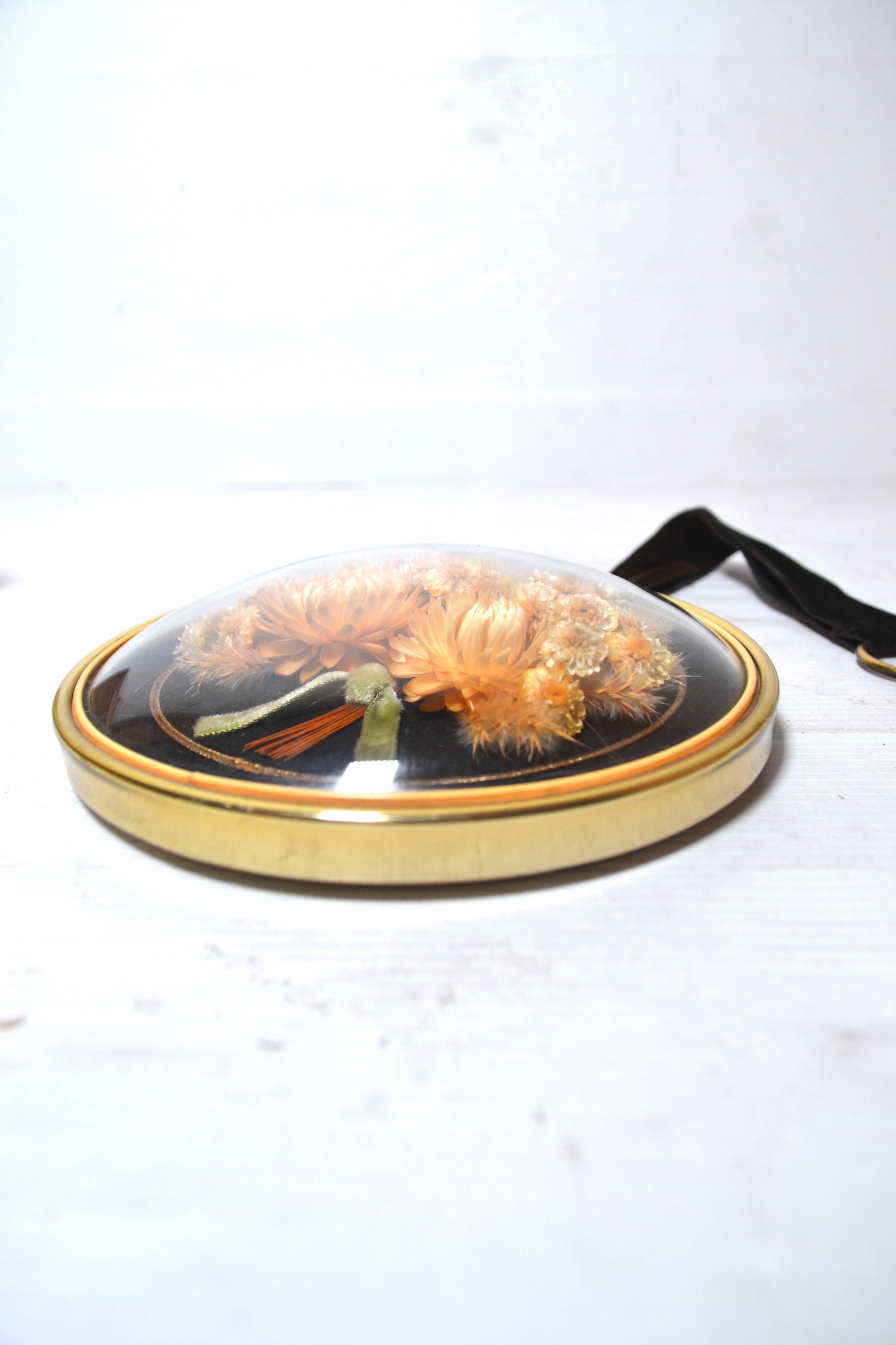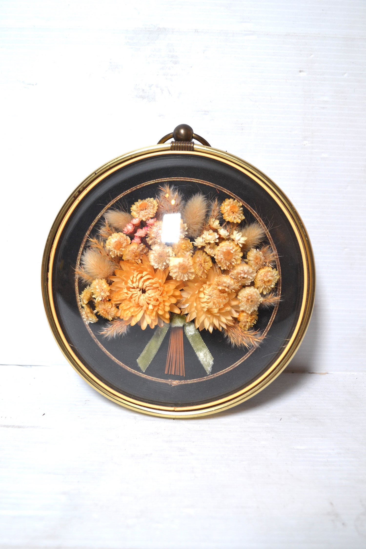 Très joli cadre vintage de forme circulaire au verre convexe renfermant un bouquet de véritable fleurs séchées. Ce joli cadre rond est un véritable petit bijou mural ancien. Il se distingue aussi bien par ses jolis coloris naturels, dorés et noirs que par sa superbe composition centrale en forme de bouquet de fleurs séchées ou par son élégante vitre en verre convexe. Un joli tableau végétal à suspendre aussi bien en isolé que dans une accumulation murale de cadres dorés ou dans un coin cabinet de curiosités !