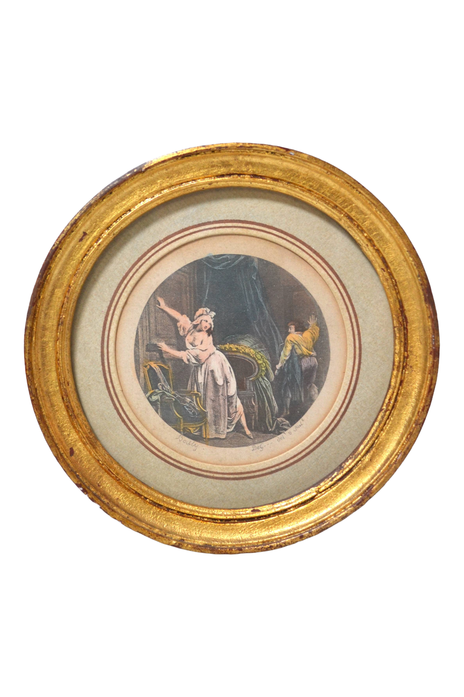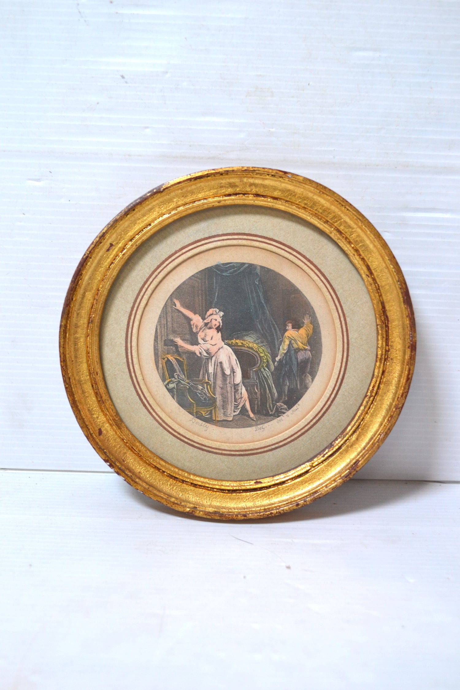 Ce joli cadre vintage en bois doré renferme une élégante lithographie colorée. On suspendra ce cadre en isolé dans une salle de bain tout comme il pourrait rejoindre une accumulation murale avec d'autres cadres dorés !