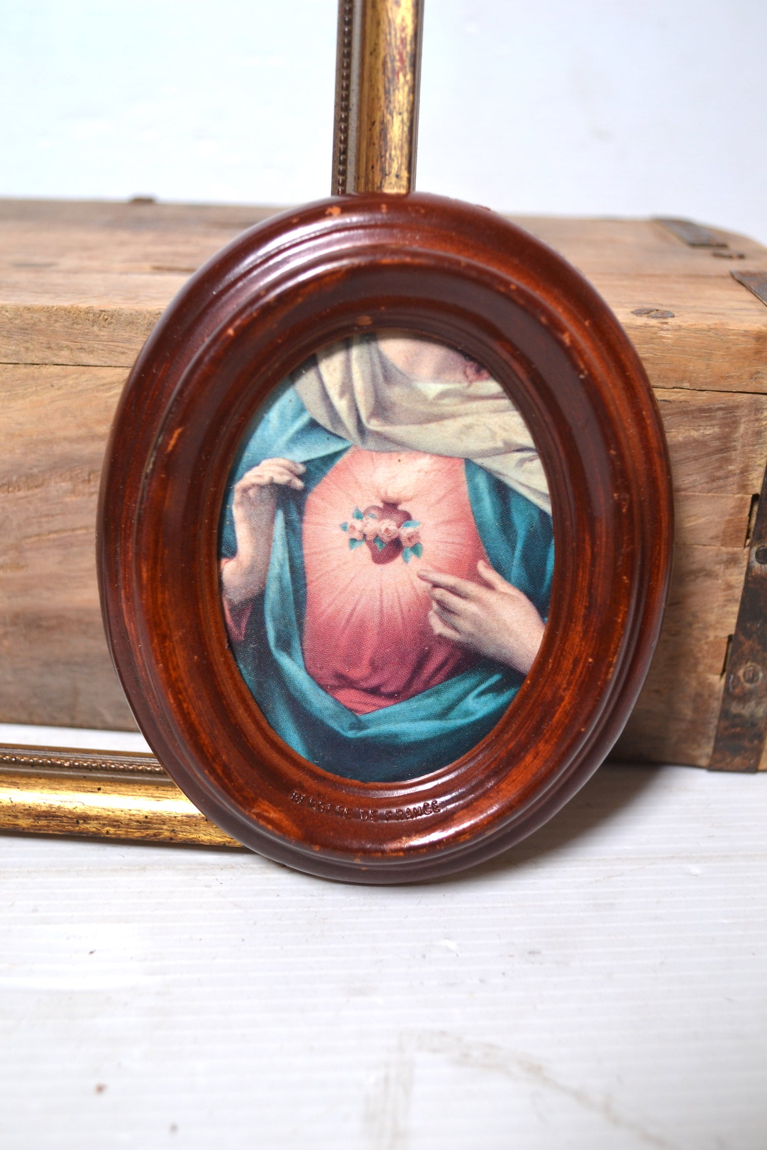 Ce joli petit cadre vintage en plastique oval se distingue par son élégante patine marron liée à l'usure et au temps que par sa très belle représentation chrétienne centrale : une illustration de cœur ex-voto flamboyant.