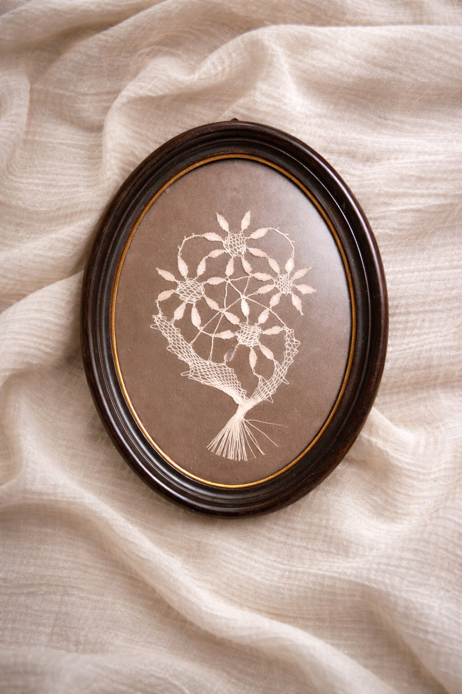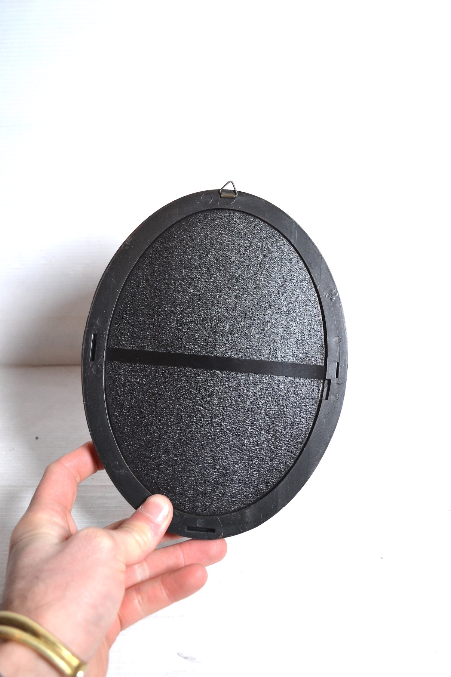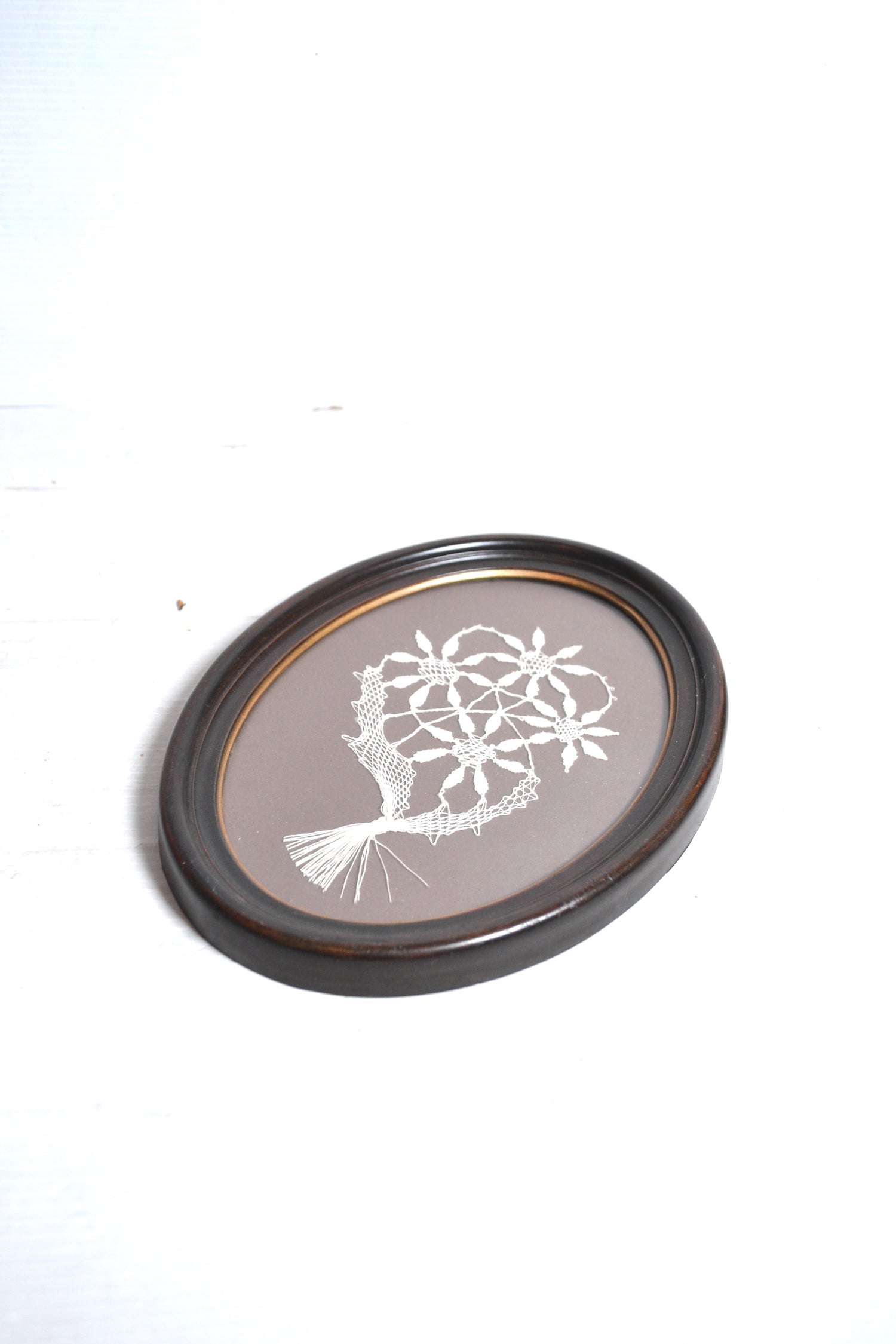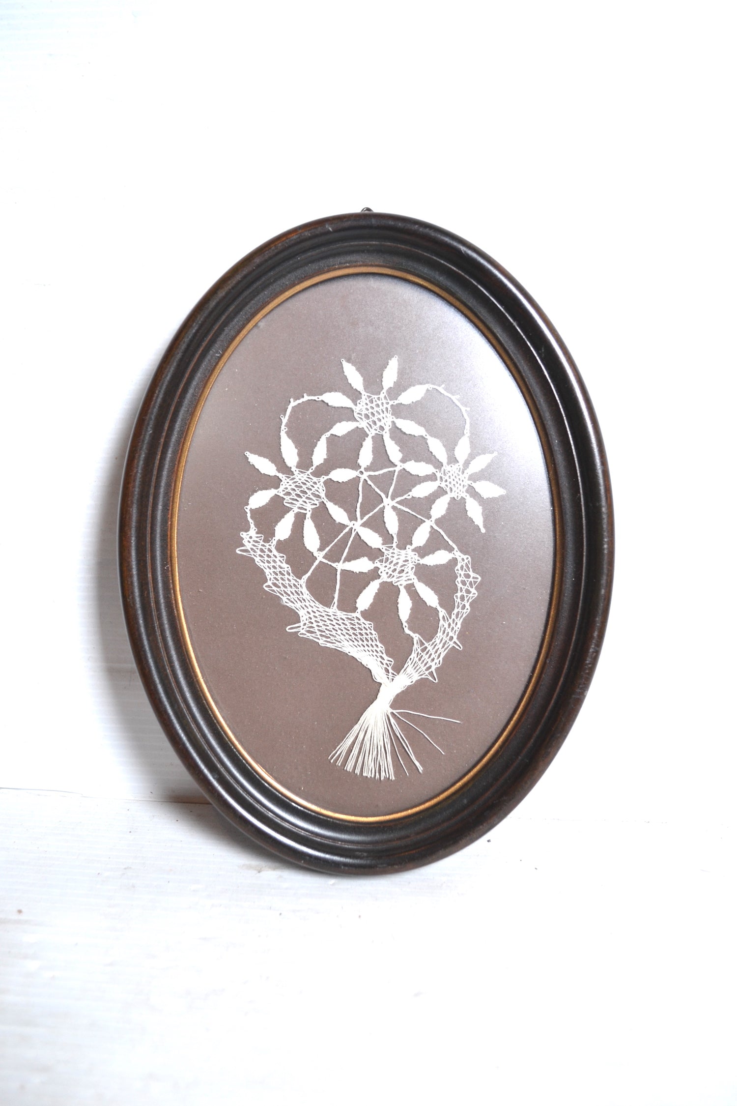 Élégant cadre vintage en plastique au format oval coloris marron avec liseré doré. Ce joli cadre vintage renferme une belle composition brodée. On le suspendra en isolé au dessus d'une table de chevet ou dans une accumulation murale de cadres.