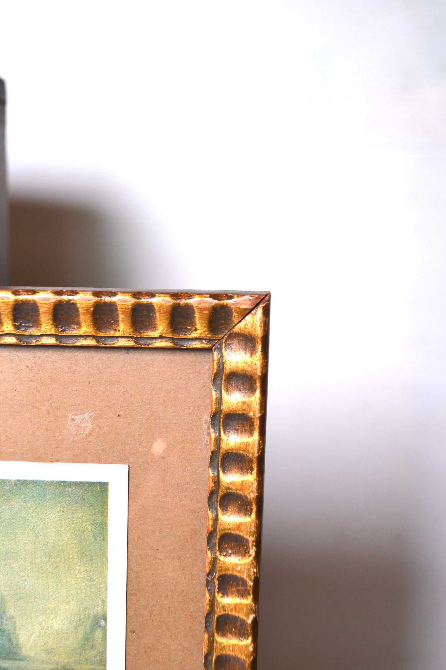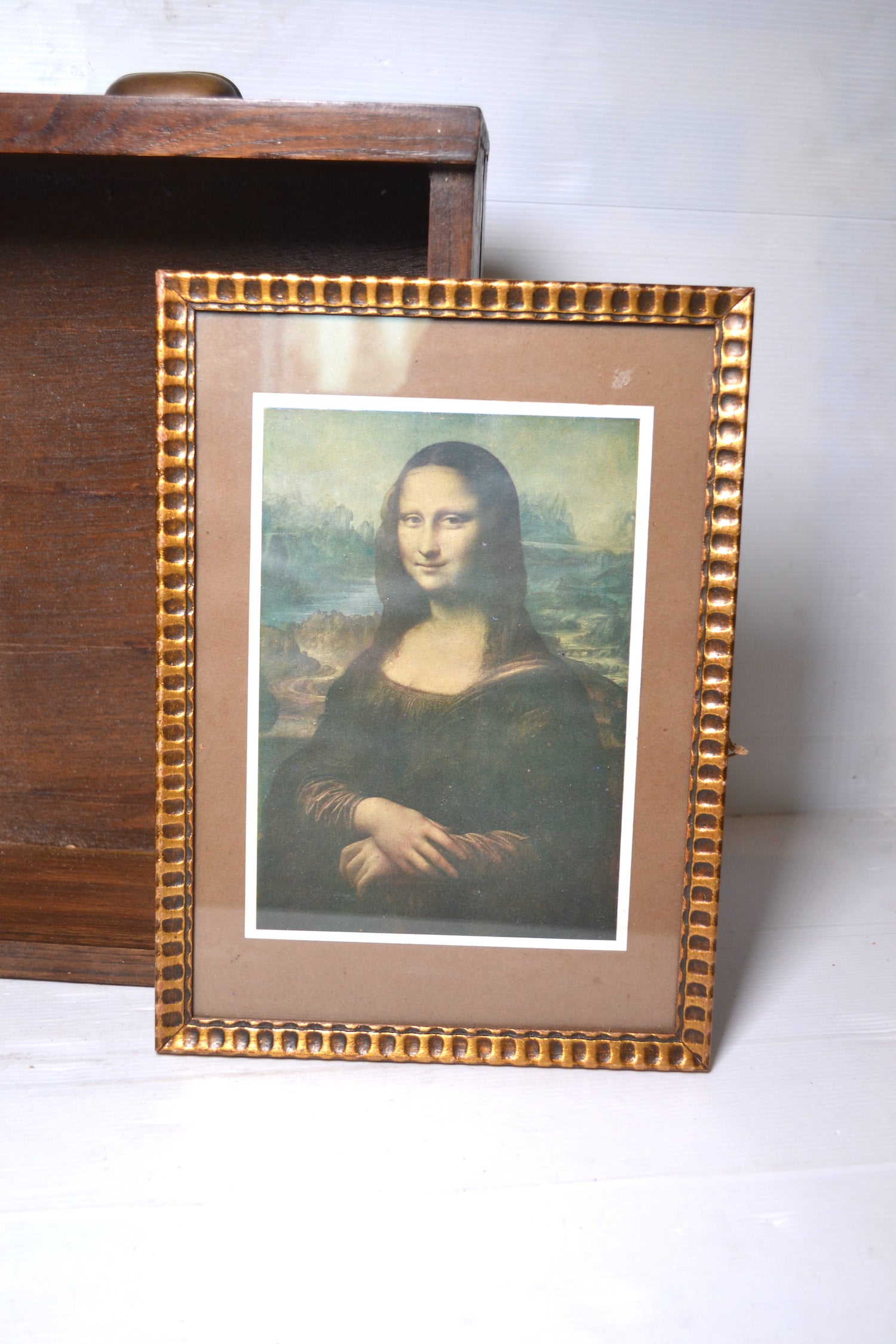 Ce très joli cadre vintage en bois doré finement sculpté renferme une reproduction de l'iconique Joconde placée sous verre. Un joli cadre doré qu'on positionnera facilement dans une accumulation murale de cadres et de miroirs anciens !