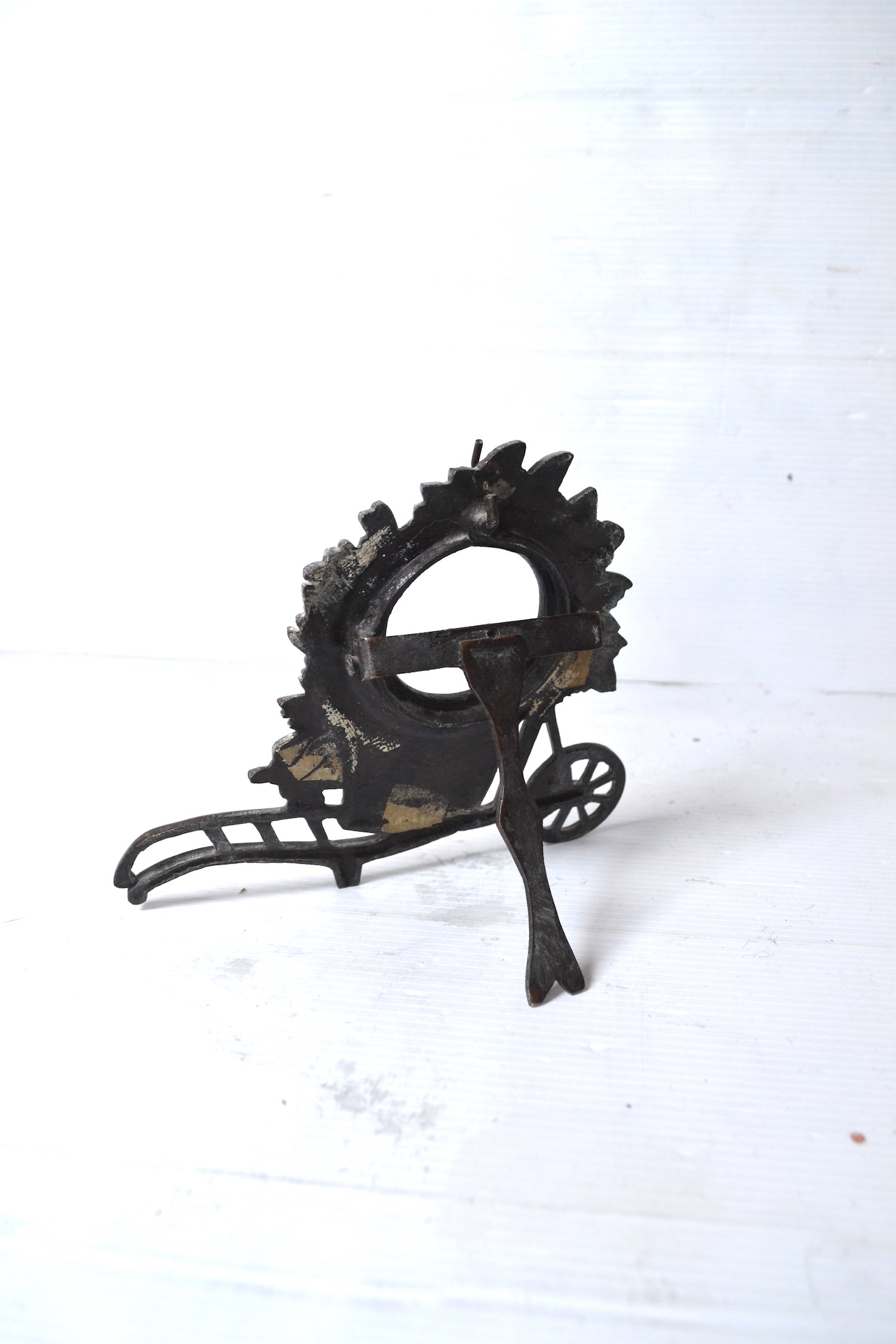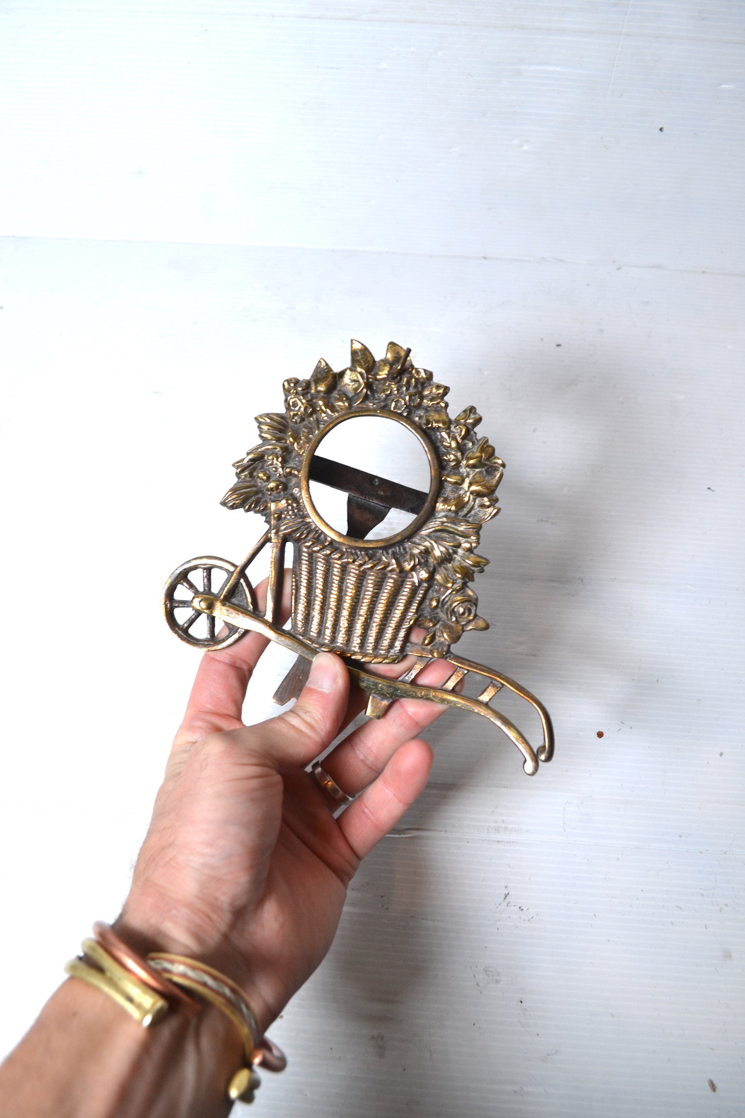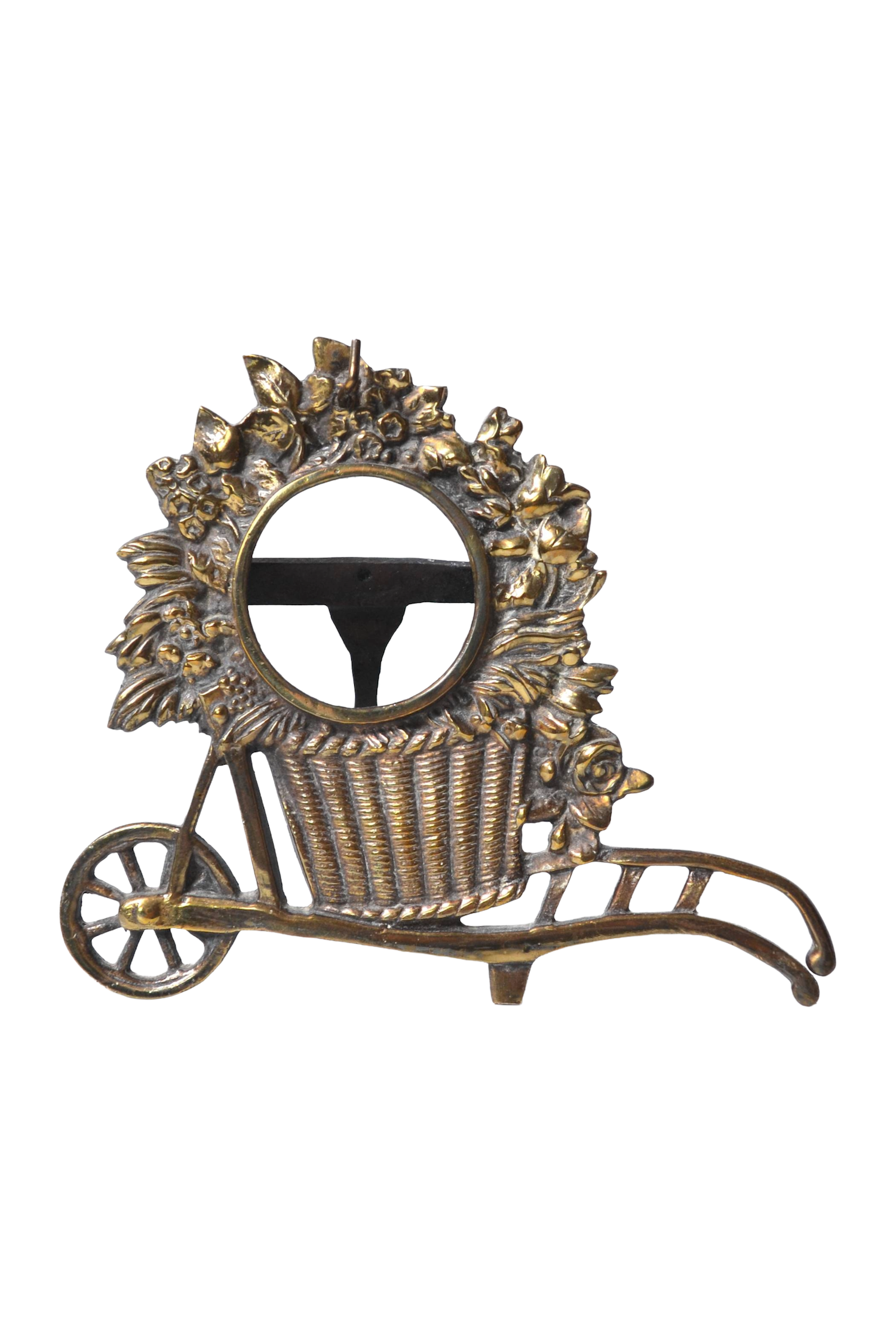 Cet élégant cadre vintage en laiton se démarque par sa belle couleur dorée comme par son superbe modèle en forme de brouette ornée d'un bouquet de fleurs.