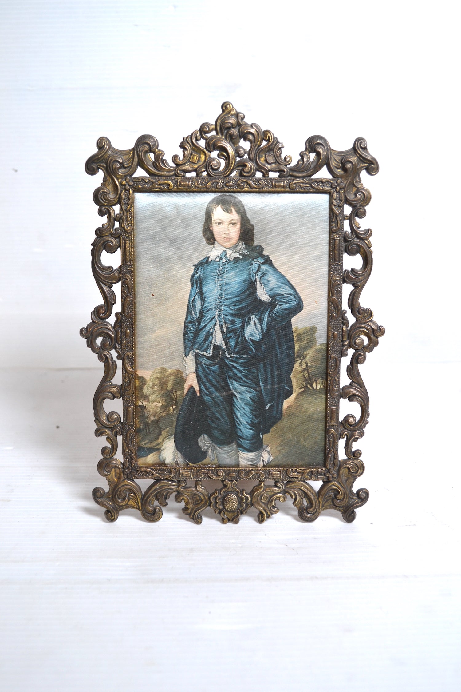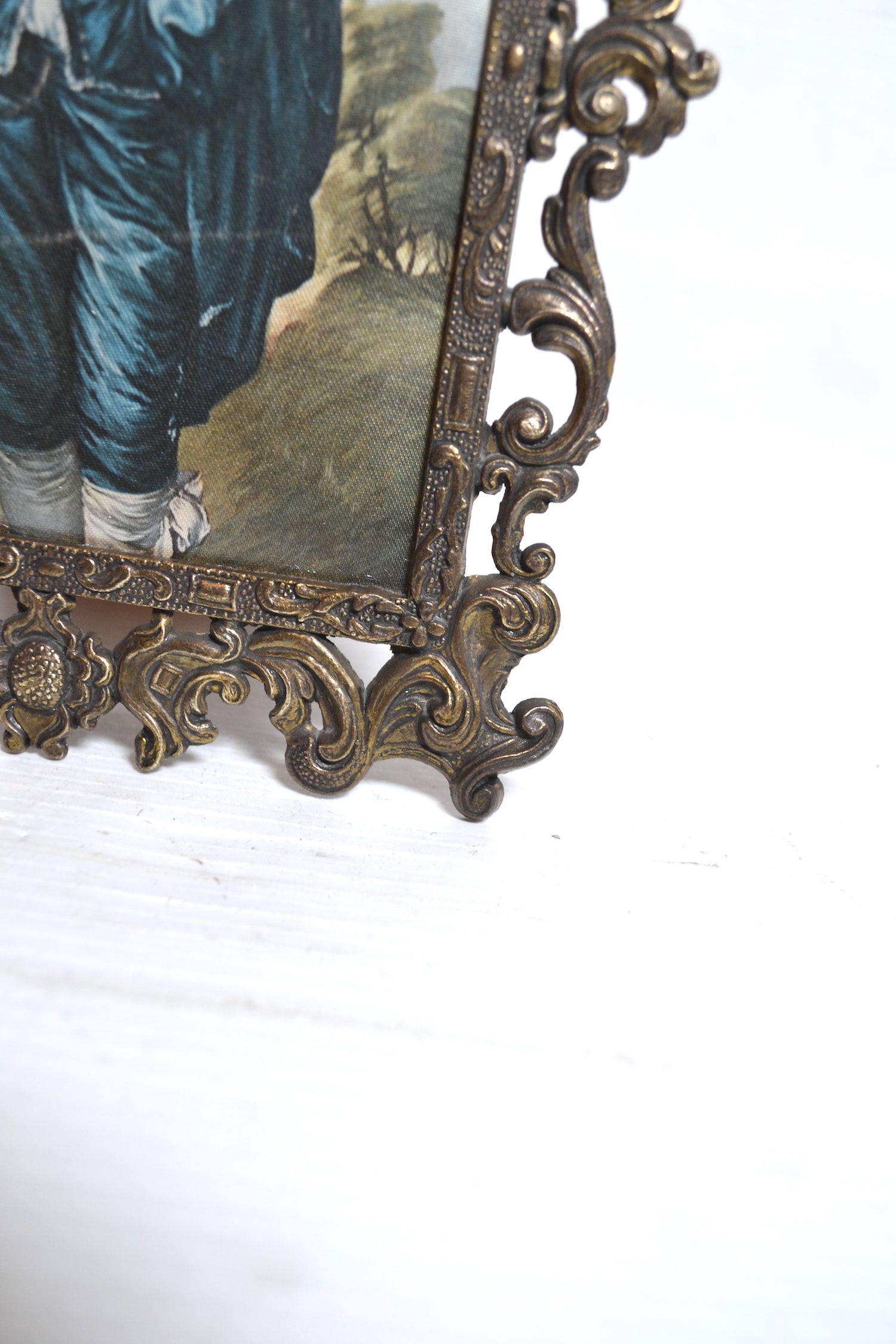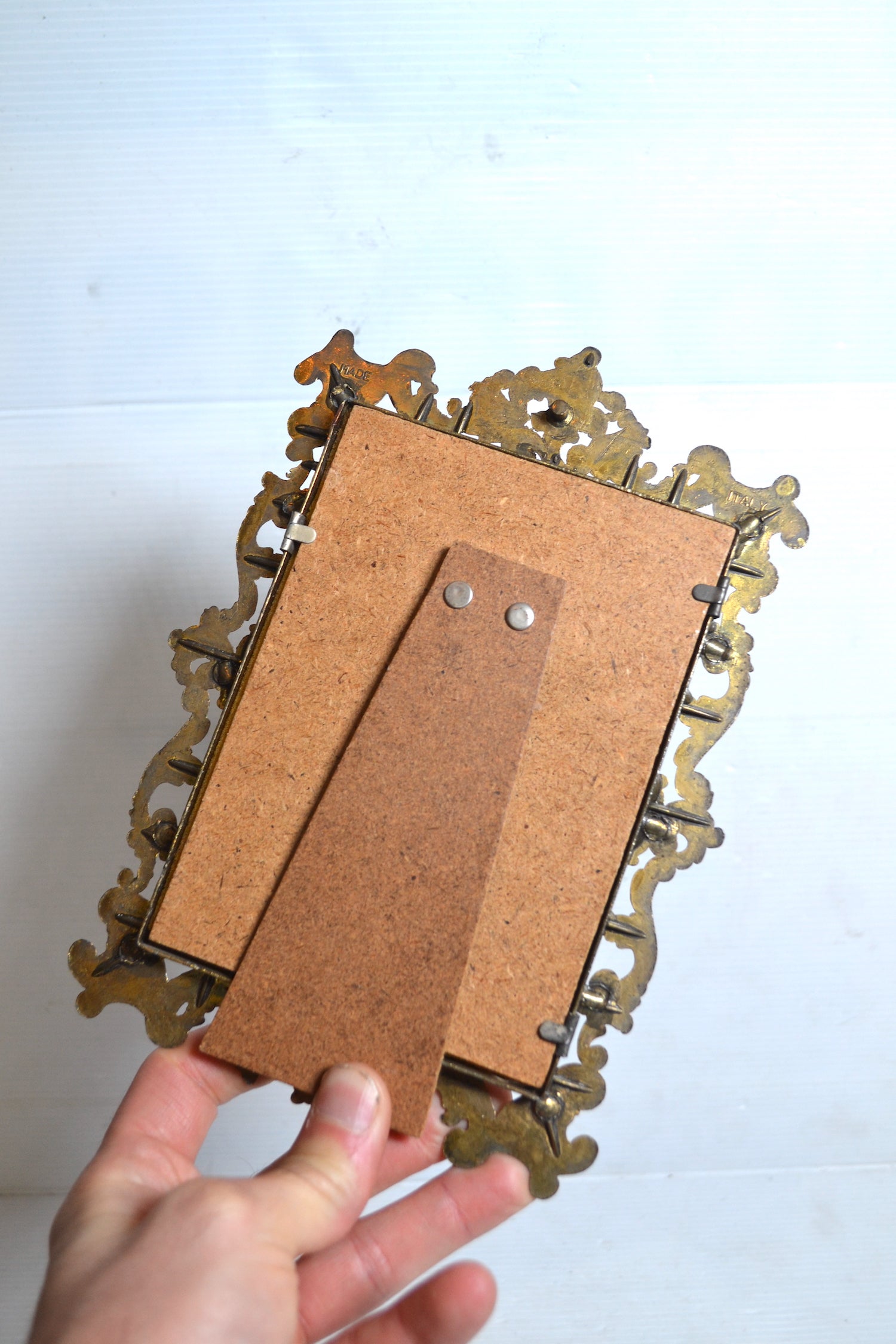 Apportez une touche d’élégance et de charme vintage à votre intérieur avec ce cadre italien ancien en laiton doré. Ce cadre à poser, finement travaillé, se distingue par ses motifs végétaux, volutes et arabesques qui lui donnent un style raffiné et unique.