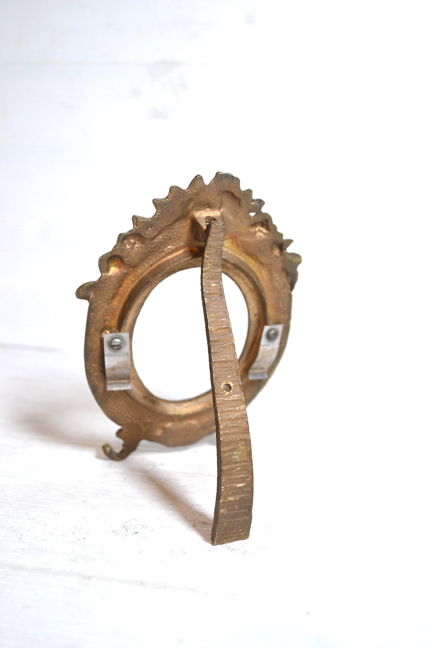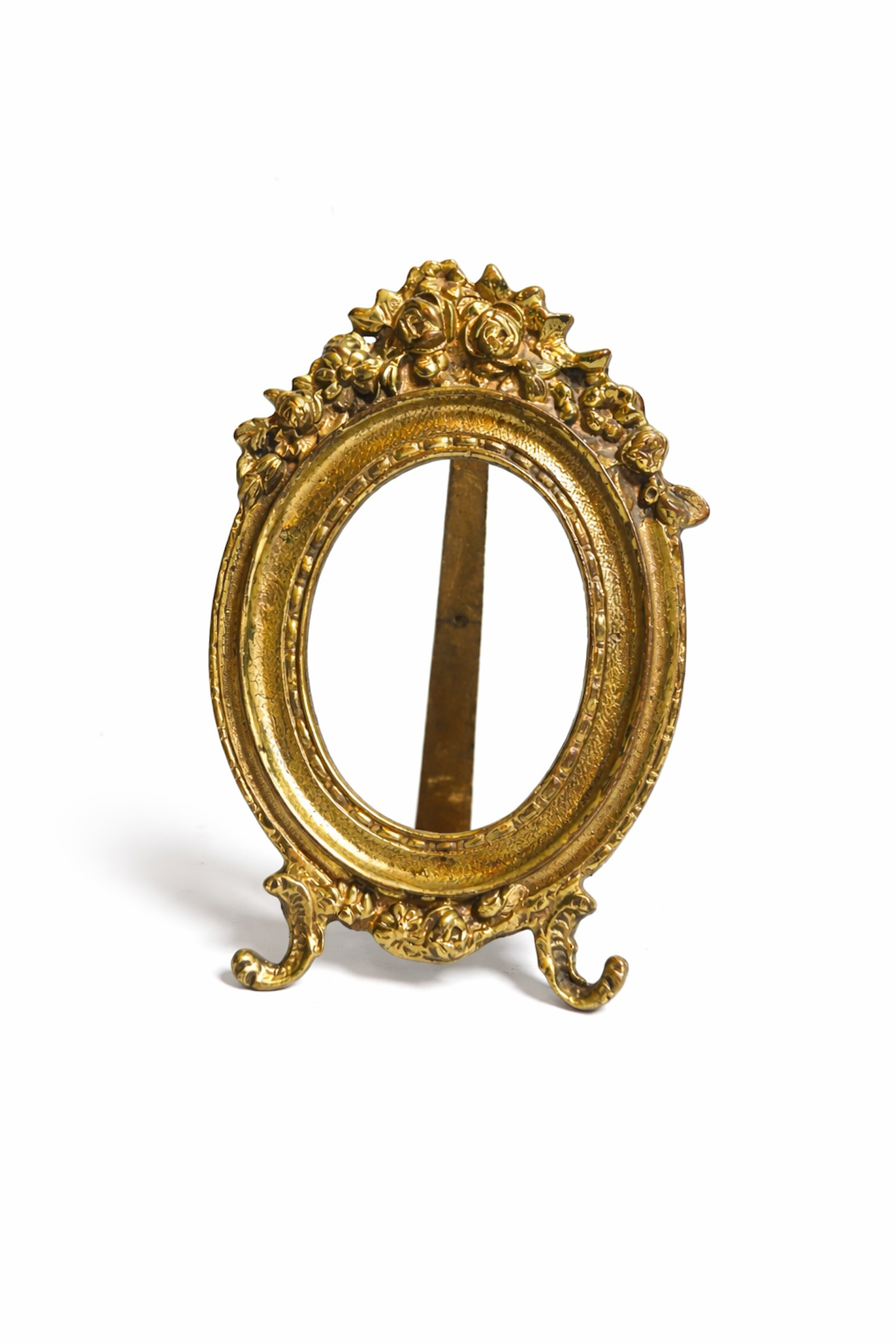 Très joli cadre médaillon vintage en laiton à poser. Un ancien cadre très élégant orné de roses en relief. On l'utilisera pour encadrer un portrait et on le posera aussi bien sur un buffet que sur une table de chevet !