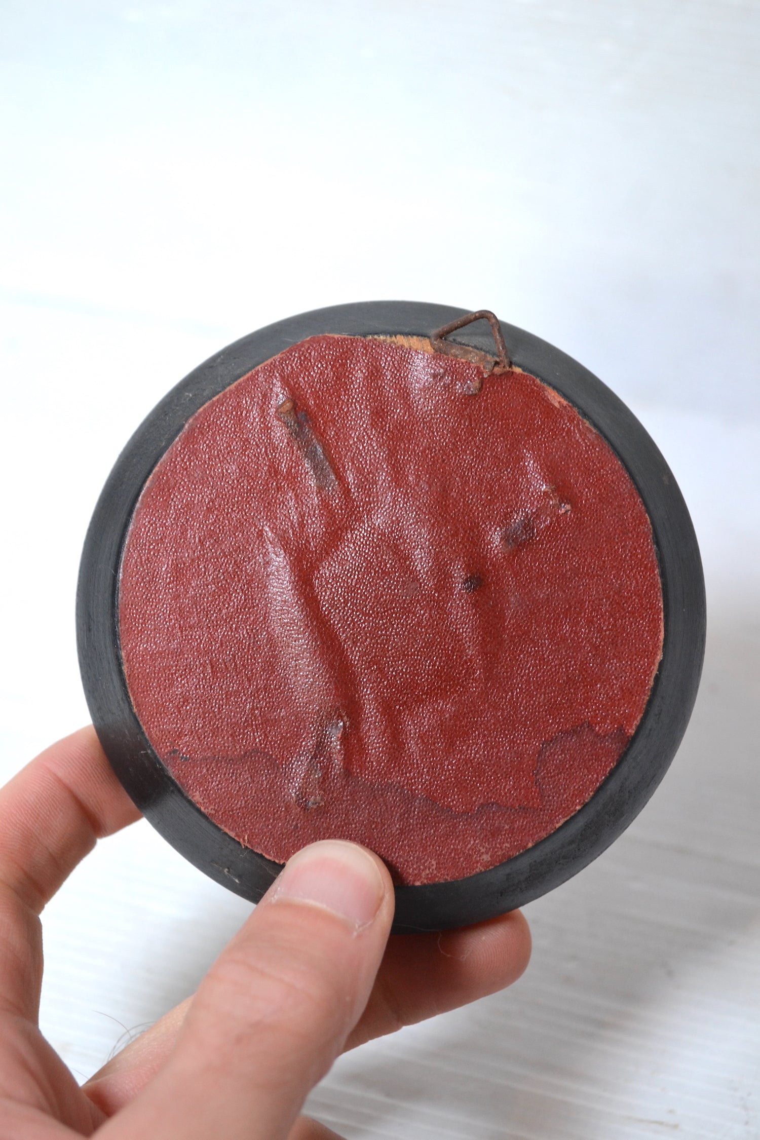 Très joli cadre vintage circulaire en bois renfermant une petite image sous vitre en verre bombé