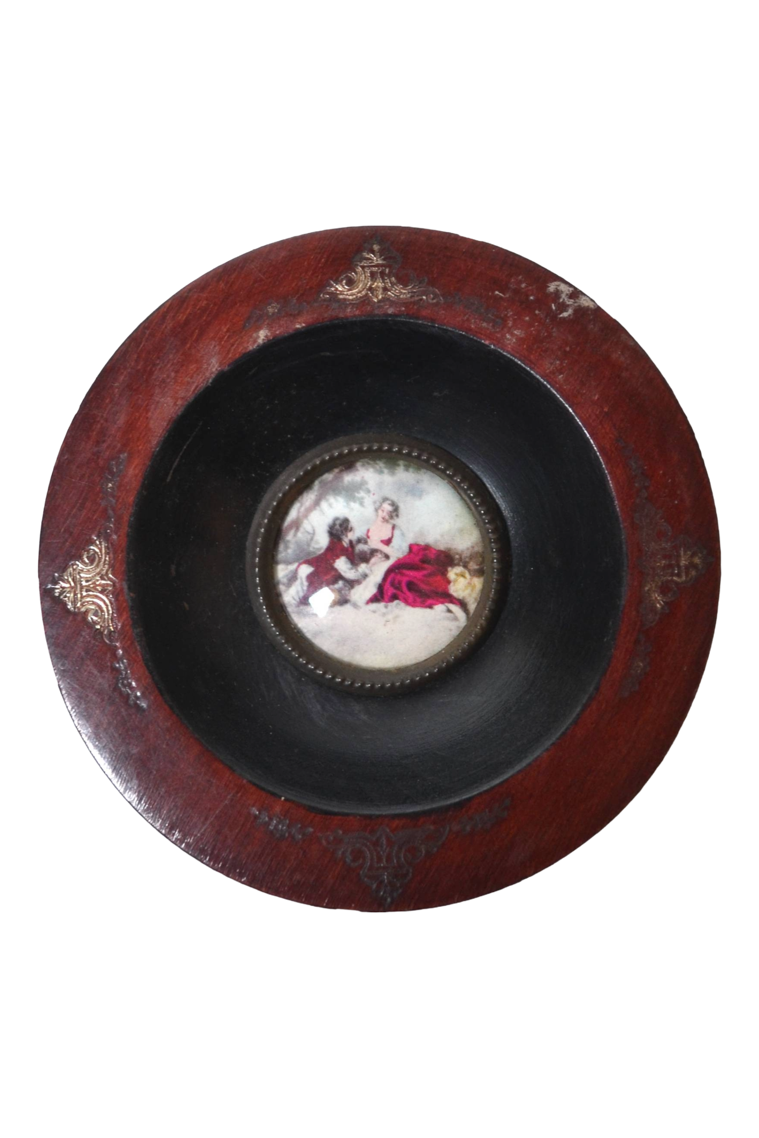 Ce très joli cadre vintage en bois se compose d'une image centrale sous forme de scène de courtoisie entre deux personnages, d'une petite vitre au verre bombé, d'un liseré doré et d'un panneau de bois coloris marron et noir.