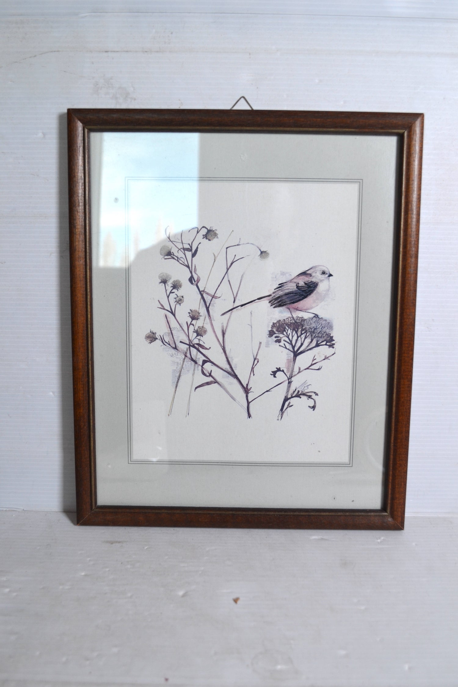 Joli cadre en bois vintage renfermant une illustration sur les oiseaux. Un cadre idéal à suspendre en isolé au dessus d'un buffet ou d'une table de chevet ou à placer dans une accumulation murale de cadres et de tableaux