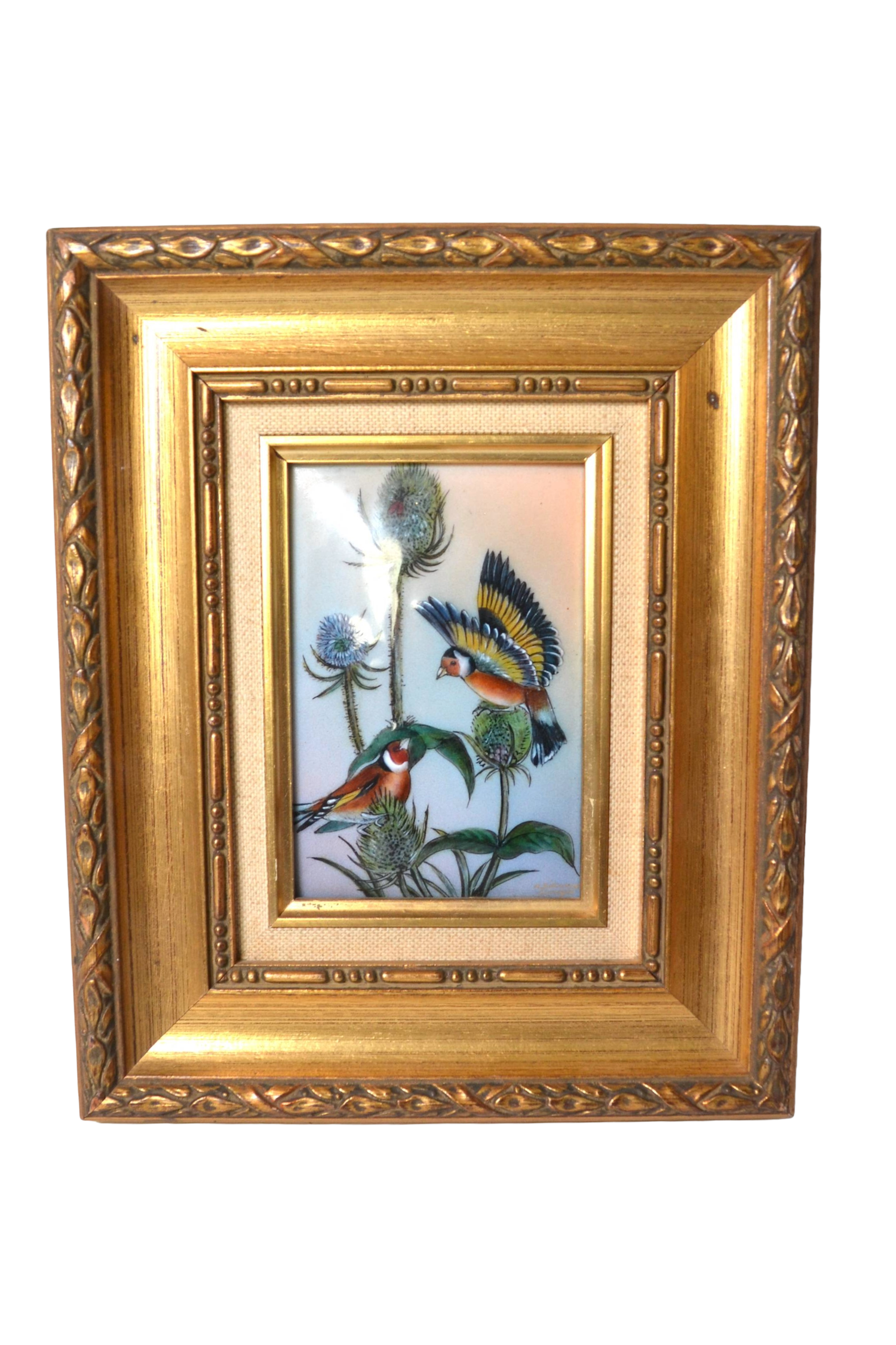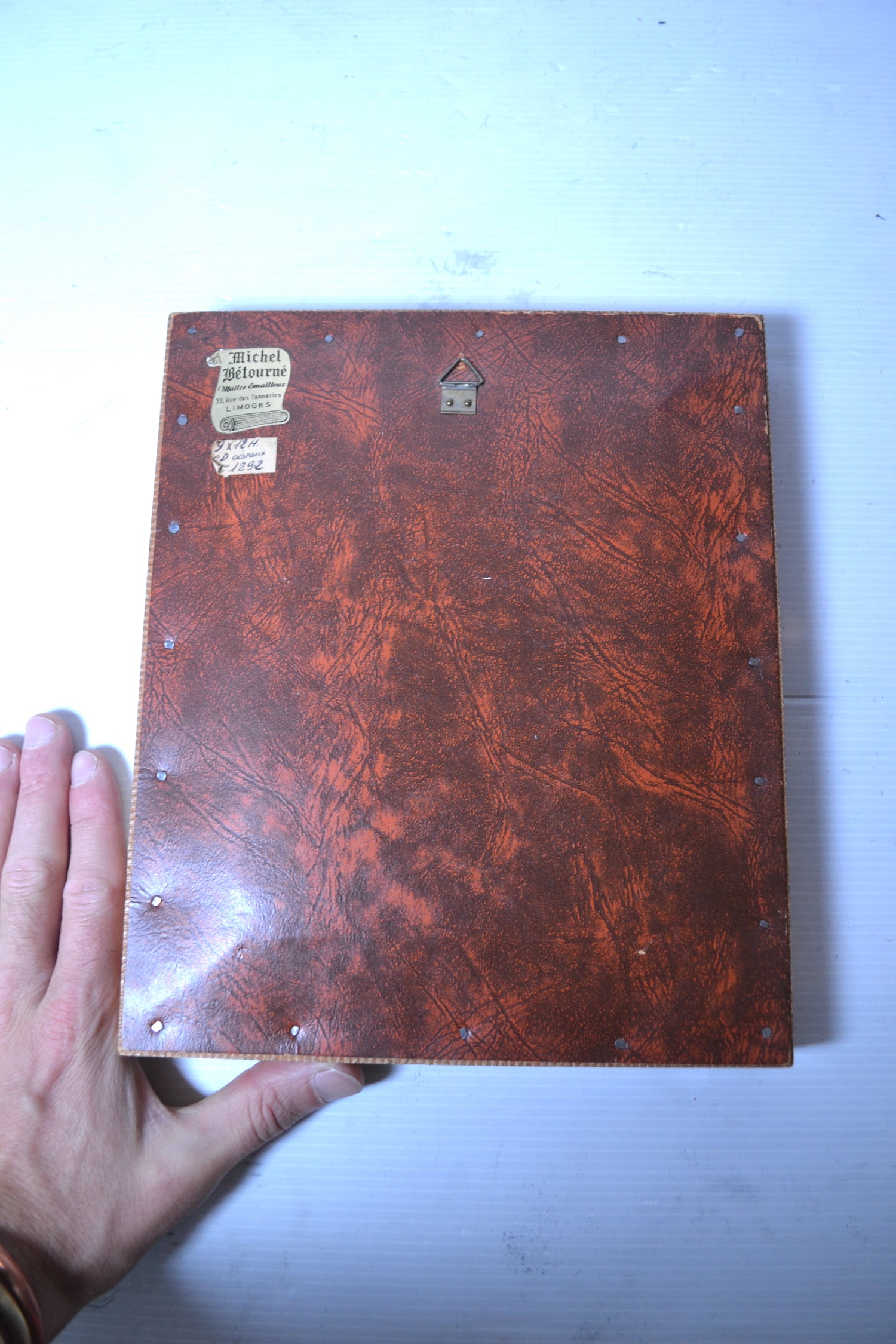 Ce joli cadre vintage se distingue aussi bien par sa belle peinture centrale sur panneau de fer bombé que par son entourage en bois rehaussé de délicates moulures.