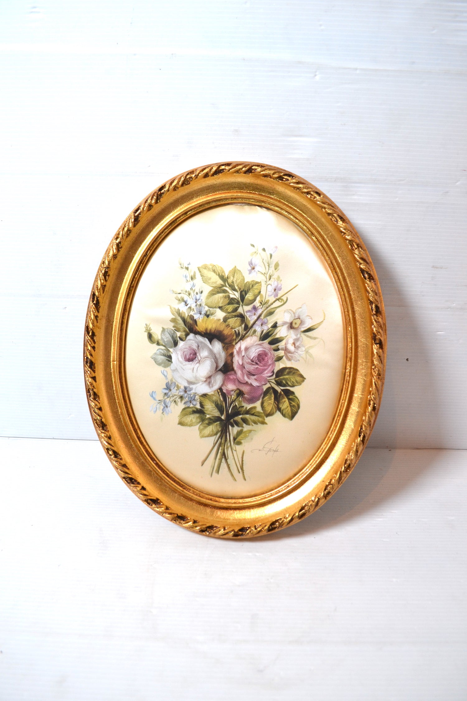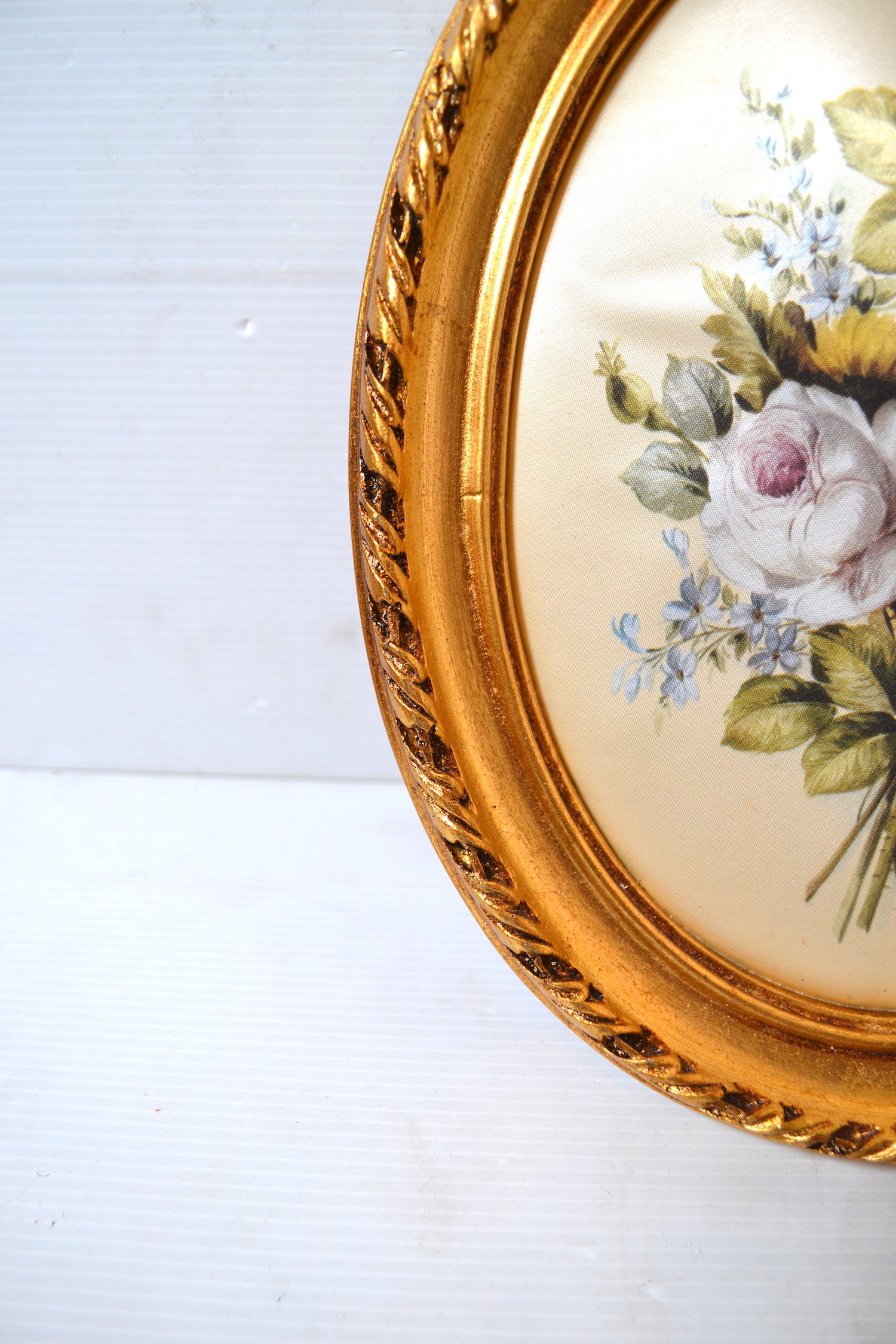 Ce joli cadre vintage se distingue par sa belle forme ovale, son cadre en relief et son élégante peinture sur soie centrale.