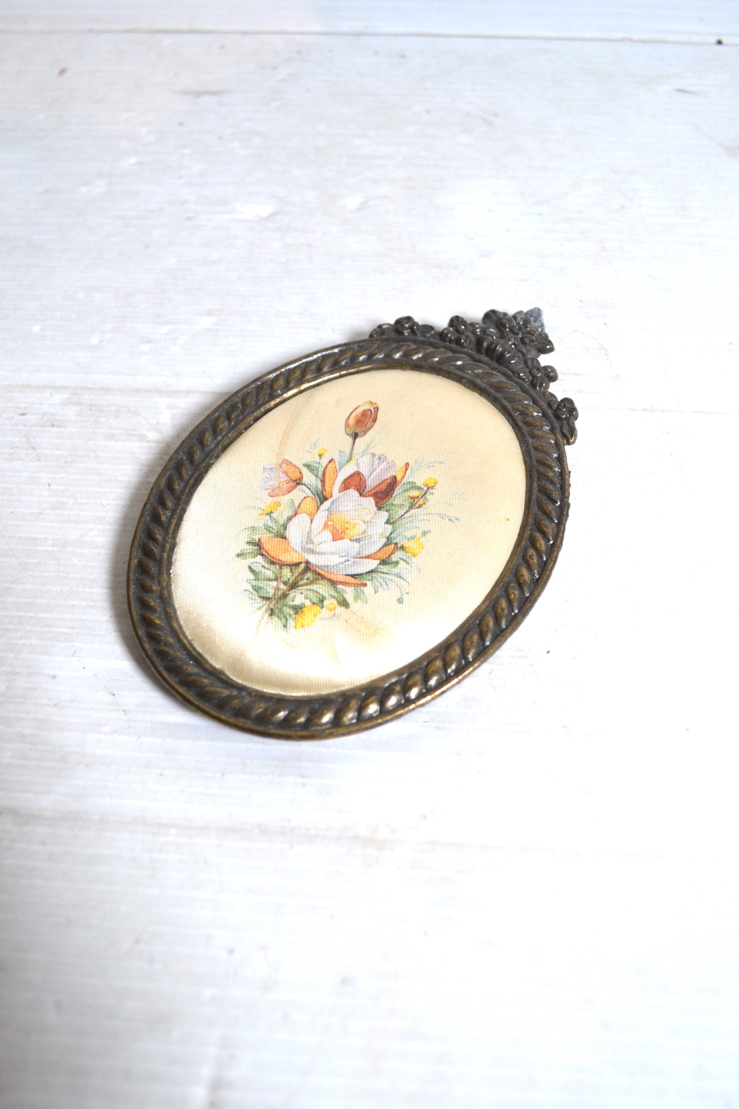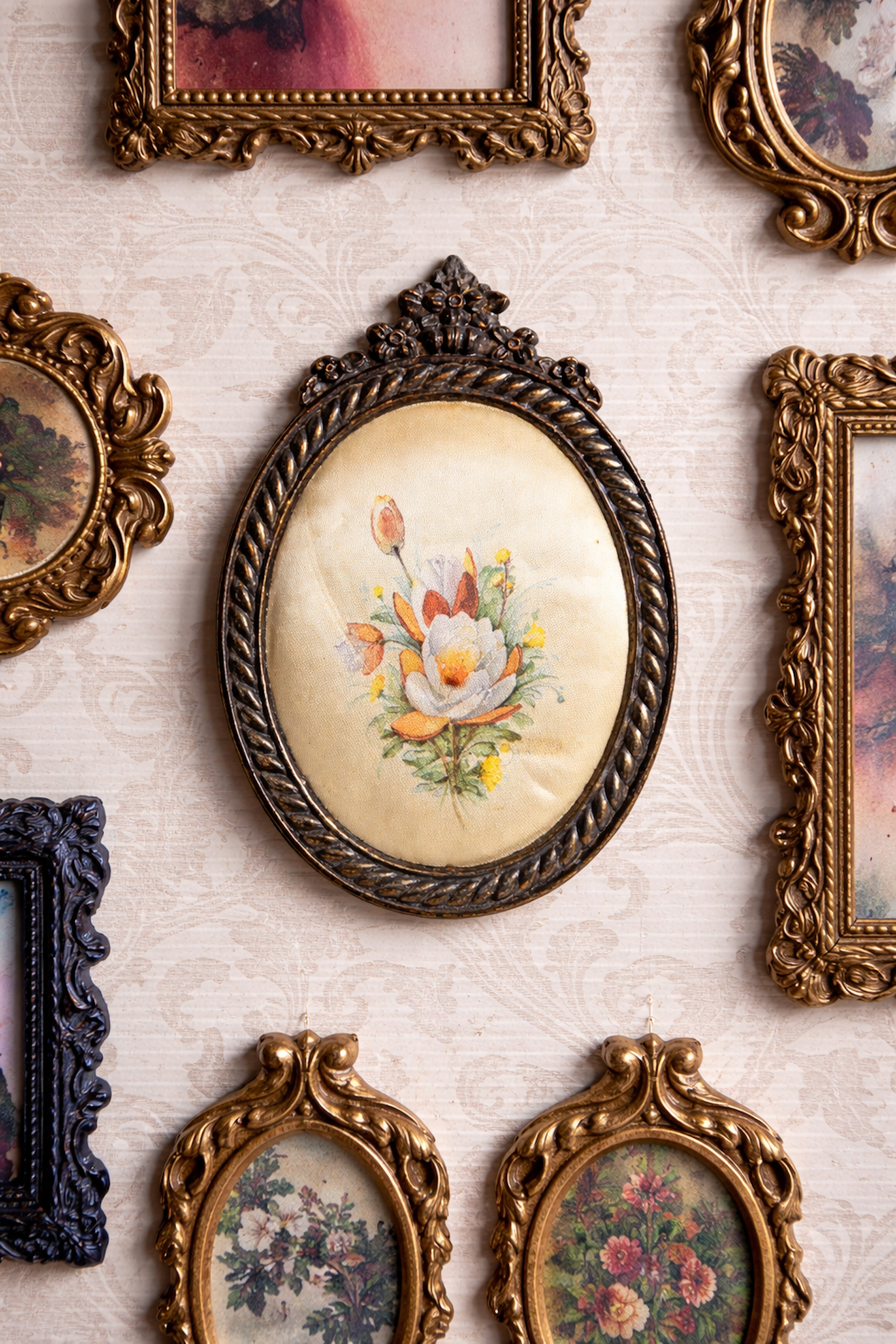 Joli cadre vintage de forme ovale renfermant une peinture botanique sur soie. On le suspendra avec d'autres cadres dans une accumulation murale de cadres et de tableaux dans un esprit baroque , bondieuseries ou Shabby Chic !