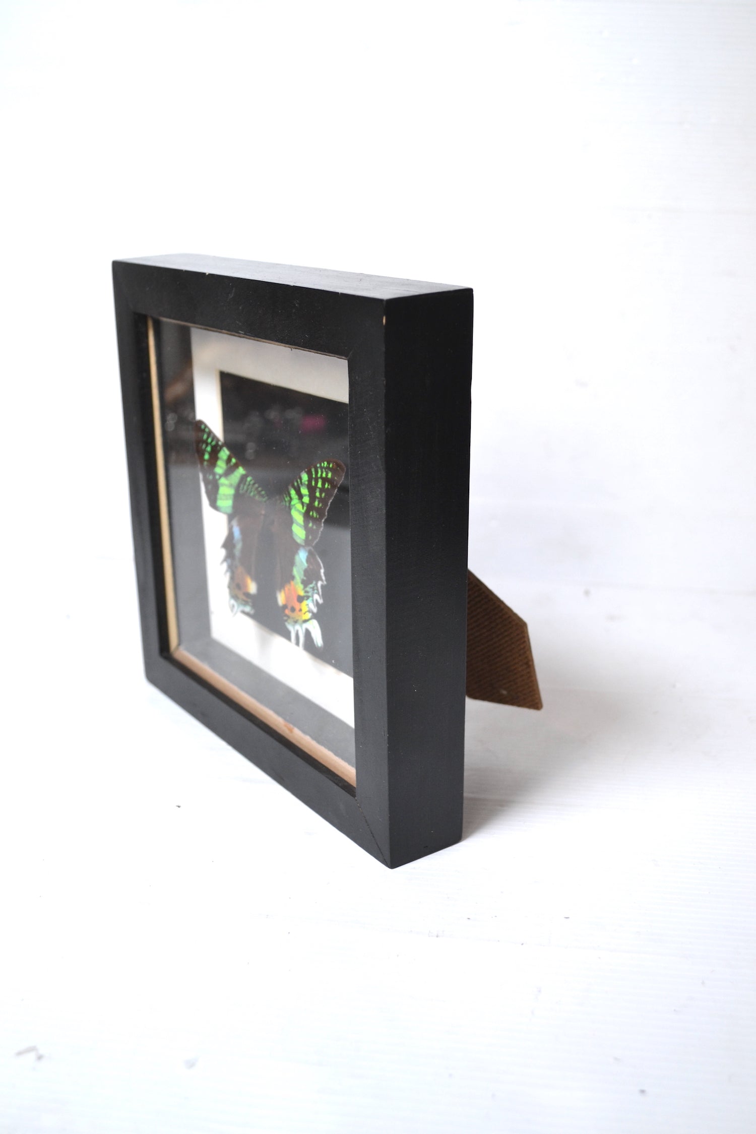 Ce formidable cadre renferme un véritable papillon Uranie. Ce cadre se distingue par son entourage noir contrastant agréablement avec les ailes colorées du papillon.