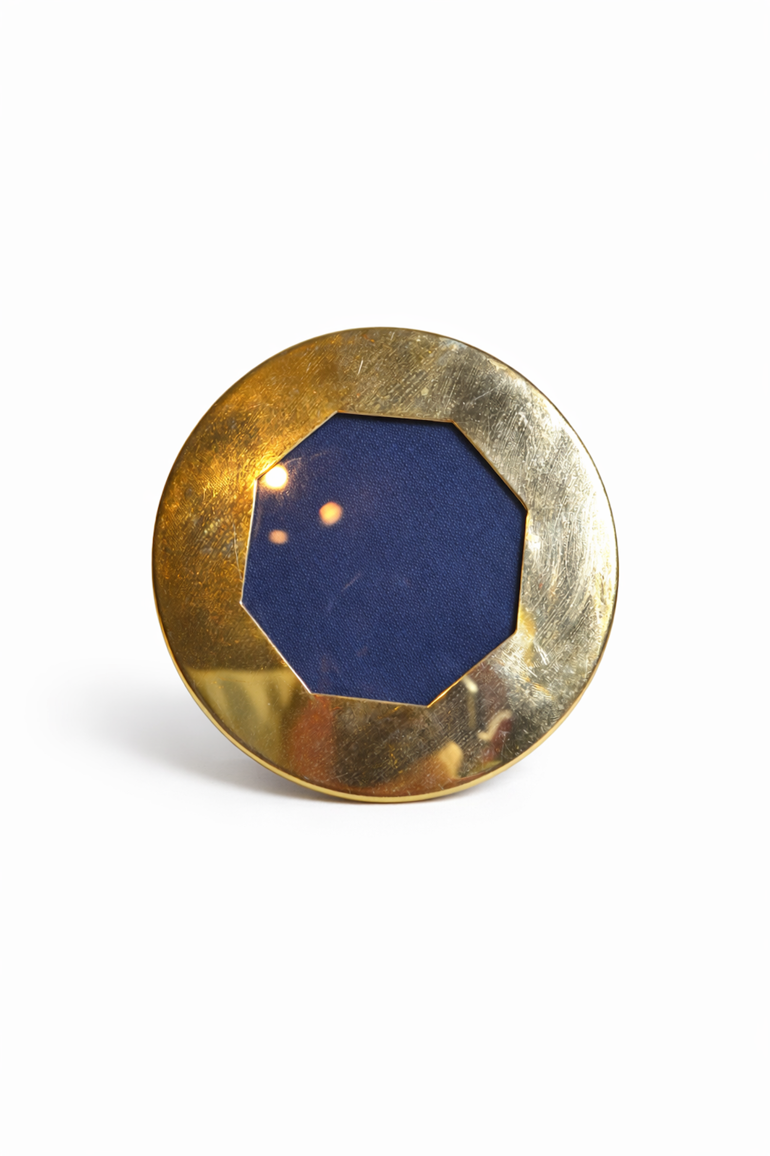 Joli cadre rond en laiton avec ouverture octogonale. Un joli cadre à poser design et lumineux. On le posera sur une table de chevet ou sur un buffet parisien en association avec d'autres cadres dorés !
