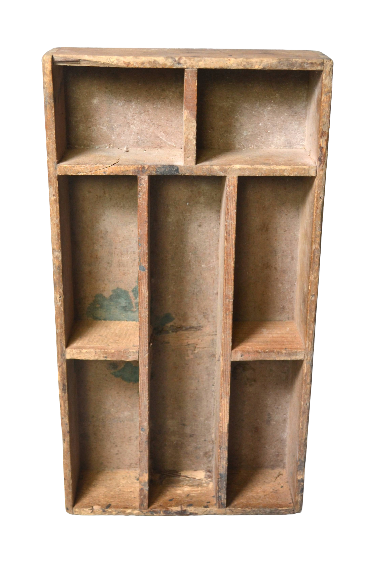 Ce joli casier vintage en bois se compose de 7 compartiments de taille et de forme différente.