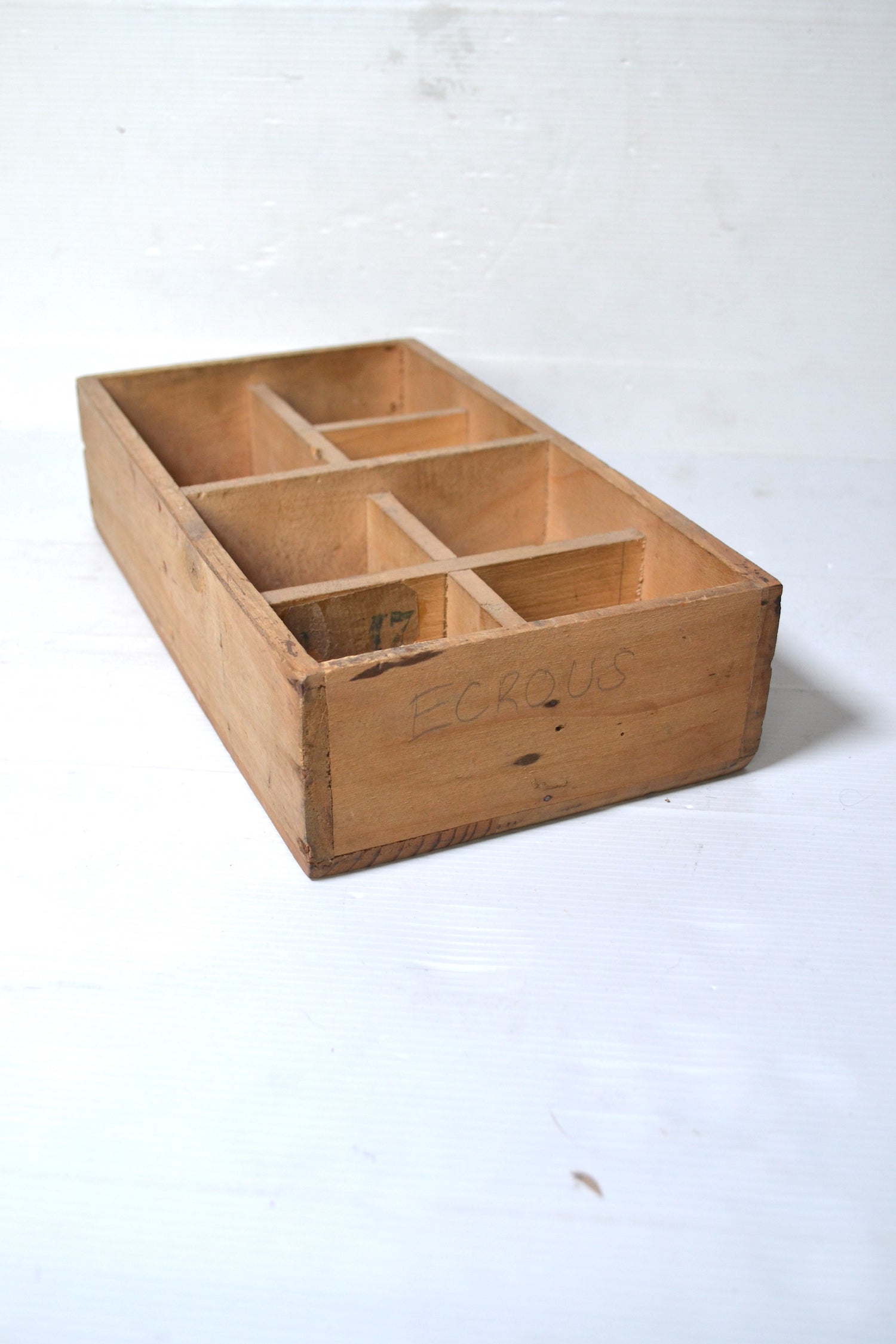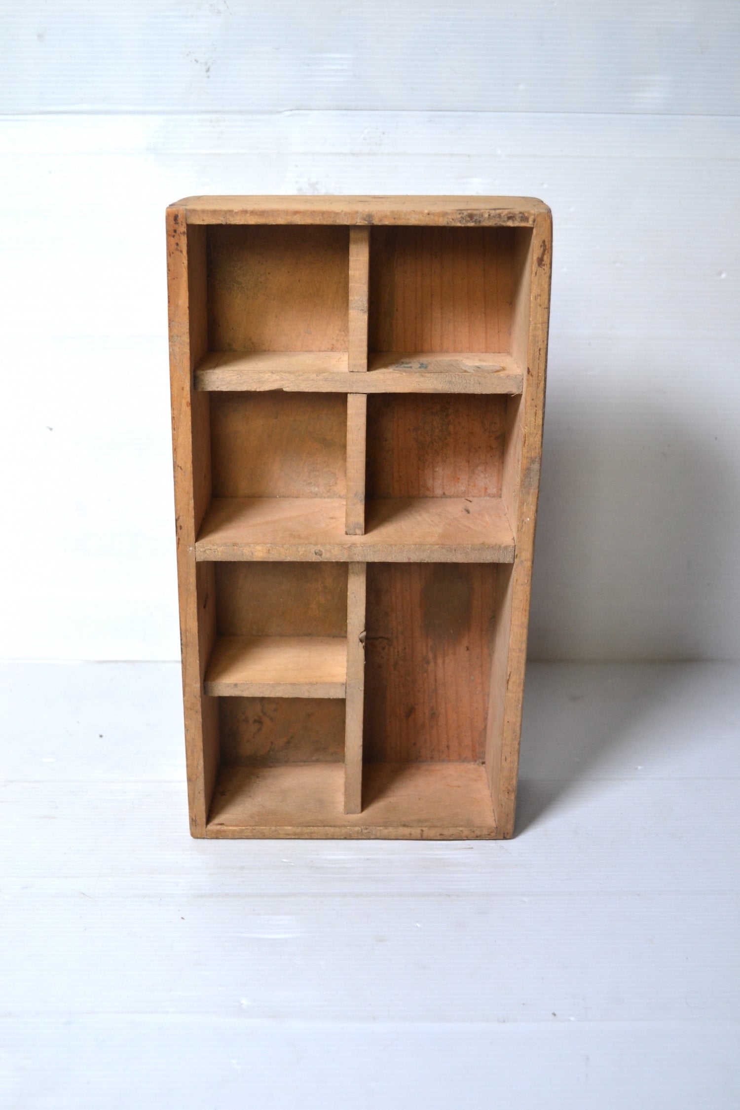 Ce joli casier vintage en bois se compose de 7 compartiments de taille et de forme différente.