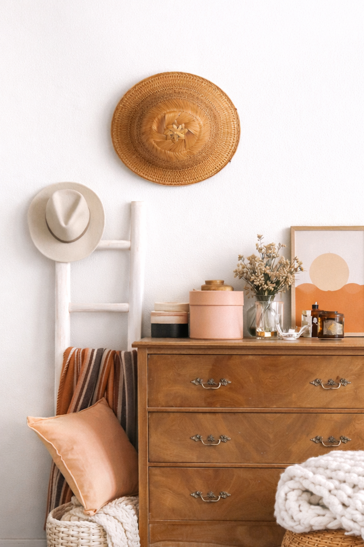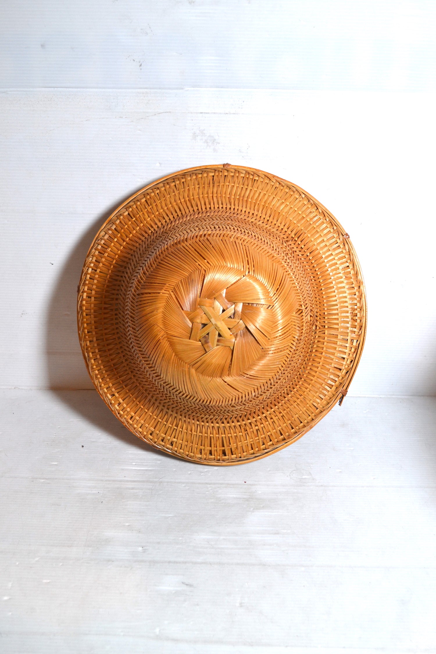 Très joli chapeau en osier tressé et bambou idéal pour apporter une note exotique dans une décoration d'esprit bohème.