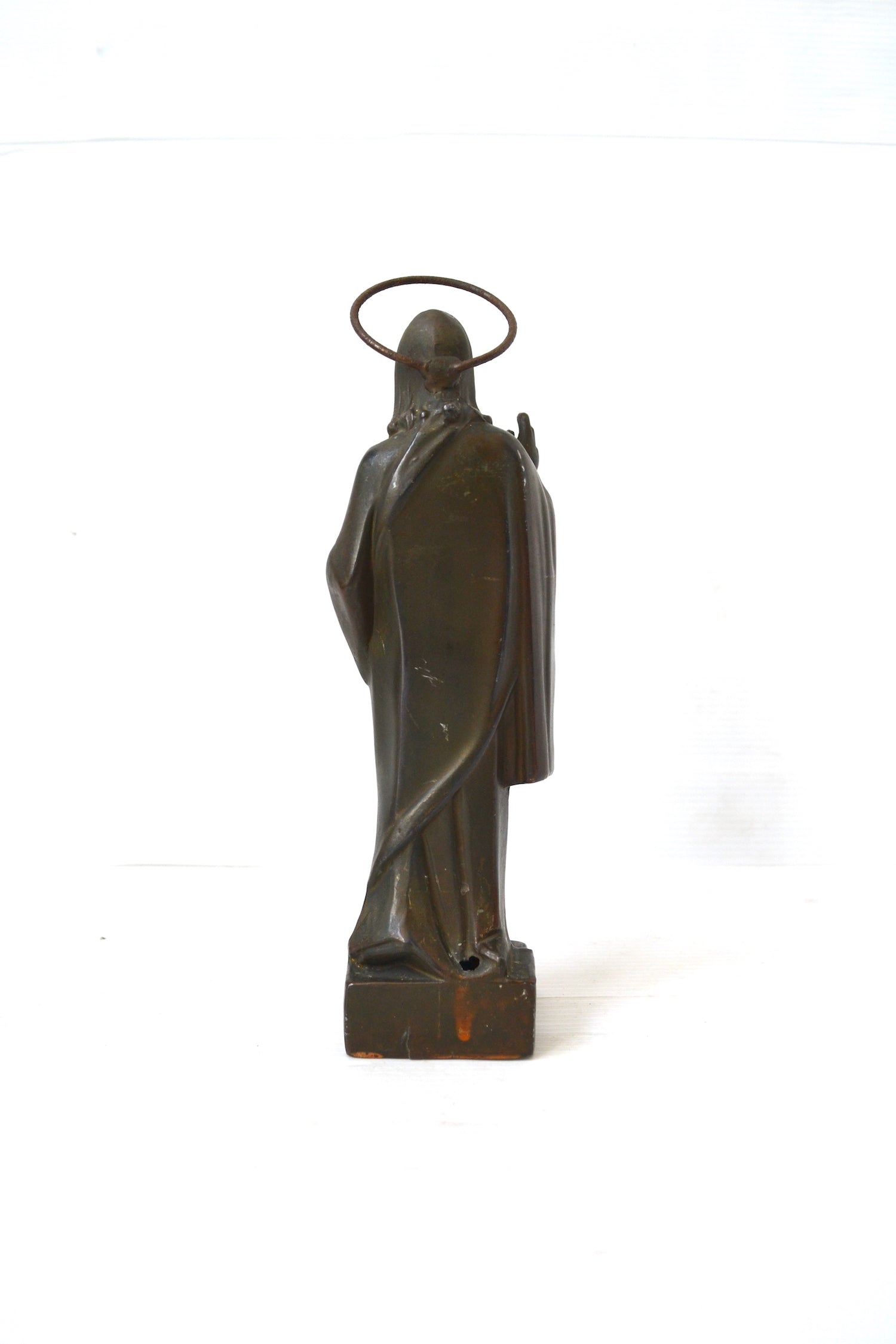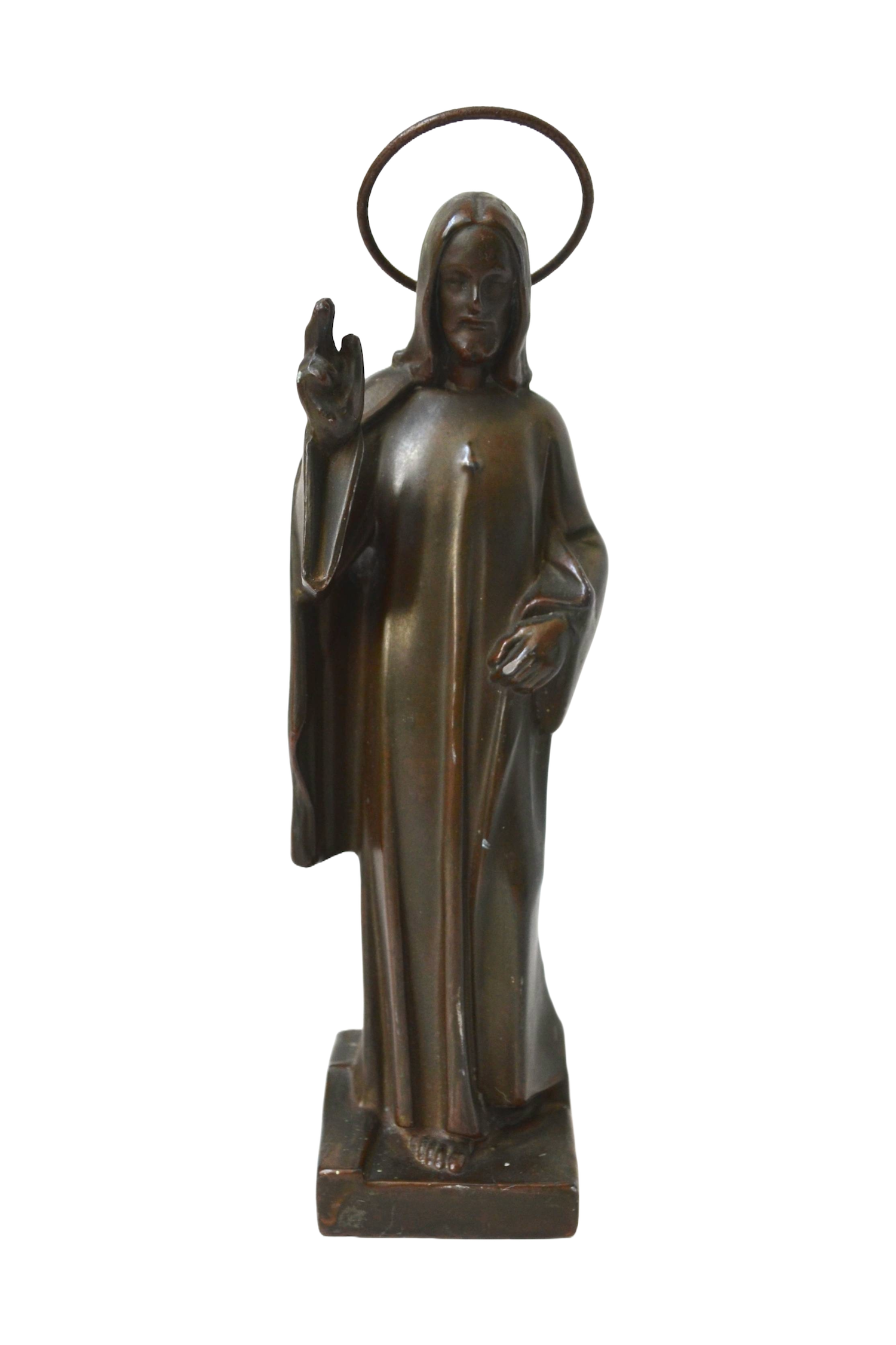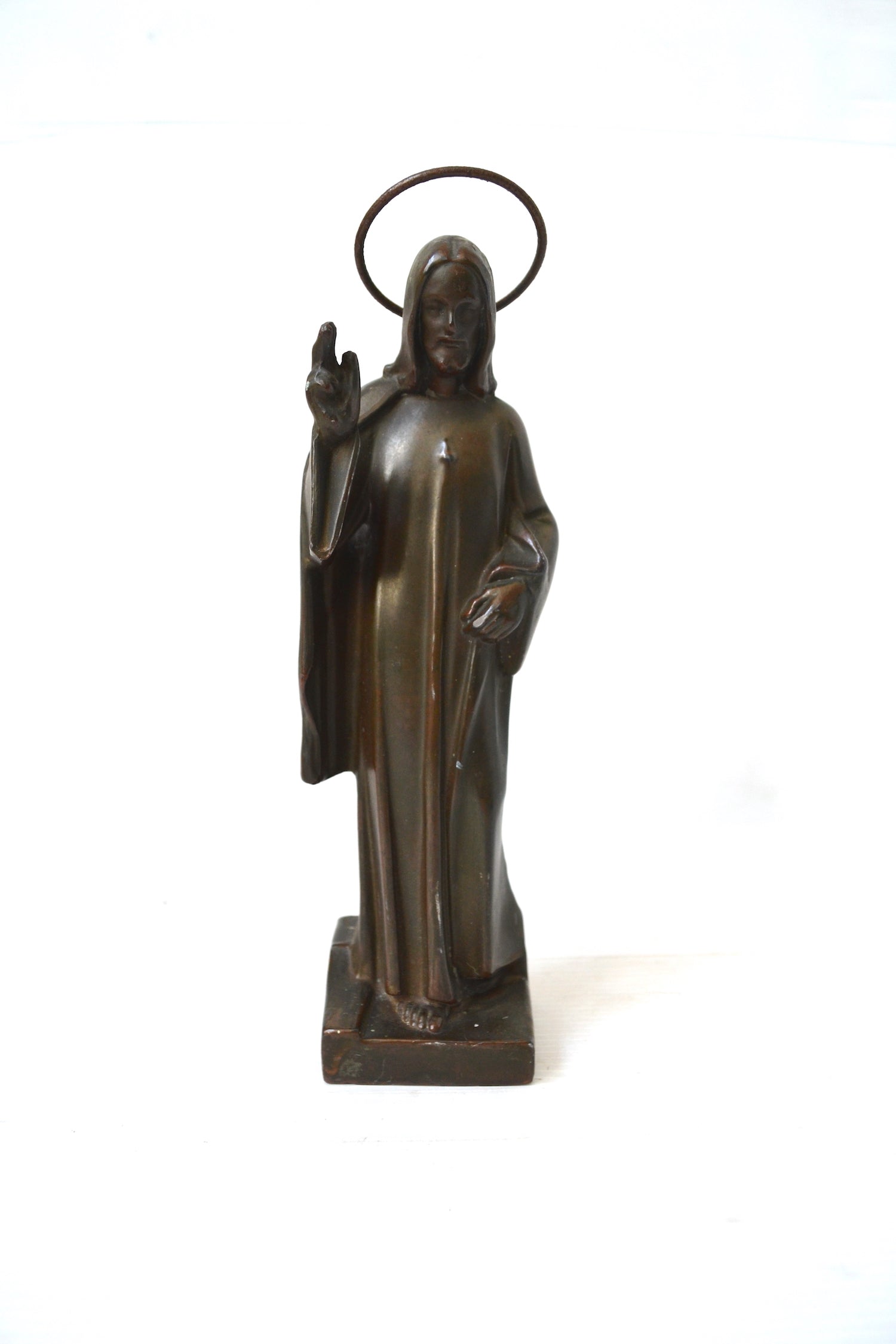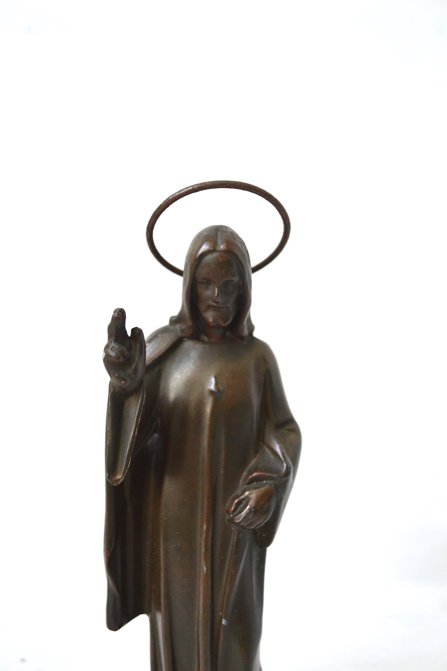 Cette très jolie figurine vintage en régule représente le Christ. On apprécie tout particulièrement le détail de l'auréole.