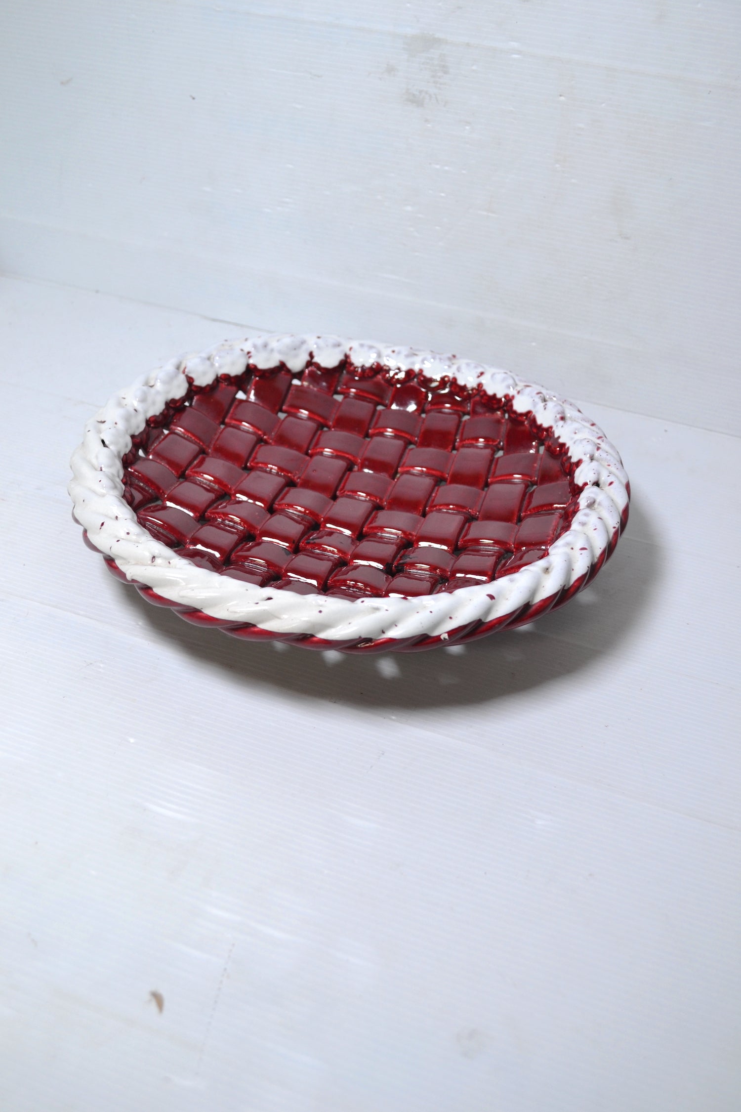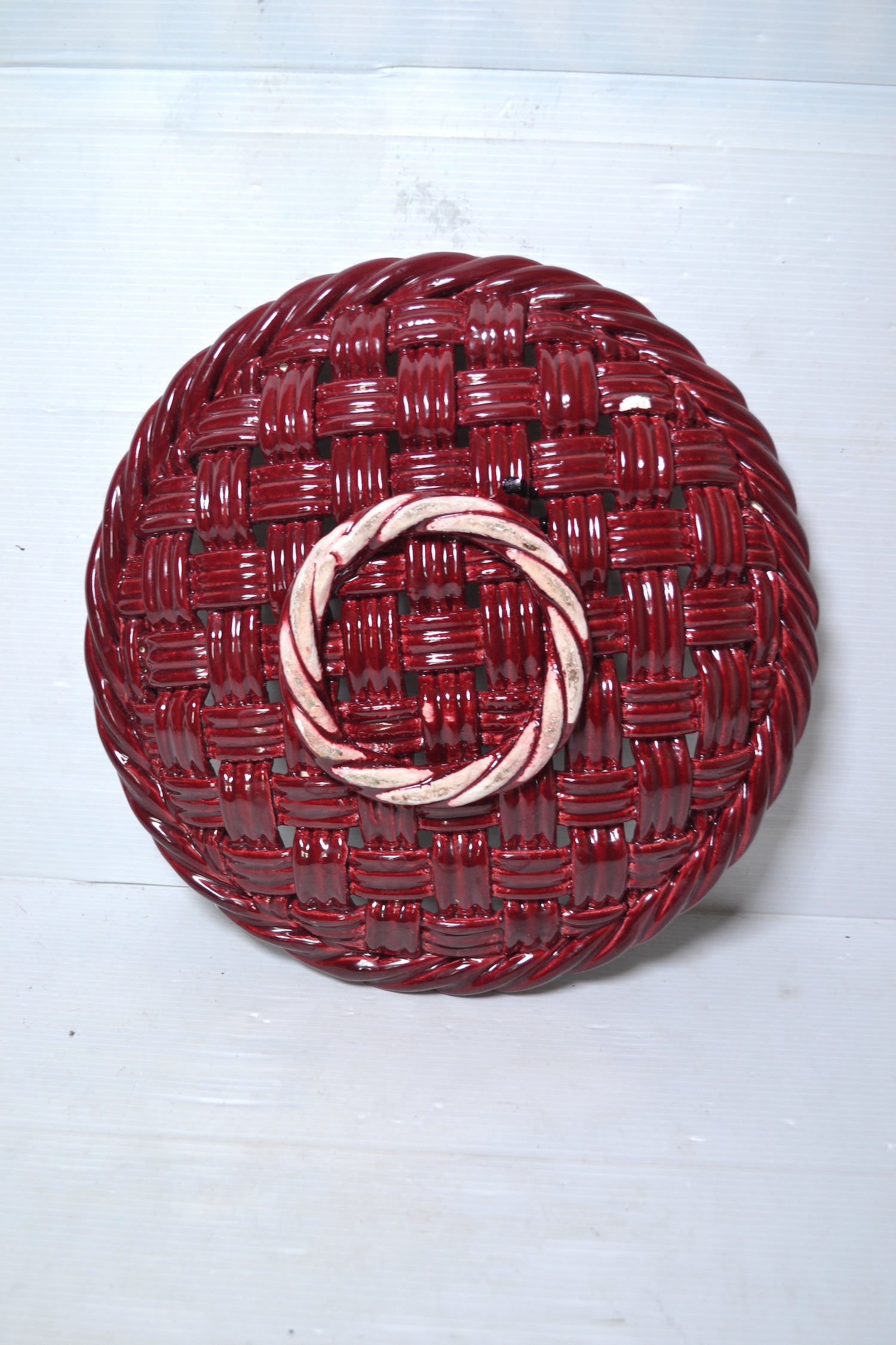 Magnifique corbeille à fruits vintage en céramique tressée coloris bordeaux et blanc