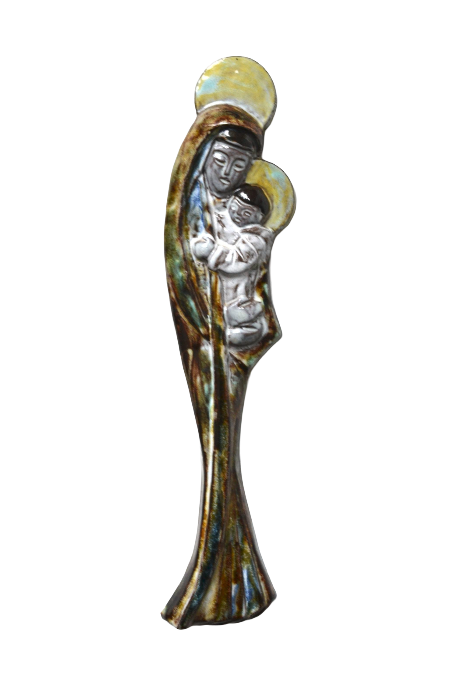 Cette superbe vierge à l'enfant tout en verticalité est une superbe sculpture décorative en céramique émaillée. Elle se distingue par sa douceur, sa poésie, la richesse de ses détails et par ses sublimes couleurs.