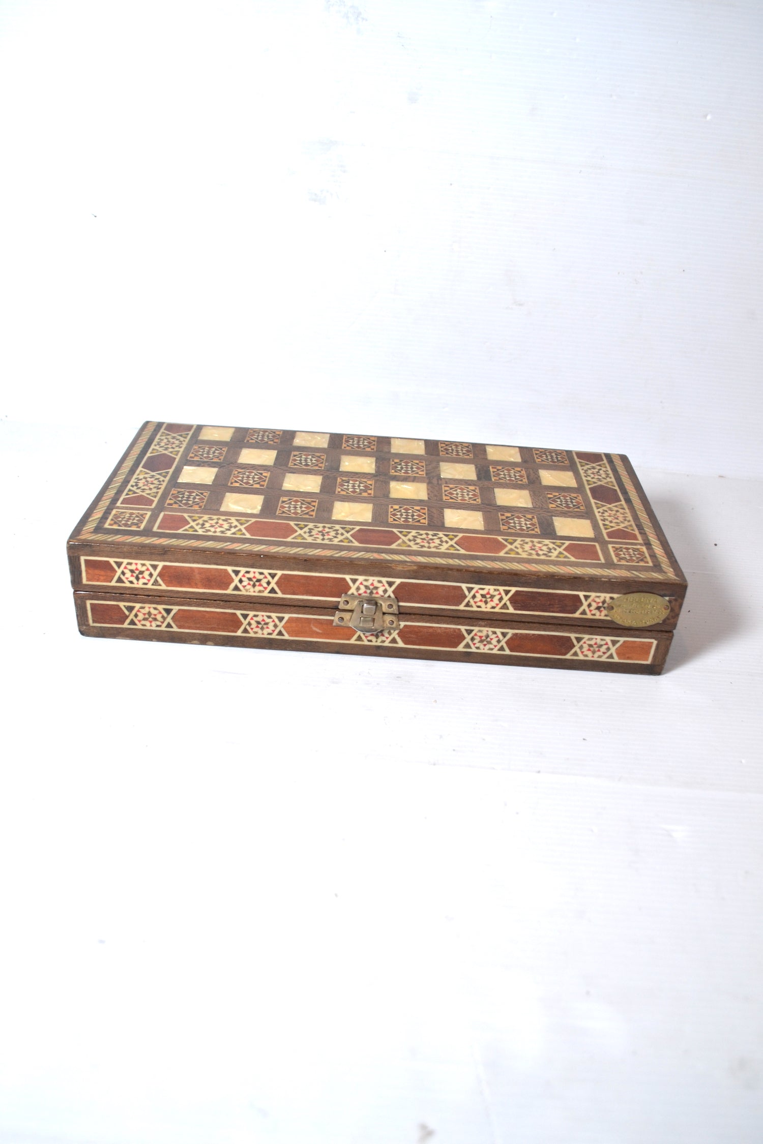 Un très joli jeu en marqueterie qu'on utilisera pour affronter un adversaire lors de l'apéritif ou en hiver auprès du feu. On pourra également y jouer aux échecs et aux dames Un cadeau parfait pour les amateurs de jeux traditionnels, de beaux objets ou de décoration vintage. À exposer fièrement ou à utiliser lors de vos soirées jeux.