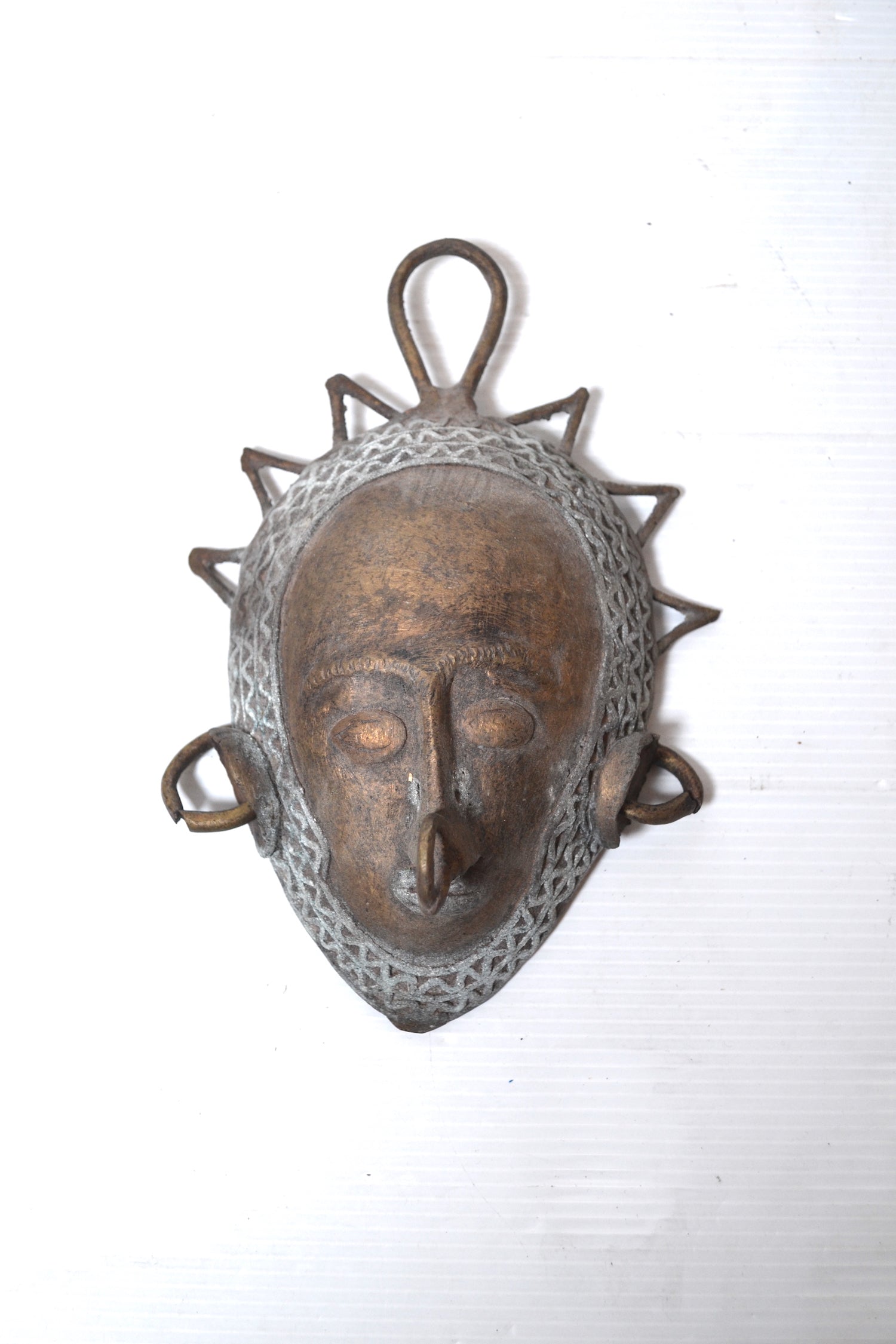 Cet exceptionnel masque africain en bronze se démarque par la grande richesse de ses détails et de ses ornements. Cette sculpture artistique propose ainsi un visage stylisé en relief d'une grande beauté et d'un élégant graphisme. On apprécie tout particulièrement les boucles d'oreille du personnage ainsi que son expression épurée et graphique