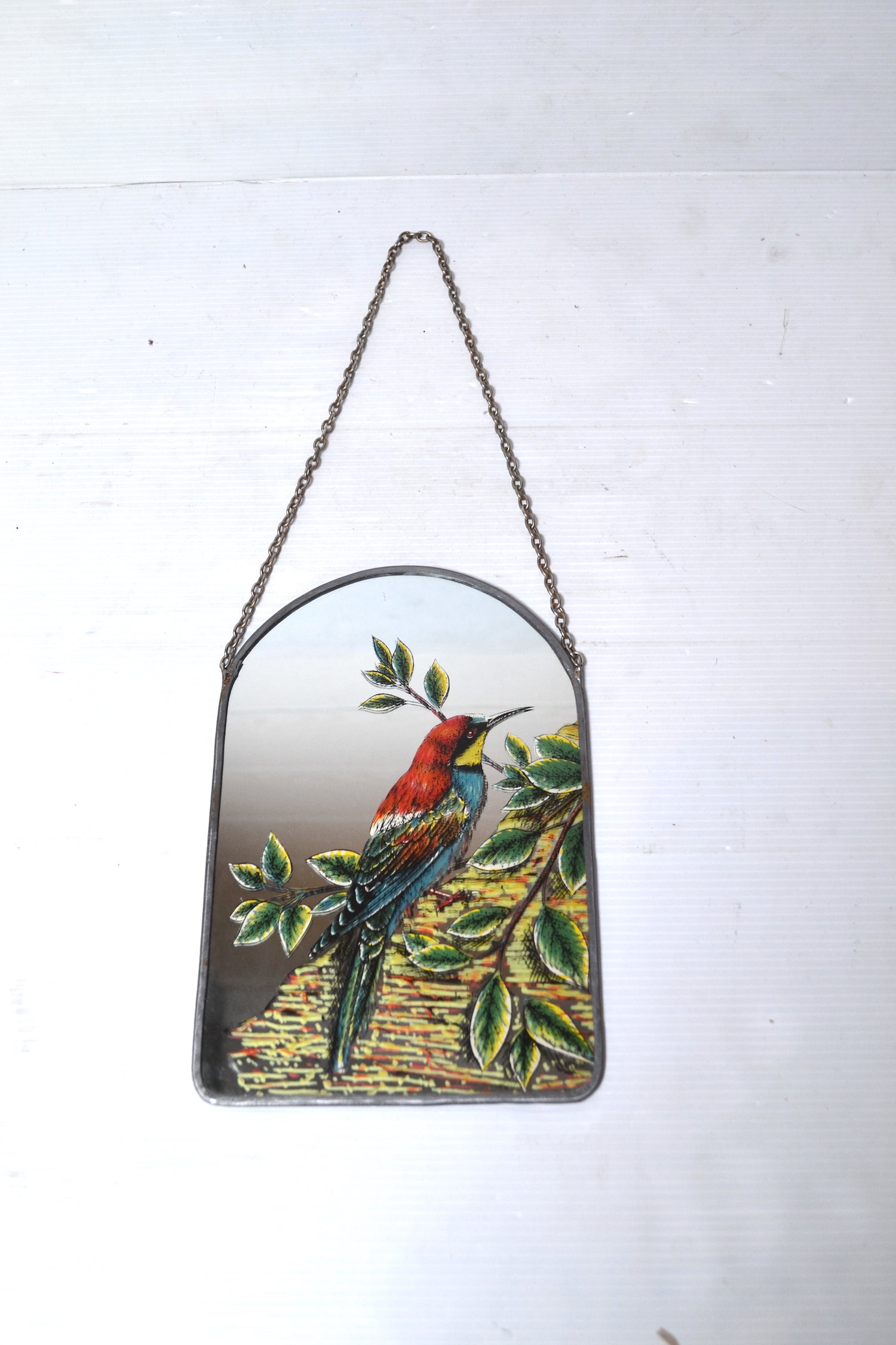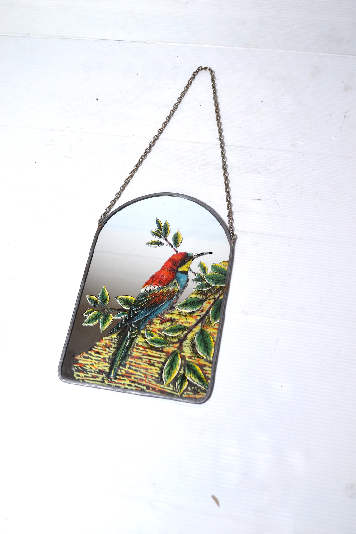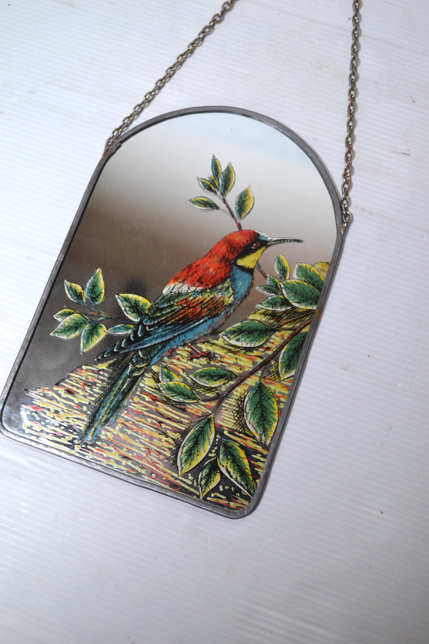 Ce joli petit miroir atypique se compose d'une glace sérigraphiée colorées et pleine de charme et d'une jolie chainette en métal.