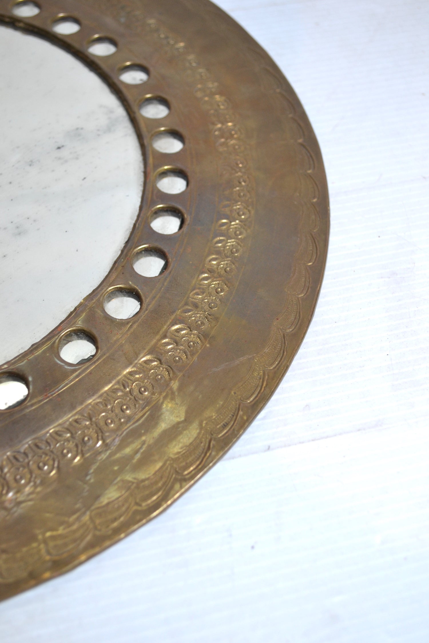 Superbe miroir marocain de forme circulaire. Un joli miroir en cuivre doré à la glace patinée par le temps idéal pour apporter une note de caractère à sa décoration d'intérieur. Un joli miroir à associer à d'autres miroirs de taille de forme différente pour un bel effet d'accumulation !