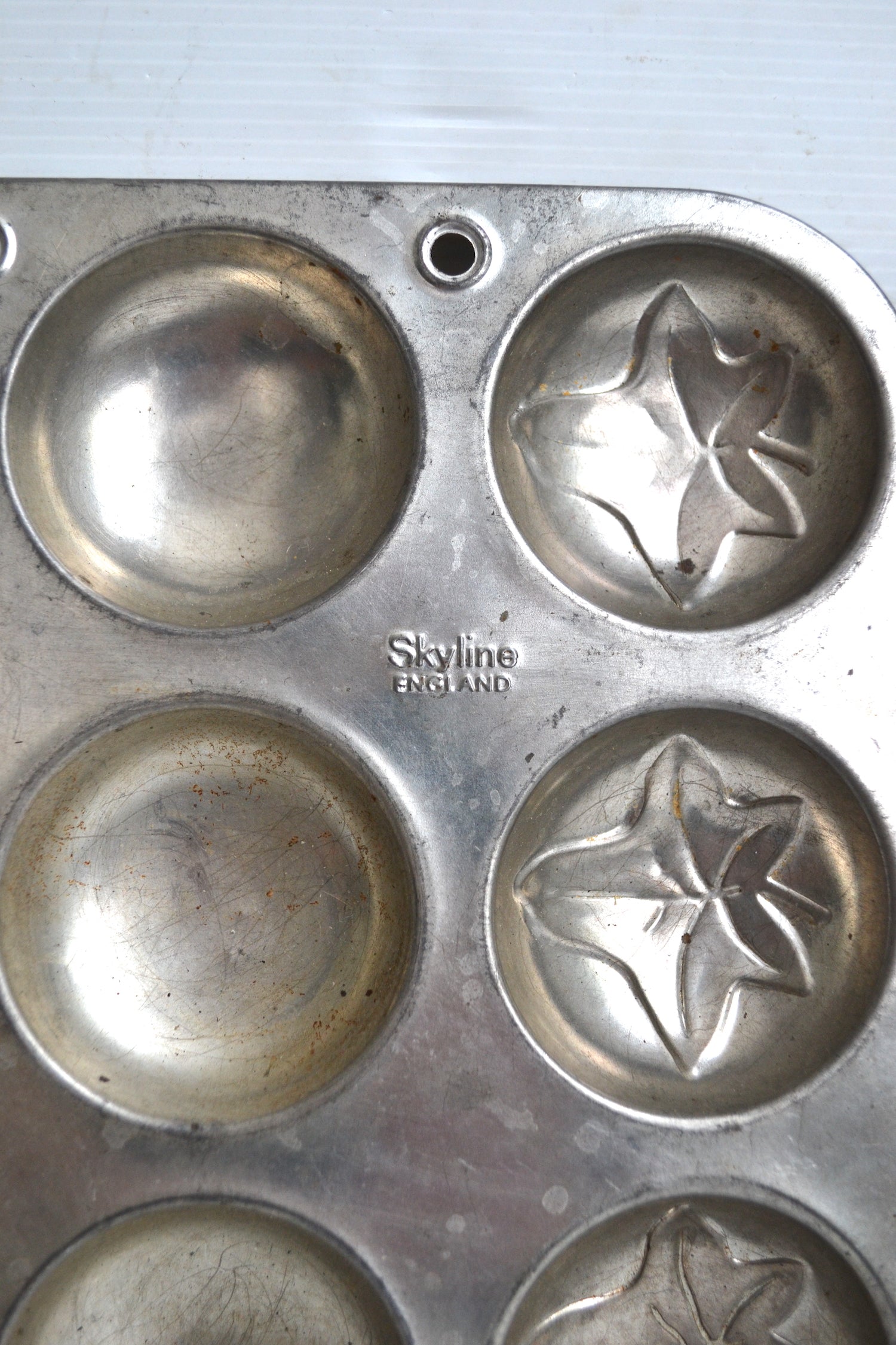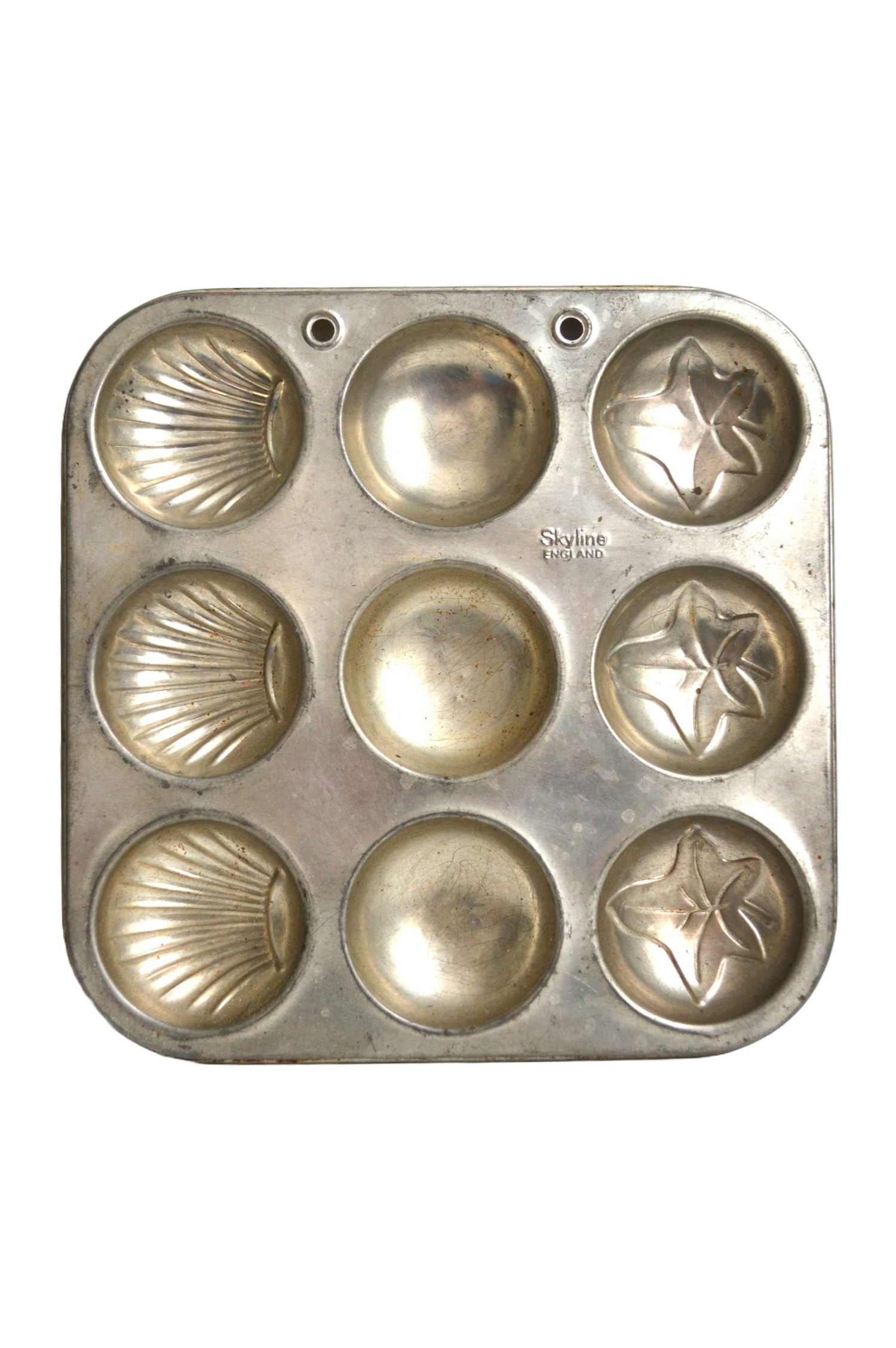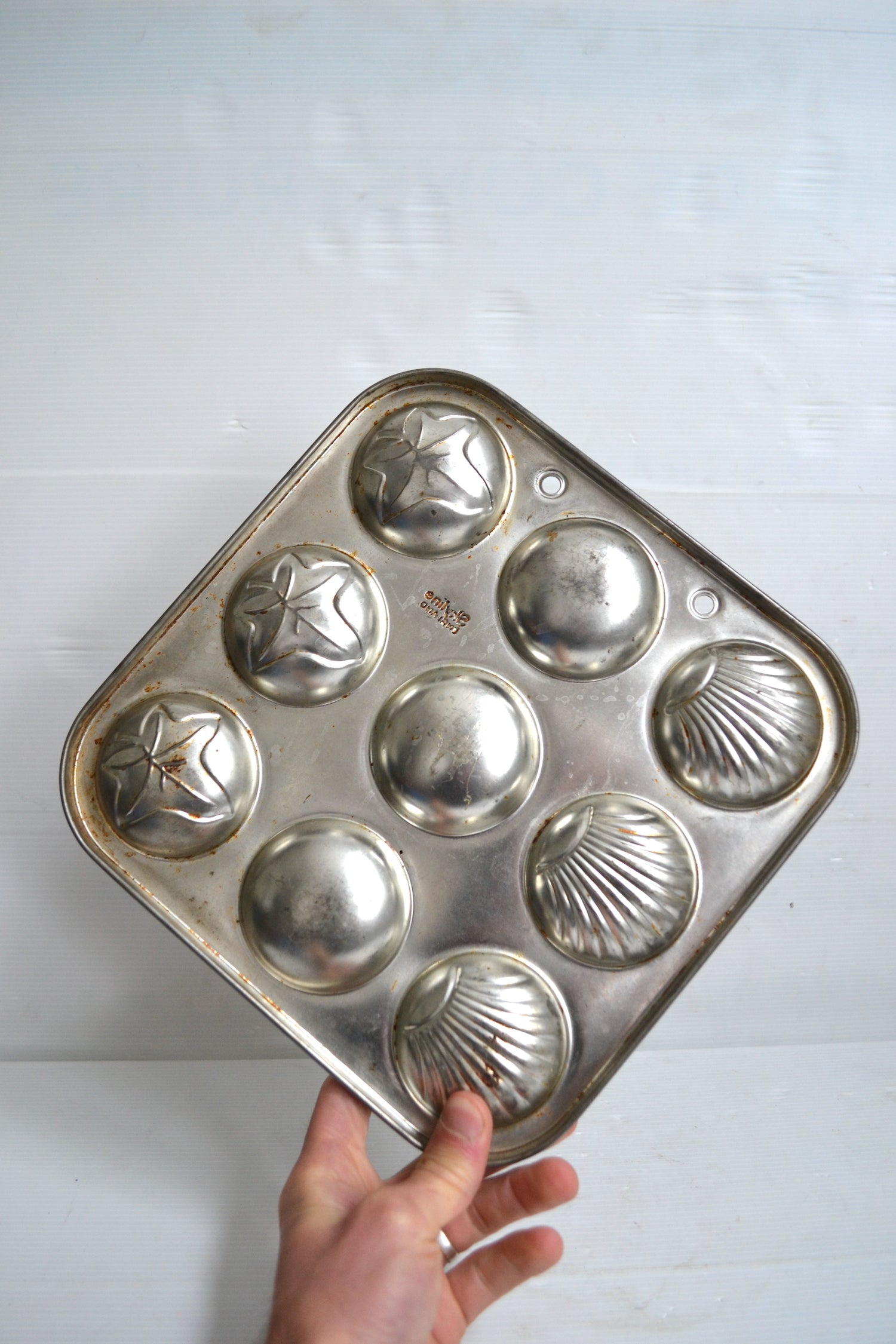 Ce curieux moule vintage se démarque par ses jolis motifs en forme de coquilles- Saint-Jacques et de feuilles de lierre.