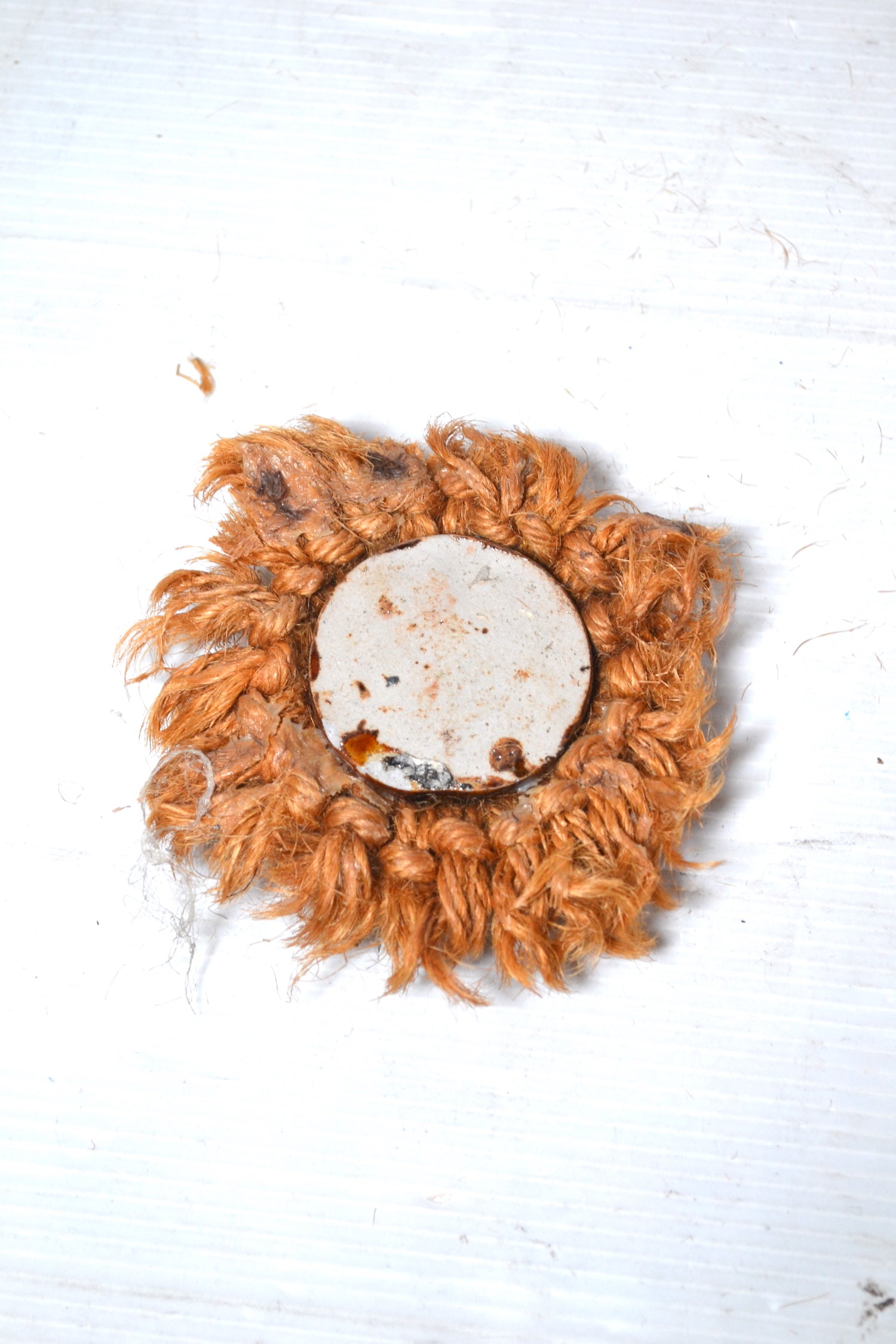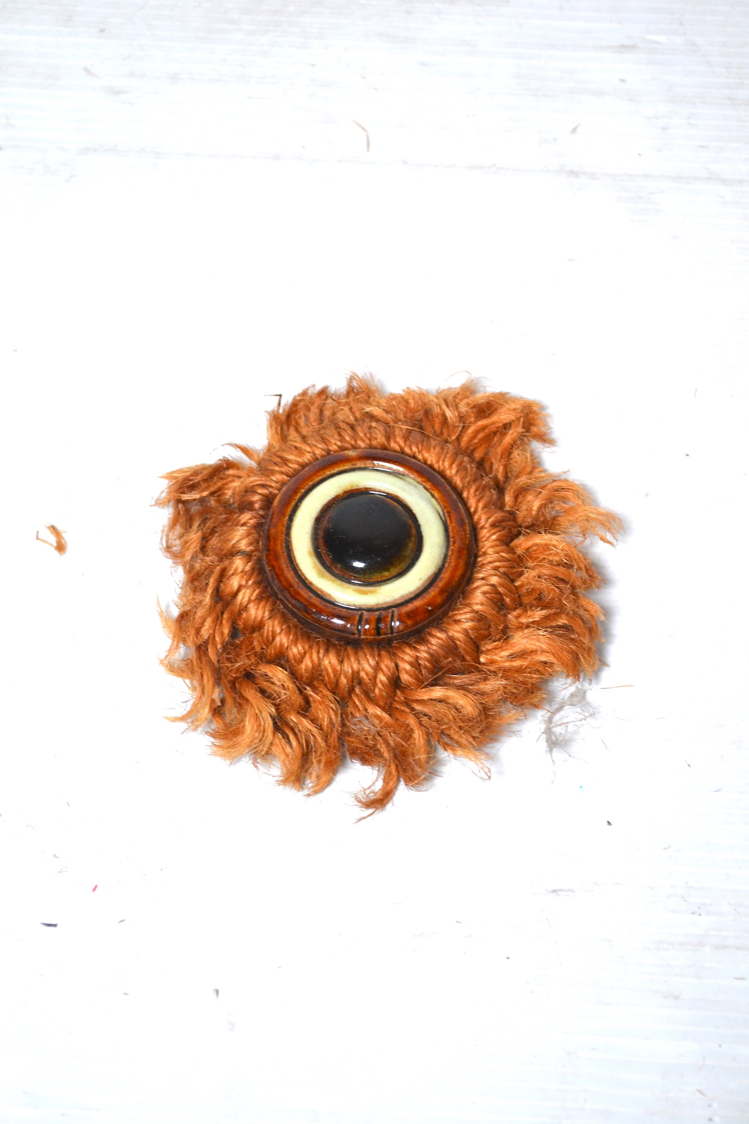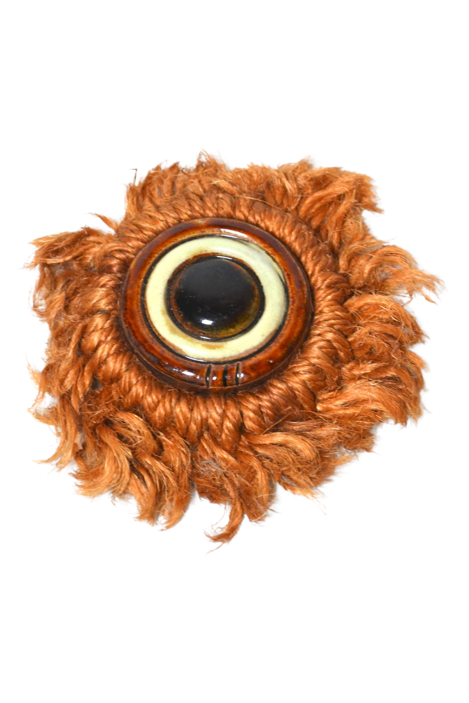 Superbe ornement décoratif en céramique et corde tressé en forme d'œil ou de cible. Un bel élément décoratif qu'on pourrait utiliser comme décoration murale originale. Une belle astuce déco consistera à positionner cet objet dans un mur de curiosités !