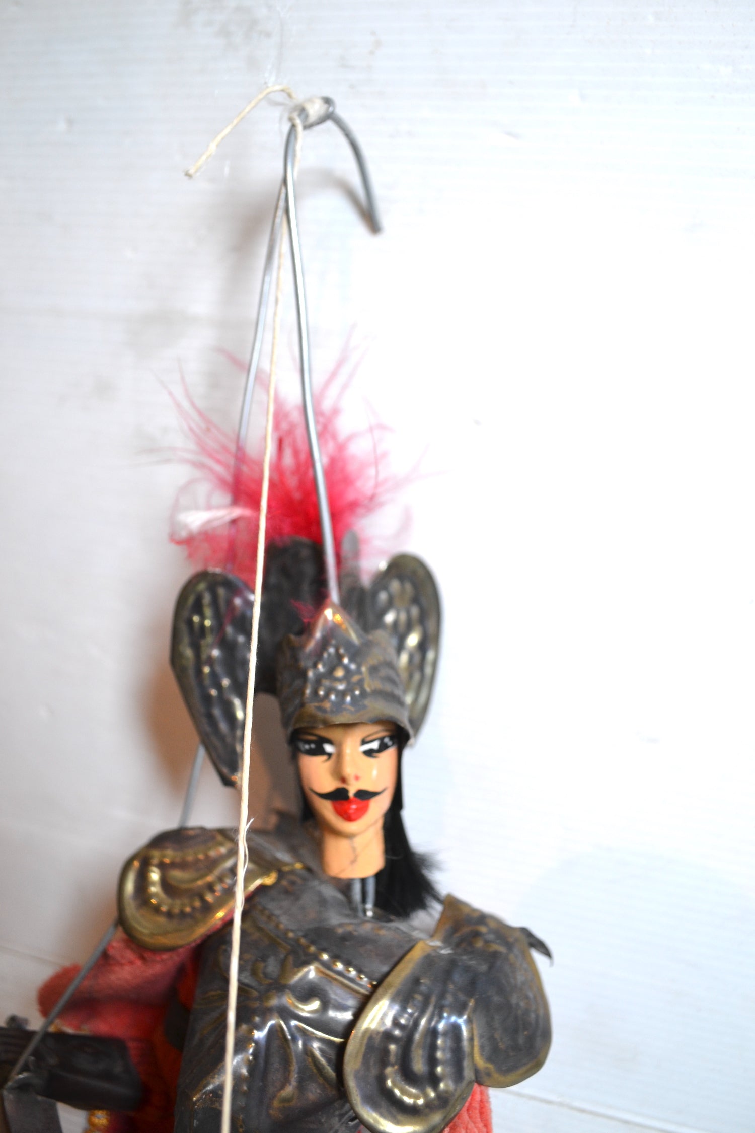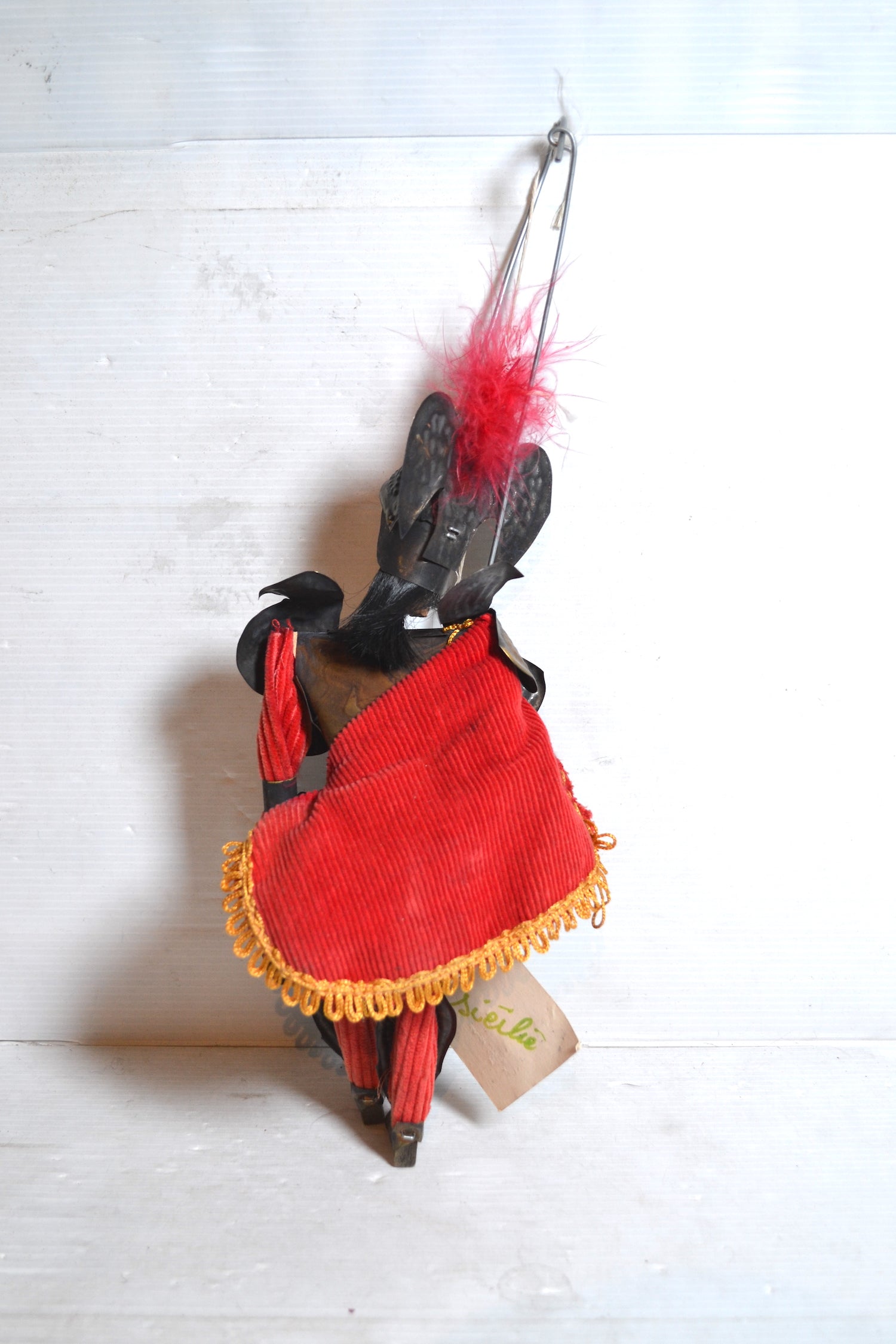 Joli pantin italien en bois et plaques de cuivre. Un élégant jouet vintage à utiliser pour distraire un enfant ou à placer dans une collection ! L'épée et le bouclier bougent manuellement grâce à une ficelle et une tige de métal