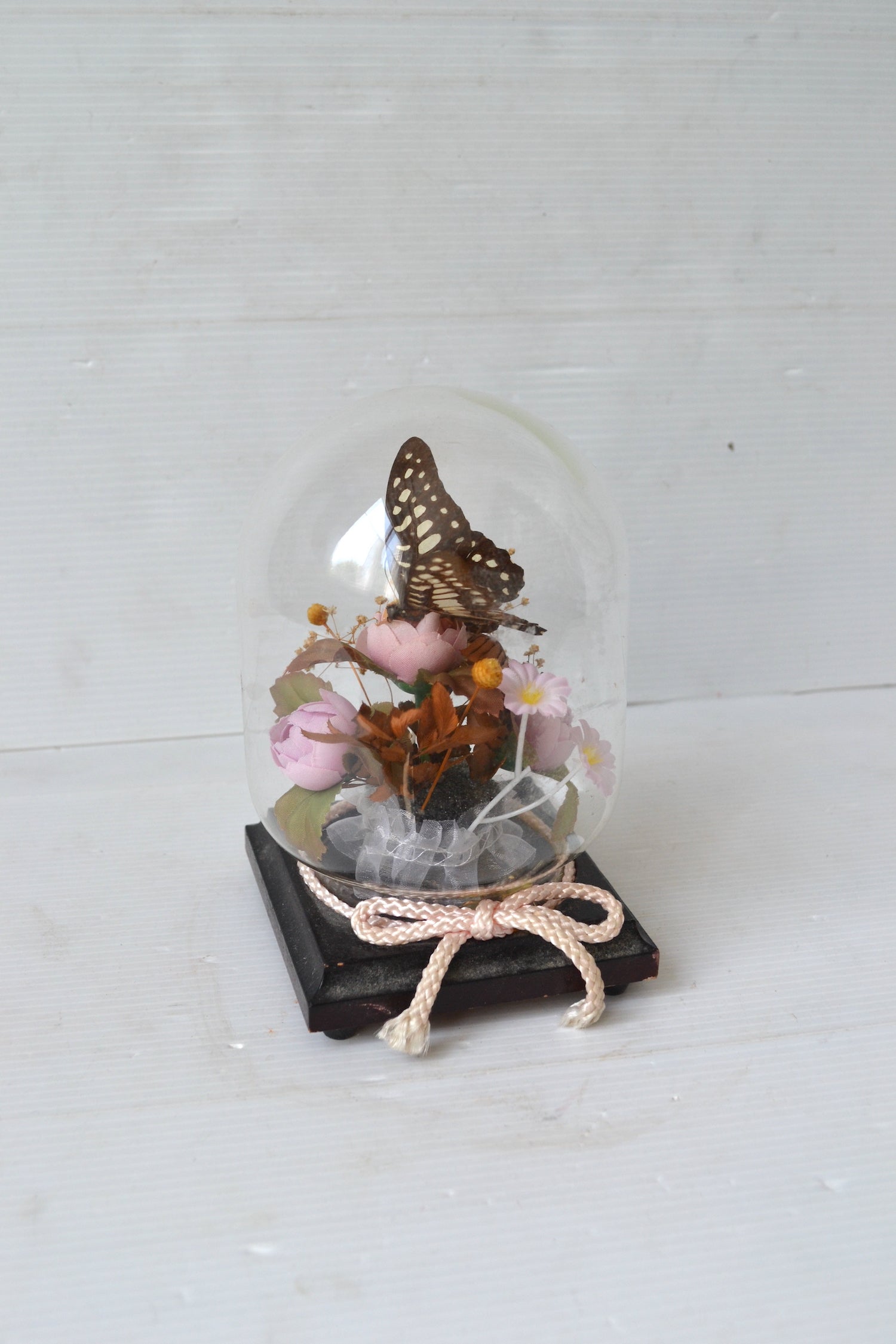 Ce élégant objet décoratif se compose d'une bas en bois ainsi que d'une cloche en verre ornée d'un nœud en corde. La cloche renferme un véritable papillon naturalisé accompagné de fleurs artificielles et de fleurs séchées.