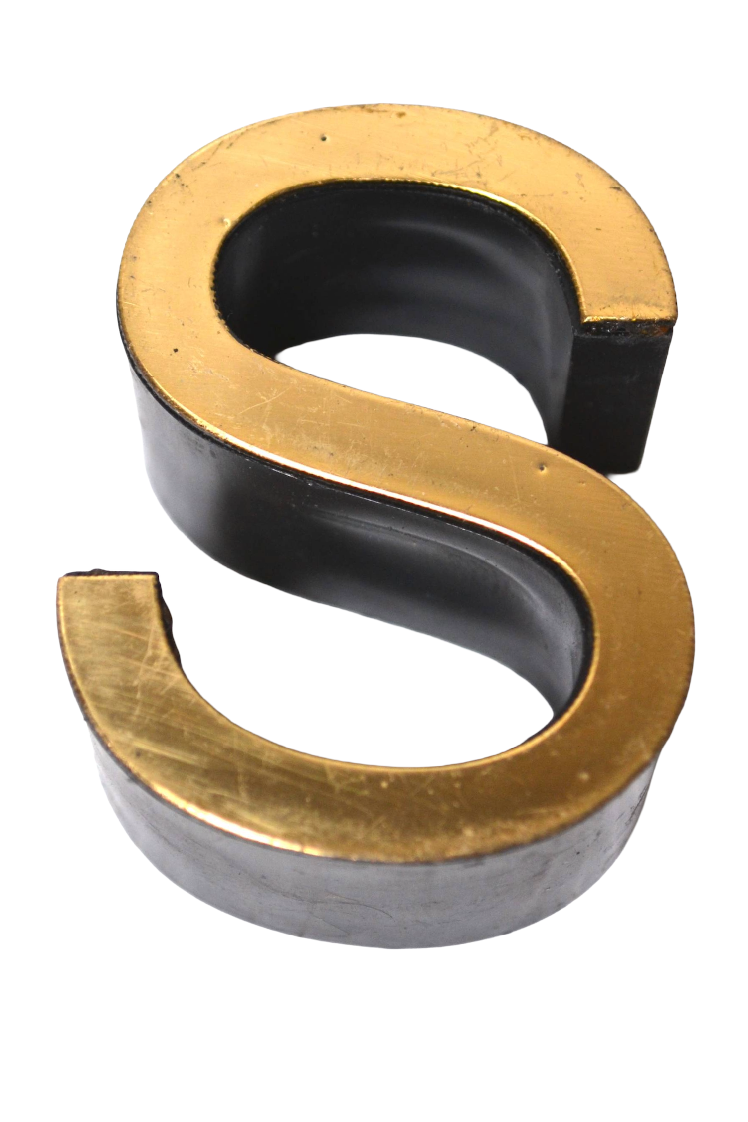 Cette jolie petite lettre décorative provenant d'une enseigne se compose d'une base en plastique noir et d'une facette en laiton doré. Une petite lettre décorative dorée qu'on posera sur un bureau, un buffet parisien ou dans un meuble bibliothèque. Une jolie lettre qu'on pourra également coller directement sur un mur. On s'amusera à créer un mot complet tout comme on pourrait former un nuage de lettres pour un bel effet graphique.