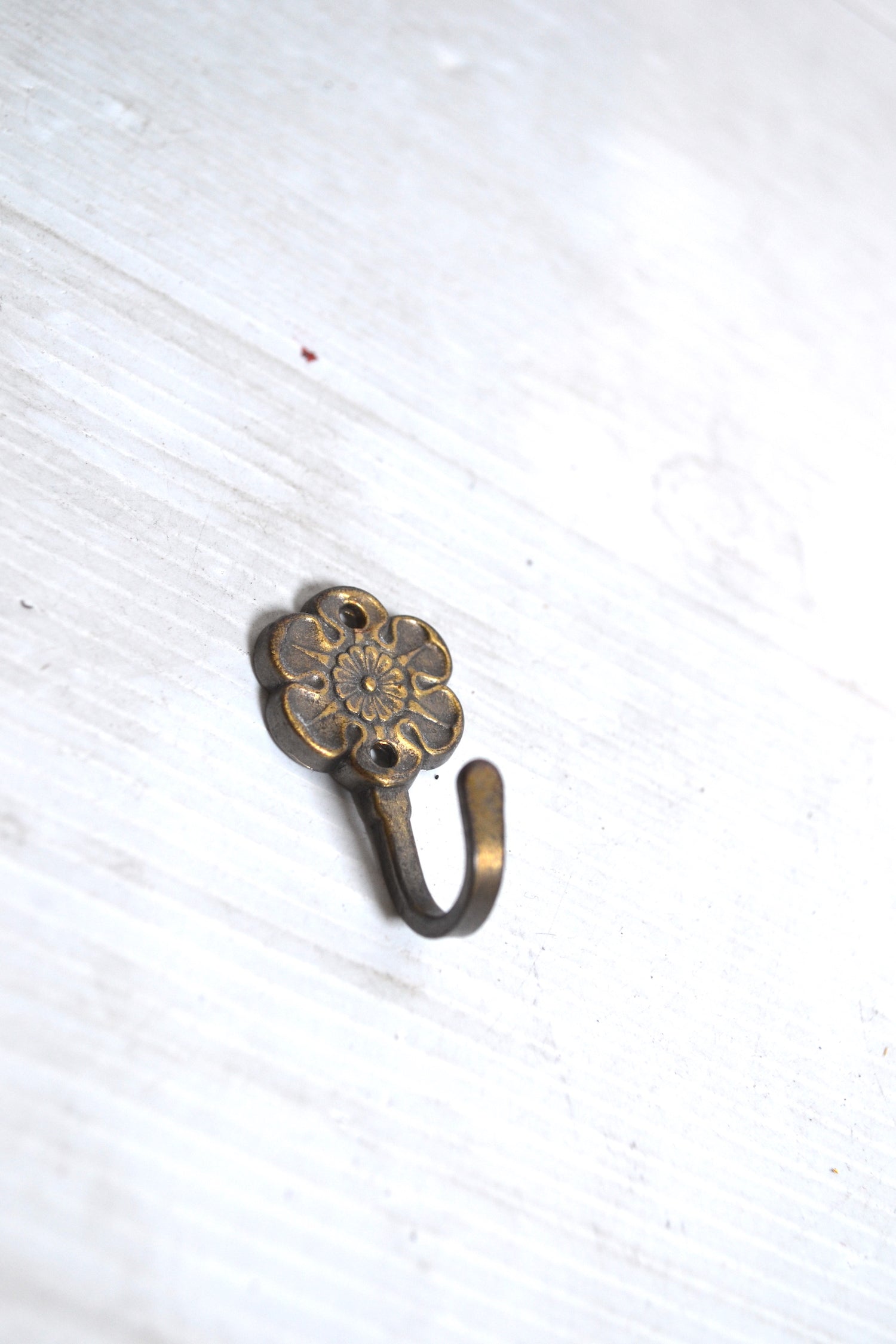 Très jolie petite patère murale vintage en forme de fleur. Un bel accessoire de rangement doré et lumineux idéal pour apporter une note de cachet à une salle de bain ou une cuisine.